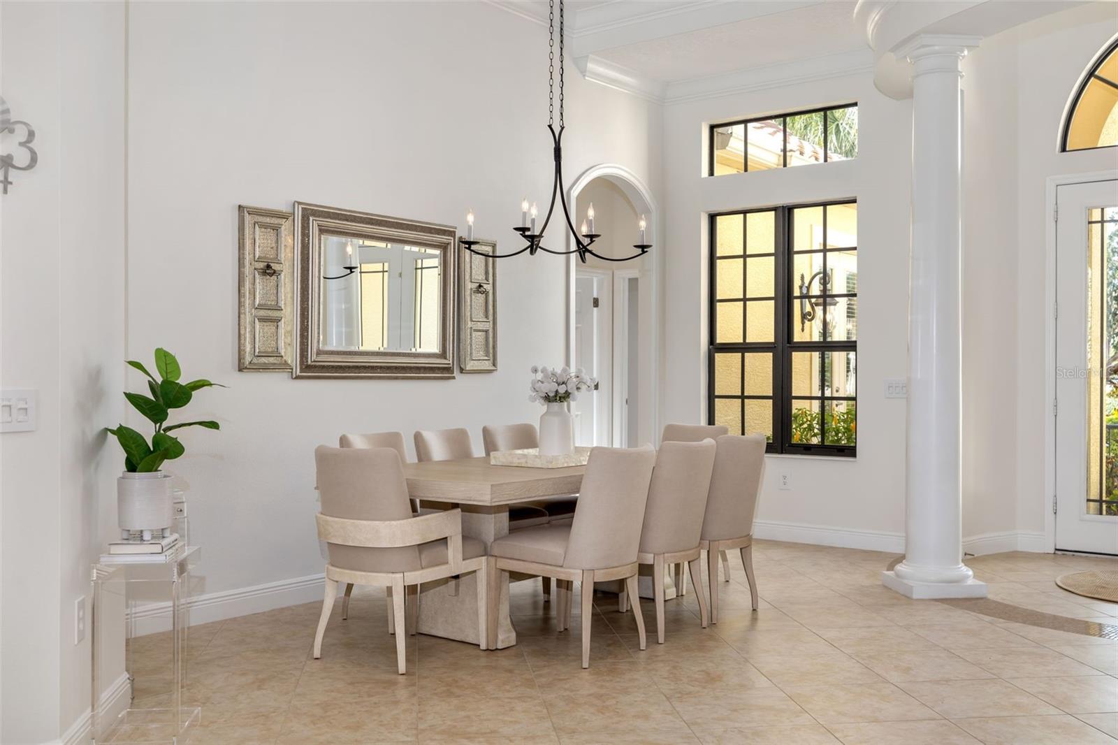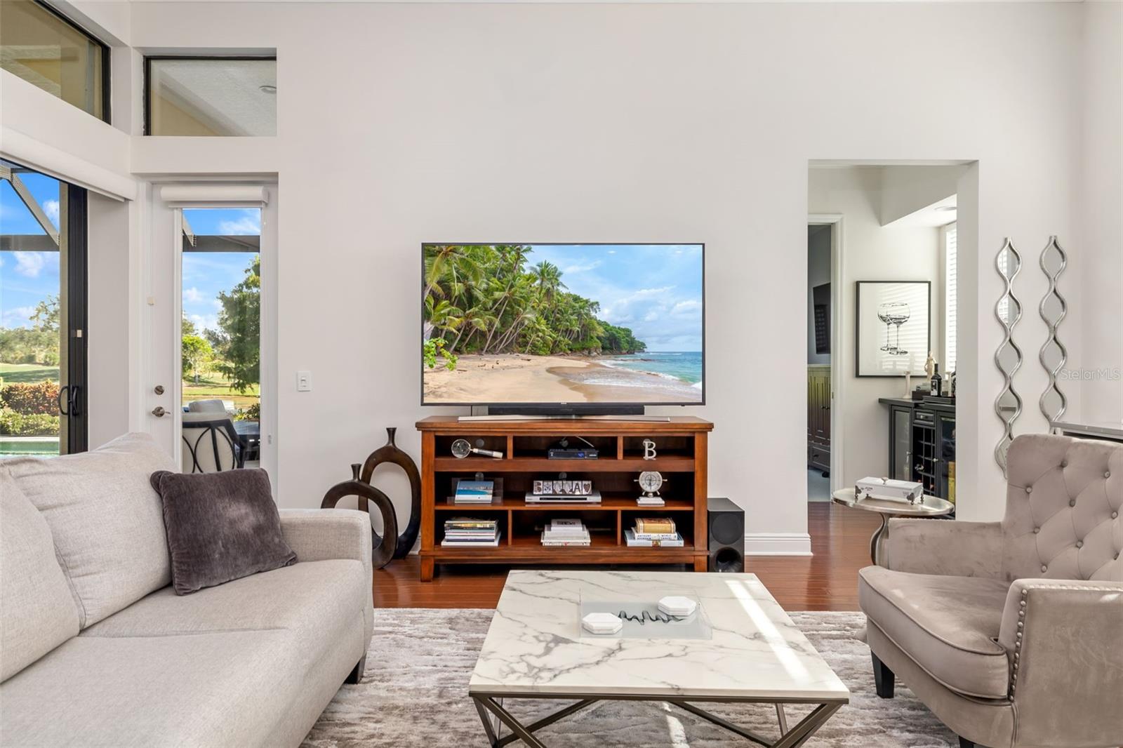 Welcome to your private oasis in the sought-after Lakewood Ranch Golf & Country Club, on Kings Dunes Hole #11. This elegant three-bedroom, three-bath home with a dedicated office offers panoramic 180-degree water and golf course views from the beautifully updated lanai. Go outside to enjoy resort-style living with a heated saltwater pool and spa, new panoramic screen enclosure (2021) and travertine tile flooring throughout the lanai. Entertain effortlessly with the outdoor kitchen, two spacious covered lounging areas and an outdoor shower, all oriented to take advantage of the gorgeous southern exposure. Inside, modern comfort meets timeless style. Soaring 12-foot ceilings in the living room, dining room and family room create a bright, open and elegant atmosphere. The kitchen features white cabinetry, stainless steel appliances and engineered hardwood flooring, complemented by a custom bar area with quartz countertops and two beverage refrigerators, ideal for hosting. The primary suite is a serene retreat, offering updated tile flooring, two custom walk-in closets, and a spa-like bath with a walk-in shower and double vanity. Additional upgrades include two new HVAC units (2023), ensuring year-round comfort. Whether enjoying quiet mornings overlooking the golf course or entertaining family and friends poolside at sunset, this home offers the best of luxury Florida living. This maintenance-free home, on a quiet cul-de-sac, also features a garage with new epoxy flooring and storage cabinets. Membership to the Lakewood Ranch Golf and Country Club is optional, offering flexibility to suit your lifestyle.