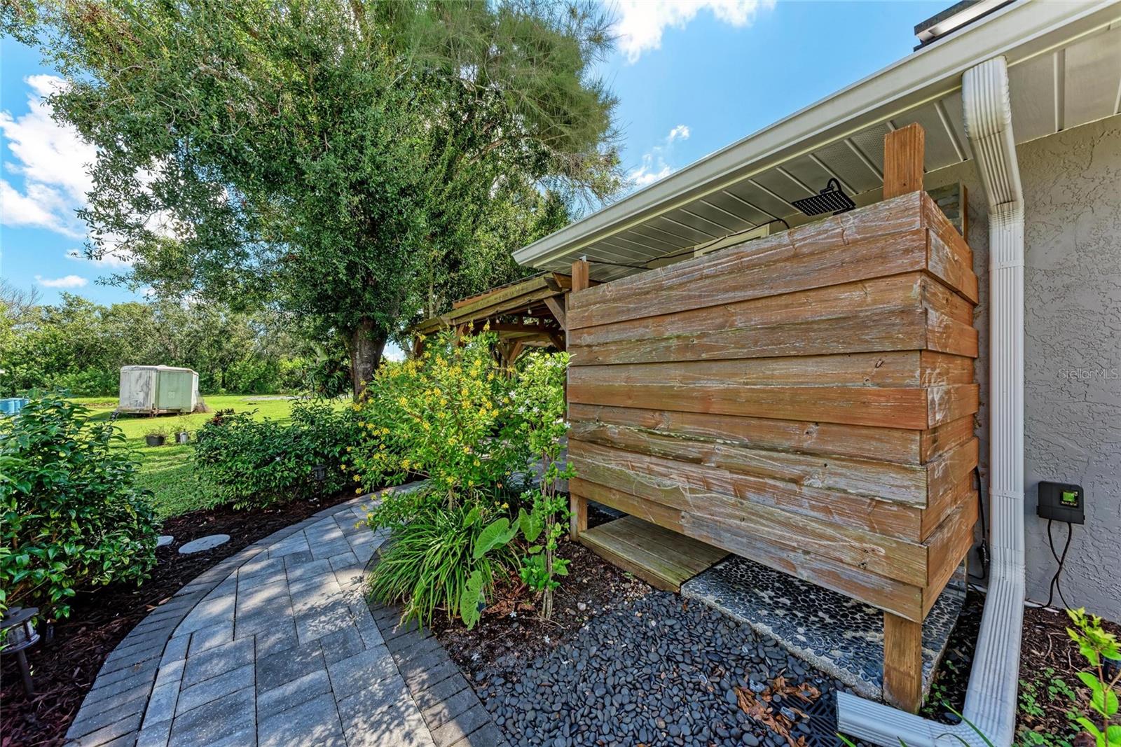 Exterior: French Doors, Garden, Lighting, Outdoor Shower, Rain Gutters