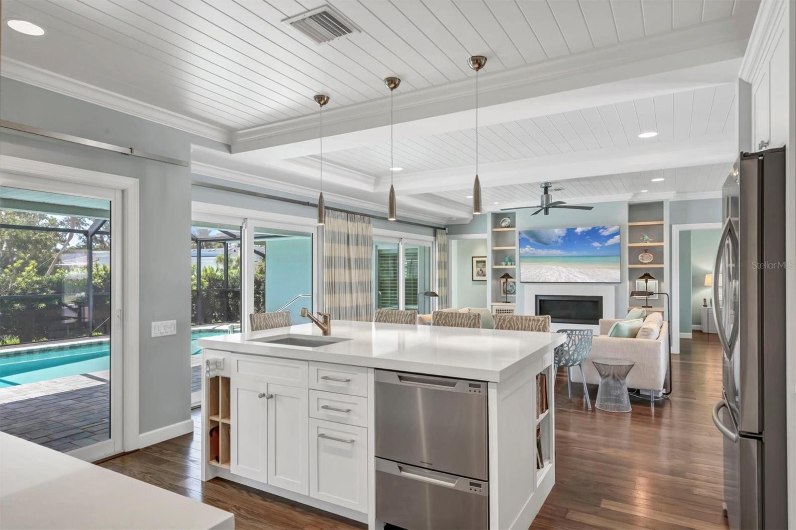 Welcome to your own piece of paradise in the prestigious Country Club Shores neighborhood on Longboat Key. This stunning 4-bedroom, 3-bath home has been thoughtfully renovated with a perfect blend of coastal elegance and modern sophistication, offering ideal indoor-outdoor living along one of the island's serene canals. Inside, you'll be welcomed by a bright, open-concept design featuring beautiful, engineered wood floors, custom beadboard ceilings, and a soothing palette of sea-glass blues and clean whites. The heart of the home is a gourmet kitchen outfitted with stainless steel appliances, designer pendant lighting, and stylish lattice-front cabinetry. A large island anchors the space, perfect for entertaining, while the adjacent living area boasts custom-built-ins, a sleek gas fireplace, and expansive views that flow effortlessly outdoors. Each bedroom is designed for comfort and privacy, with spa-inspired bathrooms that feature elegant tile work, modern fixtures, and soft lighting. The primary suite is a retreat of its own, with custom shelving, cozy window seats, and lush garden views through plantation shutters. Step outside to experience Florida living at its finest. The spacious screened lanai surrounds a sparkling heated saltwater pool and paved deck, creating a private oasis perfect for lounging, swimming, or dining alfresco in total comfort. Just beyond, a large, newer dock awaits, offering deep-water canal access--an ideal setup for avid boaters and water lovers. The deck overlooking the canal is a peaceful setting for morning coffee or an evening cocktail This home also offers exclusive deeded beach access, just a short walk or bike ride away, where you can soak in the soft white sands and turquoise waters of the Gulf. When it's time to explore, the renowned boutiques and fine dining of St. Armands Circle are just down the street, offering vibrant nightlife, unique shopping, and gourmet experiences in a picturesque coastal setting. A short drive over the scenic Ringling Bridge takes you to downtown Sarasota, a cultural haven known for its art galleries, theaters, opera house, and waterfront dining. Whether you're strolling through the Saturday farmers market, taking in a performance at the Sarasota Opera, or enjoying waterfront cocktails at Marina Jack, the city provides an enriching blend of sophistication and coastal charm. With its ideal location, timeless design, and luxurious updates, this home offers the very best of Longboat Key living--a rare opportunity to enjoy both boating and beachside leisure in one of Florida's most coveted communities.