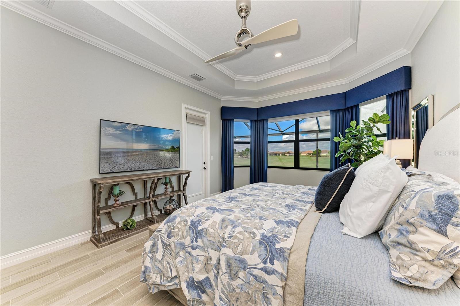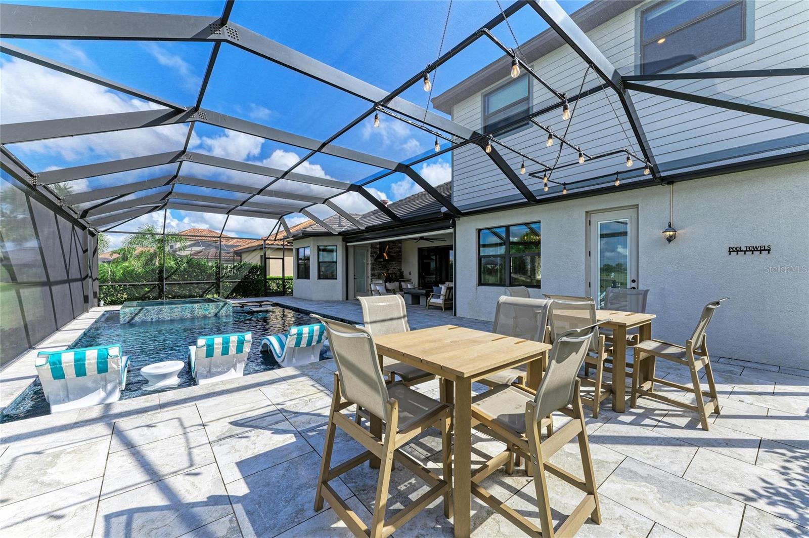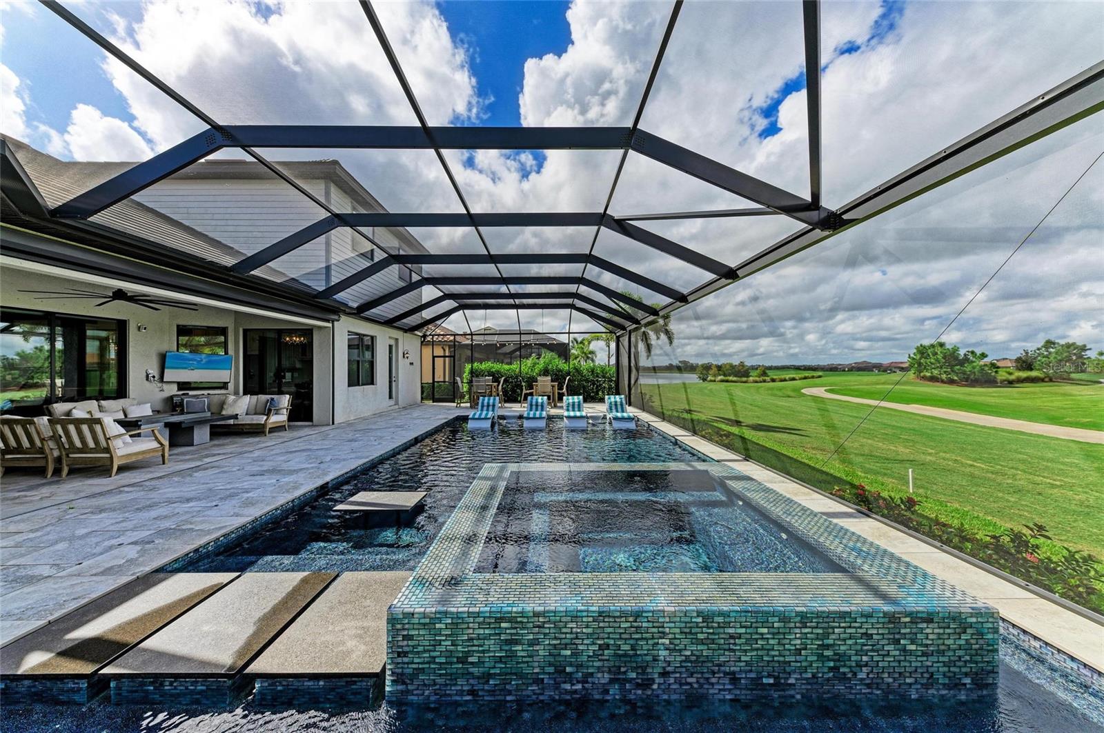 Welcome to refined living in Lakewood National Golf Club. Looking out over the 16th hole of the Piper Course and offered turnkey furnished, this 2021 built Estate Home spans 3025 under air square feet of thoughtfully designed space. From the moment you step inside and see all the way through this open-concept home to the sparkling custom saltwater pool/spa looking through the panoramic screen to the golf course, you know this home is special. With 3 bedrooms, a den/4th bedroom, 3.5 bathrooms plus a very large bonus room upstairs that includes one of the full bathrooms, a wet bar, beverage refrigerator, extra storage and a queen Murphy, the highlight feature is the FlightScope golf simulator with projection screen. The showstopper kitchen has new quartz countertops with a waterfall edge on the island, custom reglazed solid wood cabinets, stainless steel appliances including a 2024 black stainless refrigerator, and a gas cooktop. The extended kitchen buffet features a beverage refrigerator and additional storage. The living and dining areas highlight coffered ceilings, crown molding and a bespoke feature wall with an electric fireplace and illuminated shelving. Tray ceilings and custom paint add depth throughout this stunning home. In the primary suite owners will enjoy a large walk-in closet with custom built-ins, refined finishes that include electric blackout rolldown shades and direct pool/spa access. Power and light filtering window treatments, plantations shutters and custom draperies combine designer accents and functionality. Outdoor living is equally impressive with an oversized west-facing lanai, Italian porcelain tile deck, 16-by-36-foot custom saltwater pool with built-in sun deck, 7-foot hot tub and dual pool heaters. An electric roll-down hurricane screen provides convenience, privacy and storm protection for all of your outdoor furniture. Additional features include a 2022 Generac 18KW whole-house generator, and a 2020 EZ Go six-seat golf cart. All this, plus owners in Lakewood National Golf Club enjoy deeded golf membership giving owners the ability to play 36 holes of championship golf year-round. The Commander course at Lakewood National Golf Club was named No. 1 Golfers' Choice and No. 1 Top Course in Florida by Golf Advisor. Lakewood National Golf Club offers gated, maintenance-free living with extraordinary amenities that include a zero-entry heated pool with cascading waterfalls and lap lanes, poolside tiki bar and caf, fitness center with group exercise classes, an on-site full-service spa, eight lighted Har-Tru tennis courts, bocce, pickleball, several satellite pools, and a stunning 28,000-square-foot clubhouse which offers fine and casual dining, an expansive bar and lounge, men's and ladies lounges and locker rooms, conference and meeting space, a full-time lifestyle director who keeps residents' social life fun and active with trivia night, karaoke night, live concerts on the green, extravagant holiday parties, wine-tasting dinners and more. Lakewood National Golf Club hosts the annual Korn Ferry Tour's LECOM Suncoast Classic.