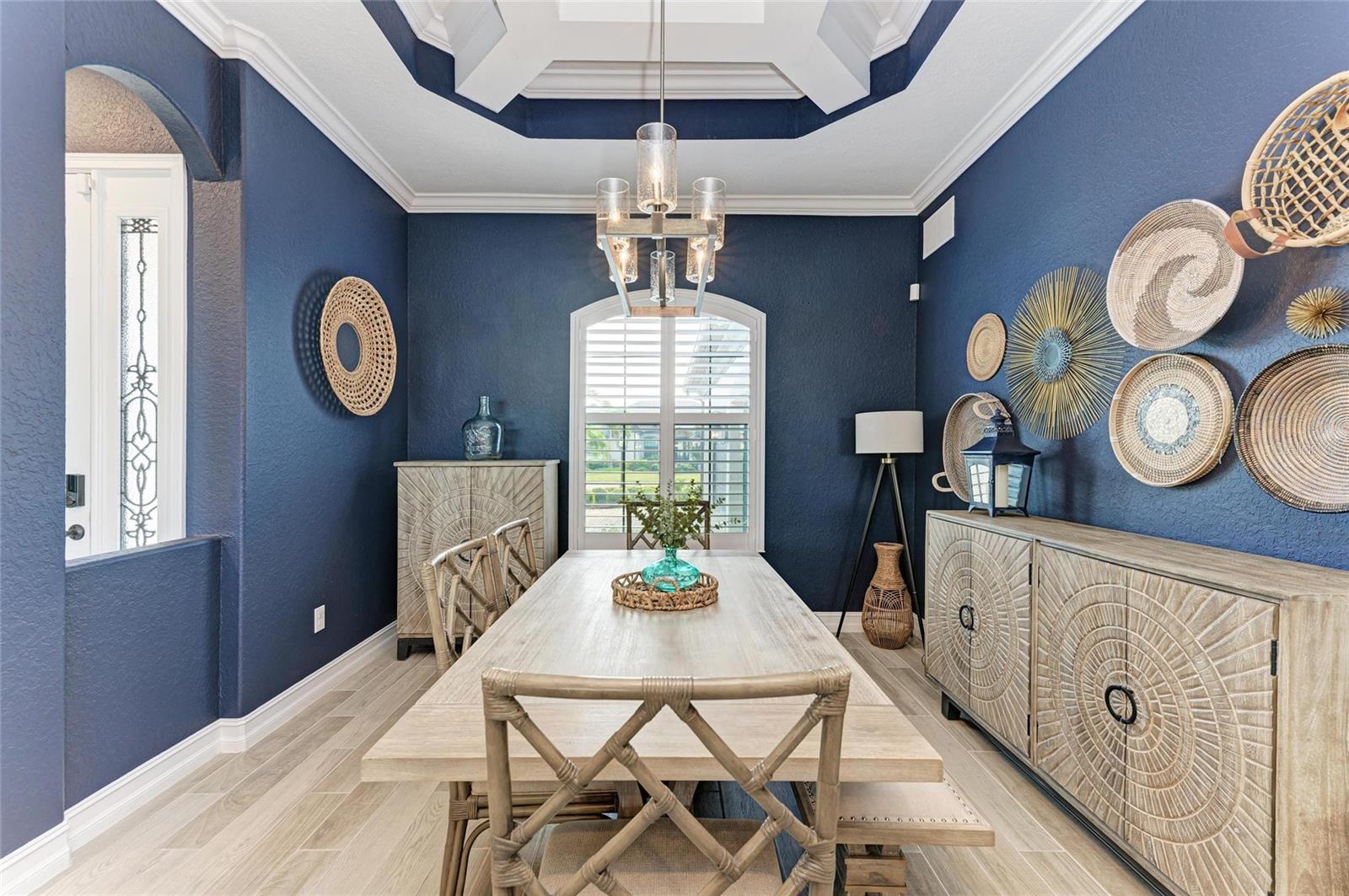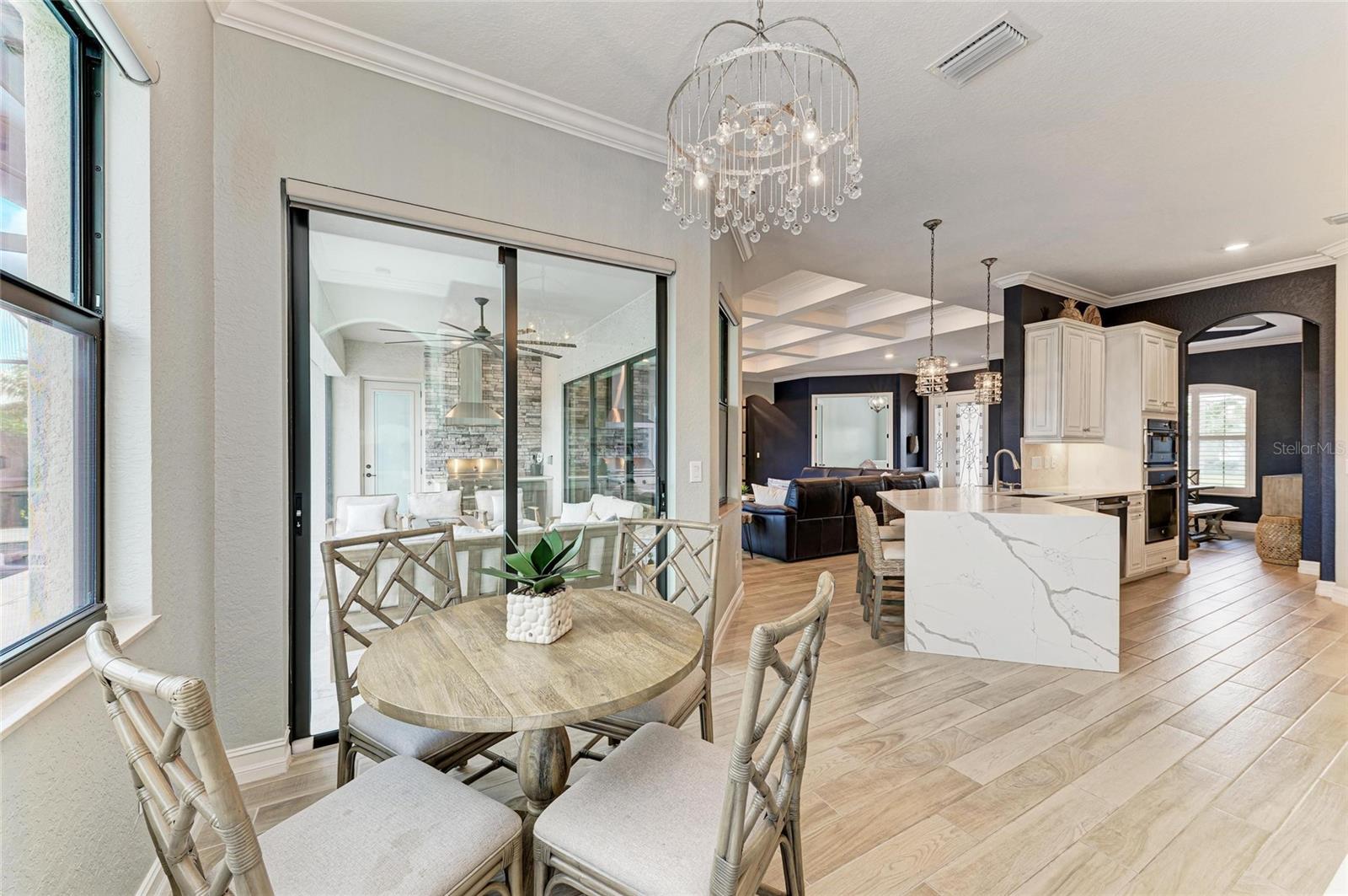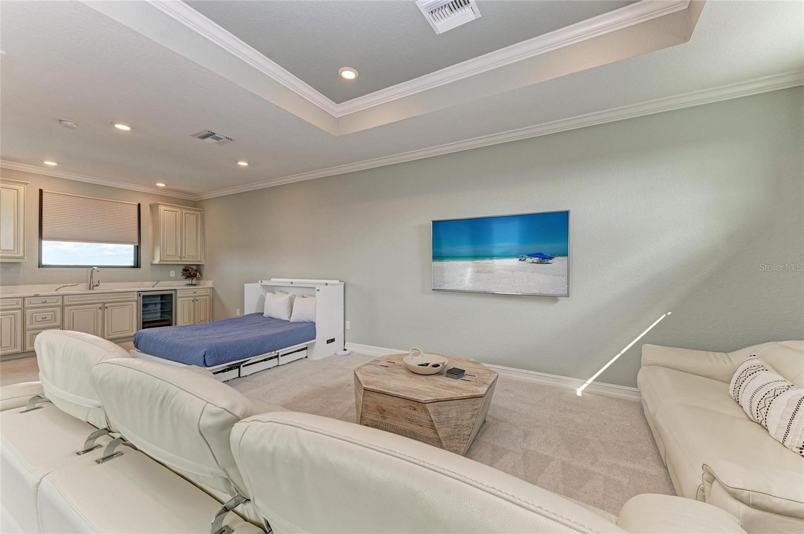 Welcome to refined living in Lakewood National Golf Club. Looking out over the 16th hole of the Piper Course and offered turnkey furnished, this 2021 built Estate Home spans 3025 under air square feet of thoughtfully designed space. From the moment you step inside and see all the way through this open-concept home to the sparkling custom saltwater pool/spa looking through the panoramic screen to the golf course, you know this home is special. With 3 bedrooms, a den/4th bedroom, 3.5 bathrooms plus a very large bonus room upstairs that includes one of the full bathrooms, a wet bar, beverage refrigerator, extra storage and a queen Murphy, the highlight feature is the FlightScope golf simulator with projection screen. The showstopper kitchen has new quartz countertops with a waterfall edge on the island, custom reglazed solid wood cabinets, stainless steel appliances including a 2024 black stainless refrigerator, and a gas cooktop. The extended kitchen buffet features a beverage refrigerator and additional storage. The living and dining areas highlight coffered ceilings, crown molding and a bespoke feature wall with an electric fireplace and illuminated shelving. Tray ceilings and custom paint add depth throughout this stunning home. In the primary suite owners will enjoy a large walk-in closet with custom built-ins, refined finishes that include electric blackout rolldown shades and direct pool/spa access. Power and light filtering window treatments, plantations shutters and custom draperies combine designer accents and functionality. Outdoor living is equally impressive with an oversized west-facing lanai, Italian porcelain tile deck, 16-by-36-foot custom saltwater pool with built-in sun deck, 7-foot hot tub and dual pool heaters. An electric roll-down hurricane screen provides convenience, privacy and storm protection for all of your outdoor furniture. Additional features include a 2022 Generac 18KW whole-house generator, and a 2020 EZ Go six-seat golf cart. All this, plus owners in Lakewood National Golf Club enjoy deeded golf membership giving owners the ability to play 36 holes of championship golf year-round. The Commander course at Lakewood National Golf Club was named No. 1 Golfers' Choice and No. 1 Top Course in Florida by Golf Advisor. Lakewood National Golf Club offers gated, maintenance-free living with extraordinary amenities that include a zero-entry heated pool with cascading waterfalls and lap lanes, poolside tiki bar and caf, fitness center with group exercise classes, an on-site full-service spa, eight lighted Har-Tru tennis courts, bocce, pickleball, several satellite pools, and a stunning 28,000-square-foot clubhouse which offers fine and casual dining, an expansive bar and lounge, men's and ladies lounges and locker rooms, conference and meeting space, a full-time lifestyle director who keeps residents' social life fun and active with trivia night, karaoke night, live concerts on the green, extravagant holiday parties, wine-tasting dinners and more. Lakewood National Golf Club hosts the annual Korn Ferry Tour's LECOM Suncoast Classic.