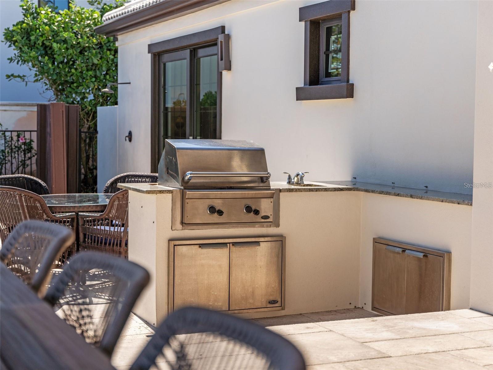 Exterior: Lighting, Outdoor Grill, Outdoor Kitchen, Outdoor Shower, Private Mailbox, Rain Gutters, Shade Shutter(s), Sidewalk, Sliding Doors