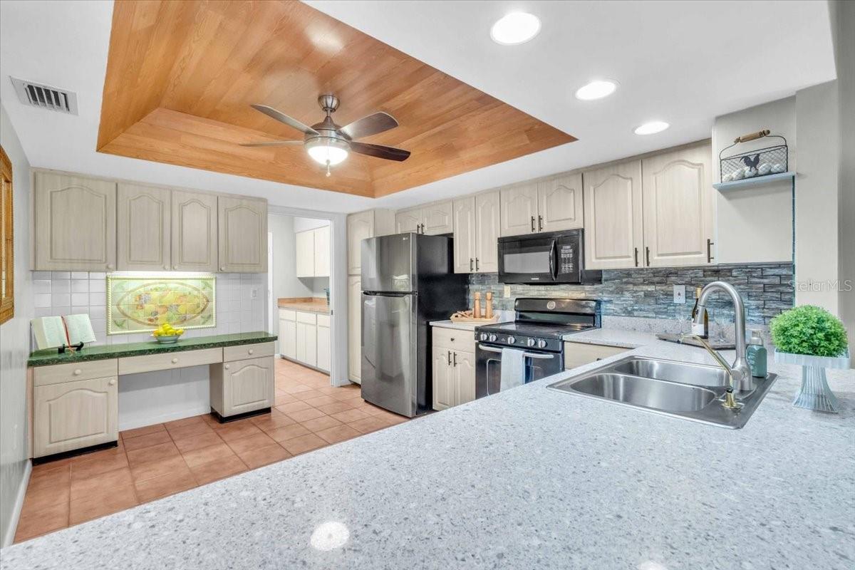 Saddle Up for Style in the 55+ community of Center Gate Villages 5!Welcome to this well-maintained, rarely available and truly one-of-a-kind 3-bedroom, 2-bath villanestled in the heart of the coveted Center Gate Estates. With a nod to western charm and a warm, welcoming vibe, this spacious home is perfect for anyone seeking character, comfort, and convenience.Step into a roomy foyerthat sets the tone for versatility--your first guest bedroom is to the left, complete with custom built-in shelving and storage, ideal as a den or home office. To the right, the home opens into a western-inspired family roomfeaturing custom saloon doors, a high-top bar setup, and sun-drenched windows--just add a pool table and you've got your very own at-home saloon!The open-concept kitchen and living roomare made for entertaining, with new quartz countertops, fresh paint, updated lighting, water filtration system, and a stone-faced wood-burning fireplaceunder soaring cathedral ceilingsand a skylight. Sliders lead to the enclosed Florida room, now upgraded with accordion shutters and glass sliders, creating a seamless indoor-outdoor flow. All bedrooms are generously sized with ample closet space, and the primary suiteoffers a peaceful retreat. As matter of fact, all rooms are spacious including the interior laundry room with new washer and the 2-car garage, both featuring a ton of cabinet space. Enjoy your morning coffee on the long side patioor in the Florida room, both perfect for soaking up the Florida sunshine.Recent updates include: Water Heater (2018), HVAC (2018), Refrigerator (2018), Range (2016), Microwave (2011), Washer (2024)Located just steps from the community pool, and minutes from shopping, dining, hospitals, I-75, beaches, UTC Mall, golf courses, and more--this home offers the hassle-free lifestyleof a maintenance-free communitywith all the perks of Sarasota living.Priced to sell--don't miss your chance to own this unique gem! Schedule your showing today and experience the charm for yourself.