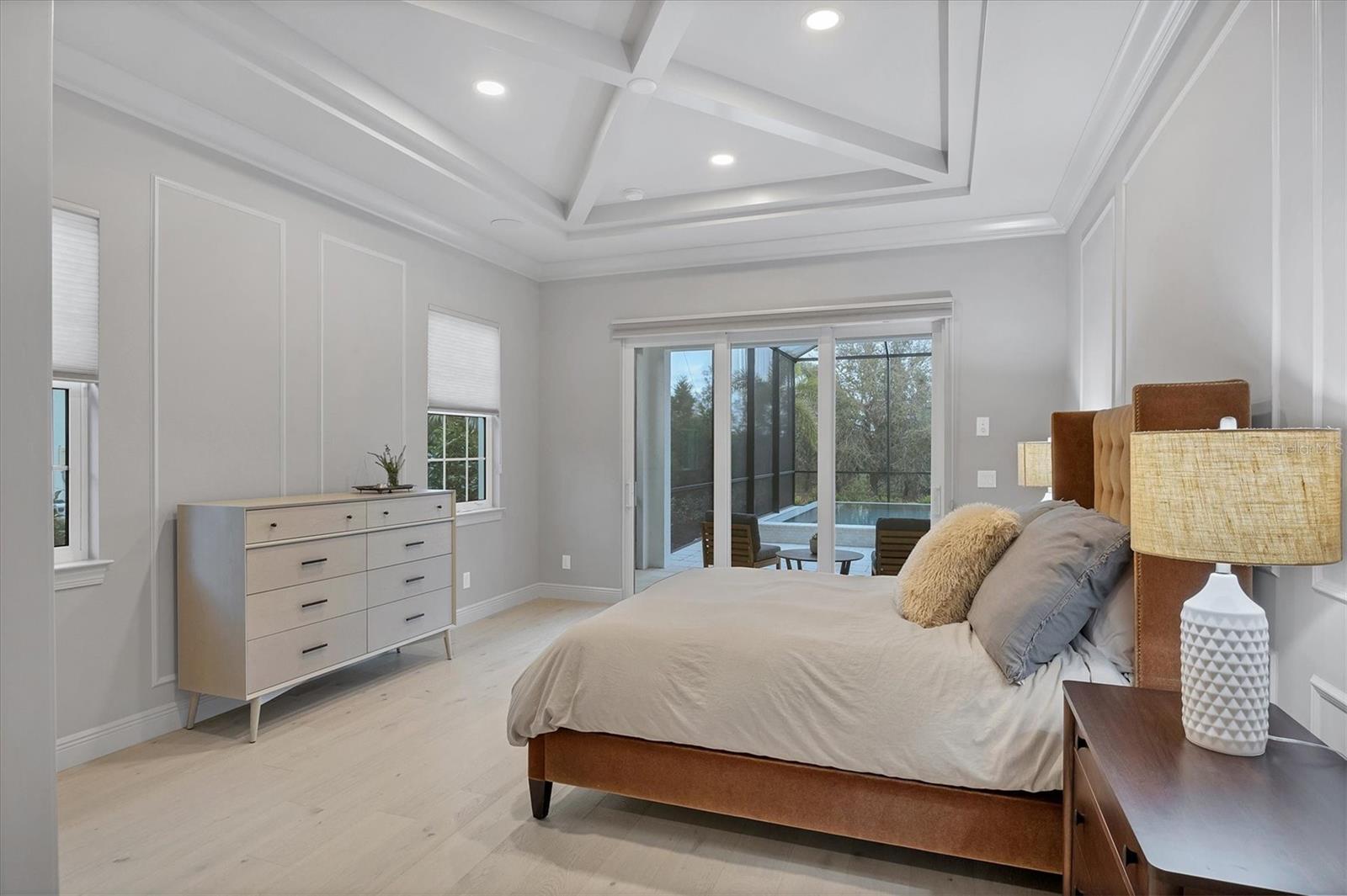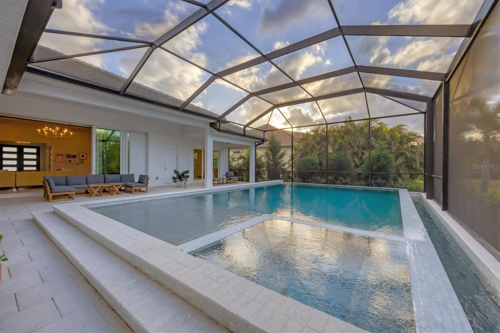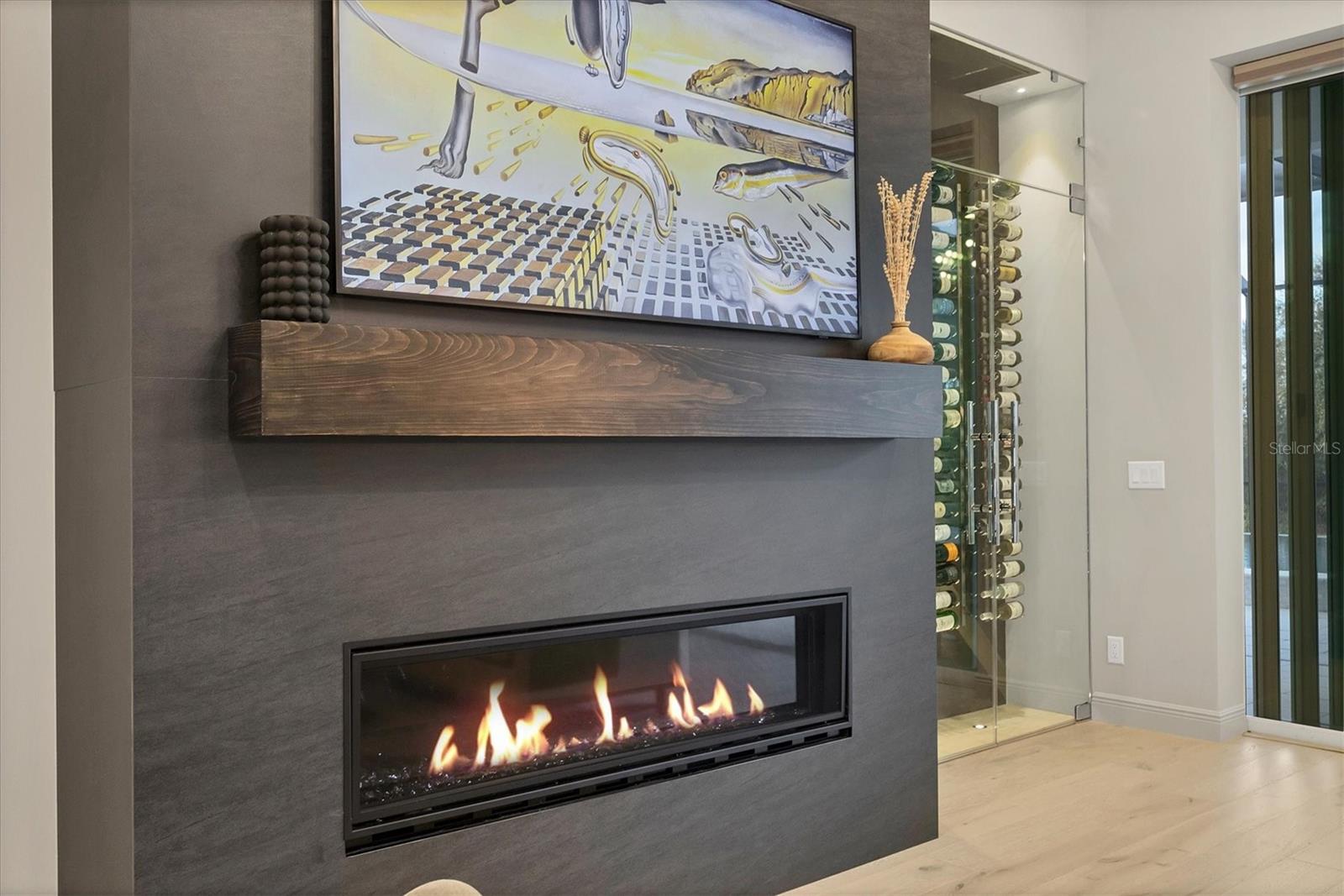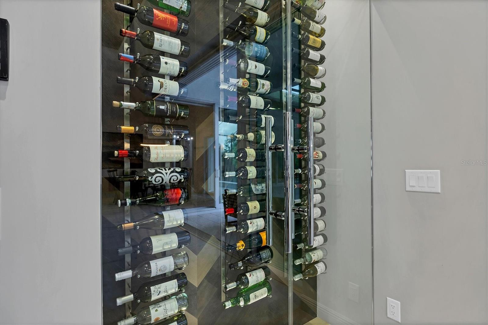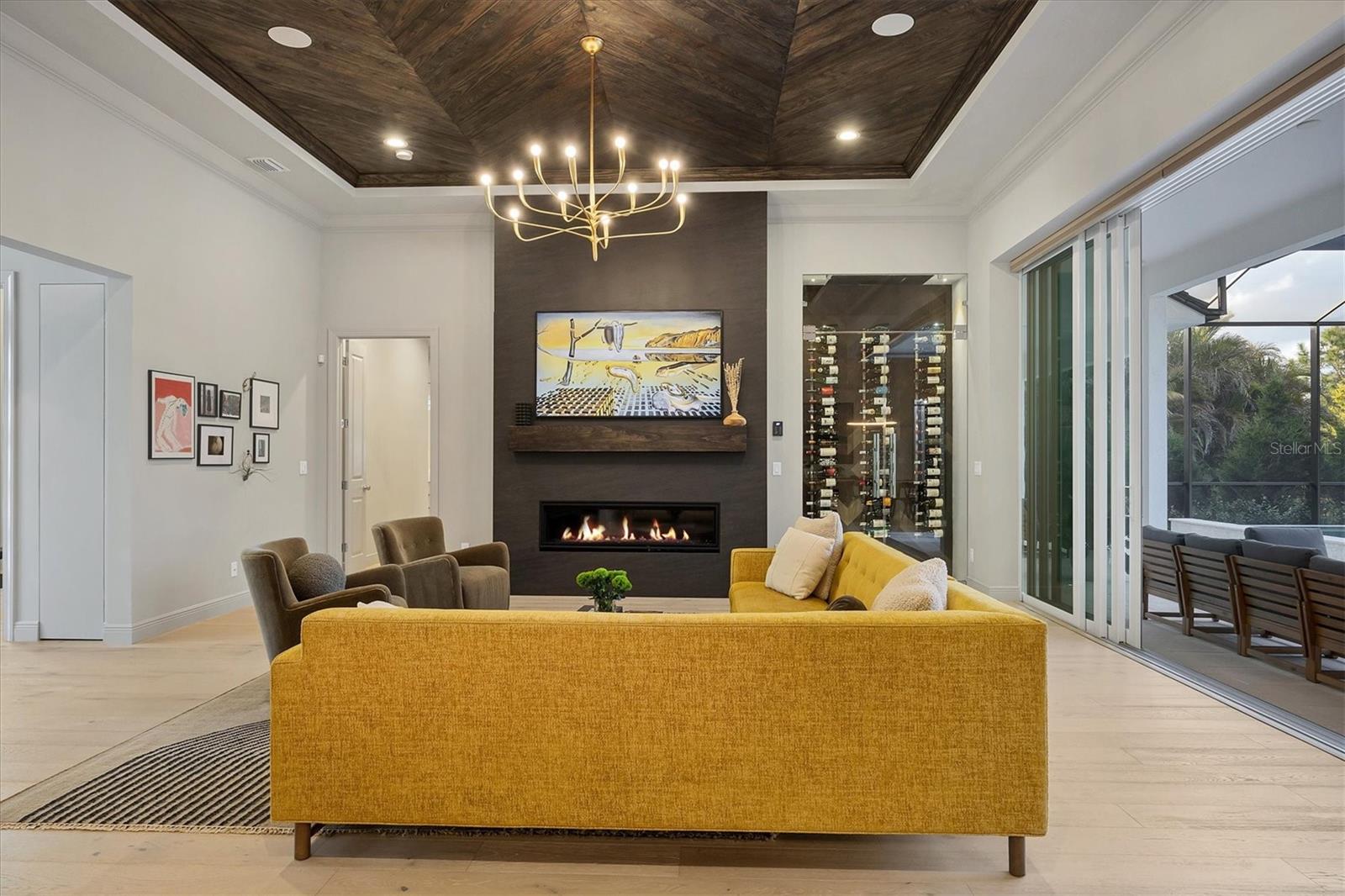 On a quiet preserve in the exclusive gated enclave of Country Club East, this exceptional John Cannon residence showcases refined craftsmanship, modern luxury, and seamless indoor-outdoor living. Designed for comfort and impact, the home features impact-rated windows and doors, a full-house generator, and an open layout that's as functional as it is beautiful. Enter through 10-foot iron and glass double doors into a dramatic great room with whitewashed European oak flooring, soaring 13-foot ceilings with chevron wood detail, and a striking natural gas fireplace framed by Basalt volcanic tile and reclaimed wood mantle. A custom Whisperkool wine wall holds up to 130 bottles, accented by a chevron Stickwood backdrop. The main foyer features a hidden closet for bags and shoes. The chef's kitchen boasts Sub-Zero and Wolf appliances, a six-burner range, built-in oven and microwave, quartz countertops, a prep island outfitted with pullout drawers, two for spices, a farmhouse sink and a standalone ice maker. An entertaining-sized island outside the kitchen features Sub-Zero beverage and wine coolers, an additional microwave and ample hidden storage. A spacious walk-in pantry is nearby and includes a built-in tall closet. The great room's 10-foot sliders fold back into a disappearing corner and lead to the expansive lanai with a PebbleTec infinity-edge heated saltwater pool and spa, panoramic screen enclosure, Shell Lock pavers and a fully outfitted summer kitchen with Alfresco grill, Trailwinds hood, True ice machine, Uline refrigerator and Blanco sink. The private owner's wing includes two walk-in closets, tray ceiling with crown molding, lanai access, and a spa-style bath with radiant heated floors and a steam shower. Two guest suites are positioned in separate wings, each with its full bath and walk-in closet, one with a private entrance and drop zone, the other with pool bath access. Additional living spaces include a bonus room with 10-foot sliders as a second disappearing corner as well as a study/exercise room with 15-foot ceilings. The laundry room features abundant cabinet storage, designer tile, sink and an additional 60 square feet of dedicated storage carved out behind two double doors. Adding even more value, the home is equipped with a whole-house water filtration system, designer lighting, automatic blinds and an oversized three-car garage. Every detail of this home has been thoughtfully curated for elevated living in one of Lakewood Ranch's prestigious communities.