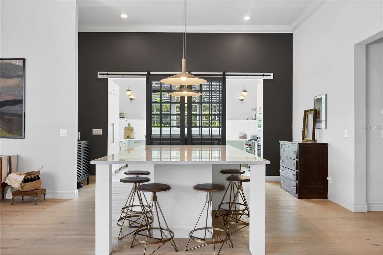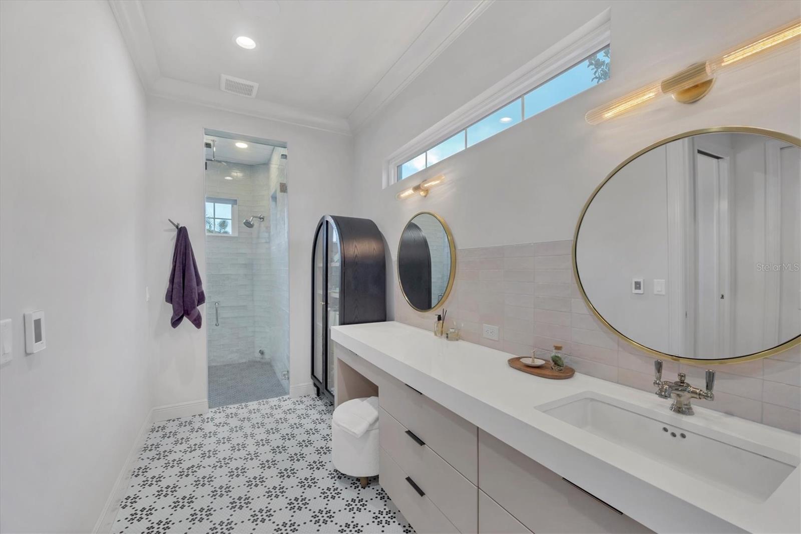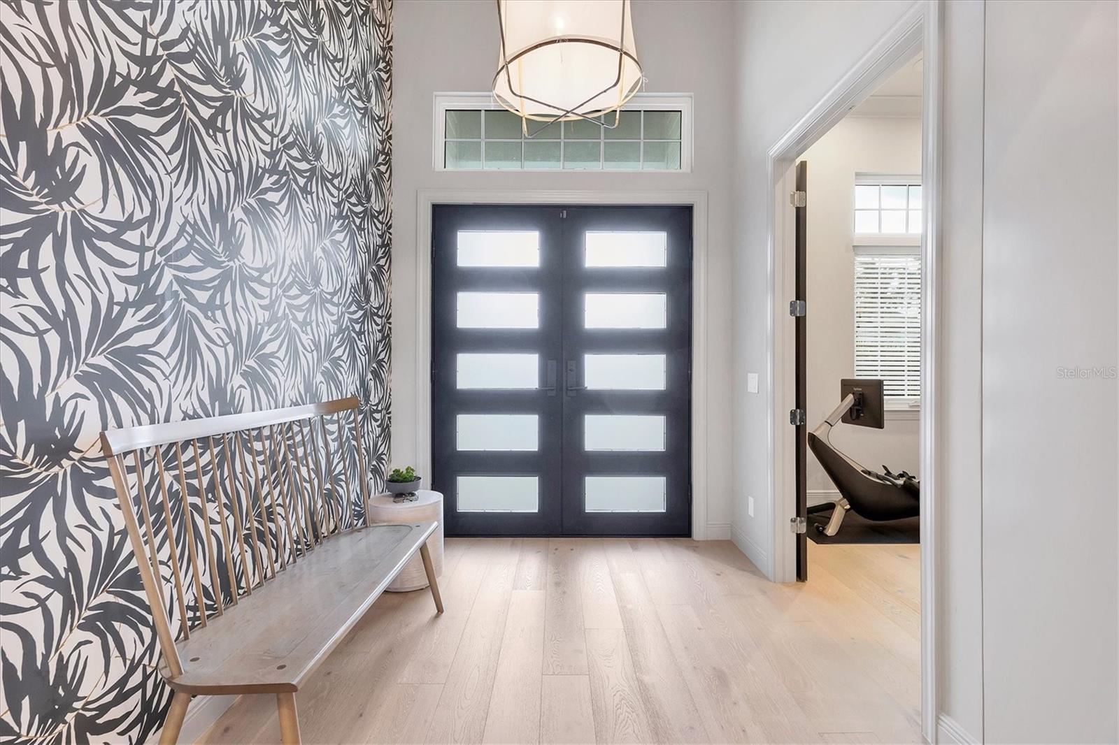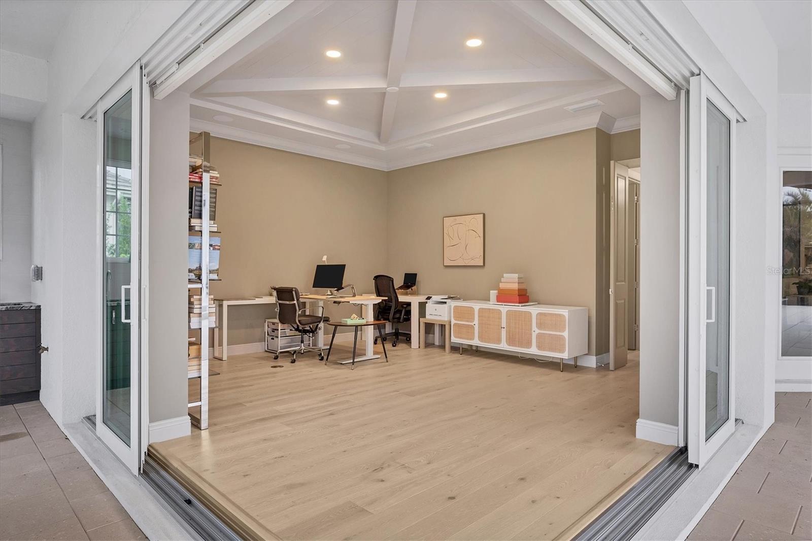 On a quiet preserve in the exclusive gated enclave of Country Club East, this exceptional John Cannon residence showcases refined craftsmanship, modern luxury, and seamless indoor-outdoor living. Designed for comfort and impact, the home features impact-rated windows and doors, a full-house generator, and an open layout that's as functional as it is beautiful. Enter through 10-foot iron and glass double doors into a dramatic great room with whitewashed European oak flooring, soaring 13-foot ceilings with chevron wood detail, and a striking natural gas fireplace framed by Basalt volcanic tile and reclaimed wood mantle. A custom Whisperkool wine wall holds up to 130 bottles, accented by a chevron Stickwood backdrop. The main foyer features a hidden closet for bags and shoes. The chef's kitchen boasts Sub-Zero and Wolf appliances, a six-burner range, built-in oven and microwave, quartz countertops, a prep island outfitted with pullout drawers, two for spices, a farmhouse sink and a standalone ice maker. An entertaining-sized island outside the kitchen features Sub-Zero beverage and wine coolers, an additional microwave and ample hidden storage. A spacious walk-in pantry is nearby and includes a built-in tall closet. The great room's 10-foot sliders fold back into a disappearing corner and lead to the expansive lanai with a PebbleTec infinity-edge heated saltwater pool and spa, panoramic screen enclosure, Shell Lock pavers and a fully outfitted summer kitchen with Alfresco grill, Trailwinds hood, True ice machine, Uline refrigerator and Blanco sink. The private owner's wing includes two walk-in closets, tray ceiling with crown molding, lanai access, and a spa-style bath with radiant heated floors and a steam shower. Two guest suites are positioned in separate wings, each with its full bath and walk-in closet, one with a private entrance and drop zone, the other with pool bath access. Additional living spaces include a bonus room with 10-foot sliders as a second disappearing corner as well as a study/exercise room with 15-foot ceilings. The laundry room features abundant cabinet storage, designer tile, sink and an additional 60 square feet of dedicated storage carved out behind two double doors. Adding even more value, the home is equipped with a whole-house water filtration system, designer lighting, automatic blinds and an oversized three-car garage. Every detail of this home has been thoughtfully curated for elevated living in one of Lakewood Ranch's prestigious communities.