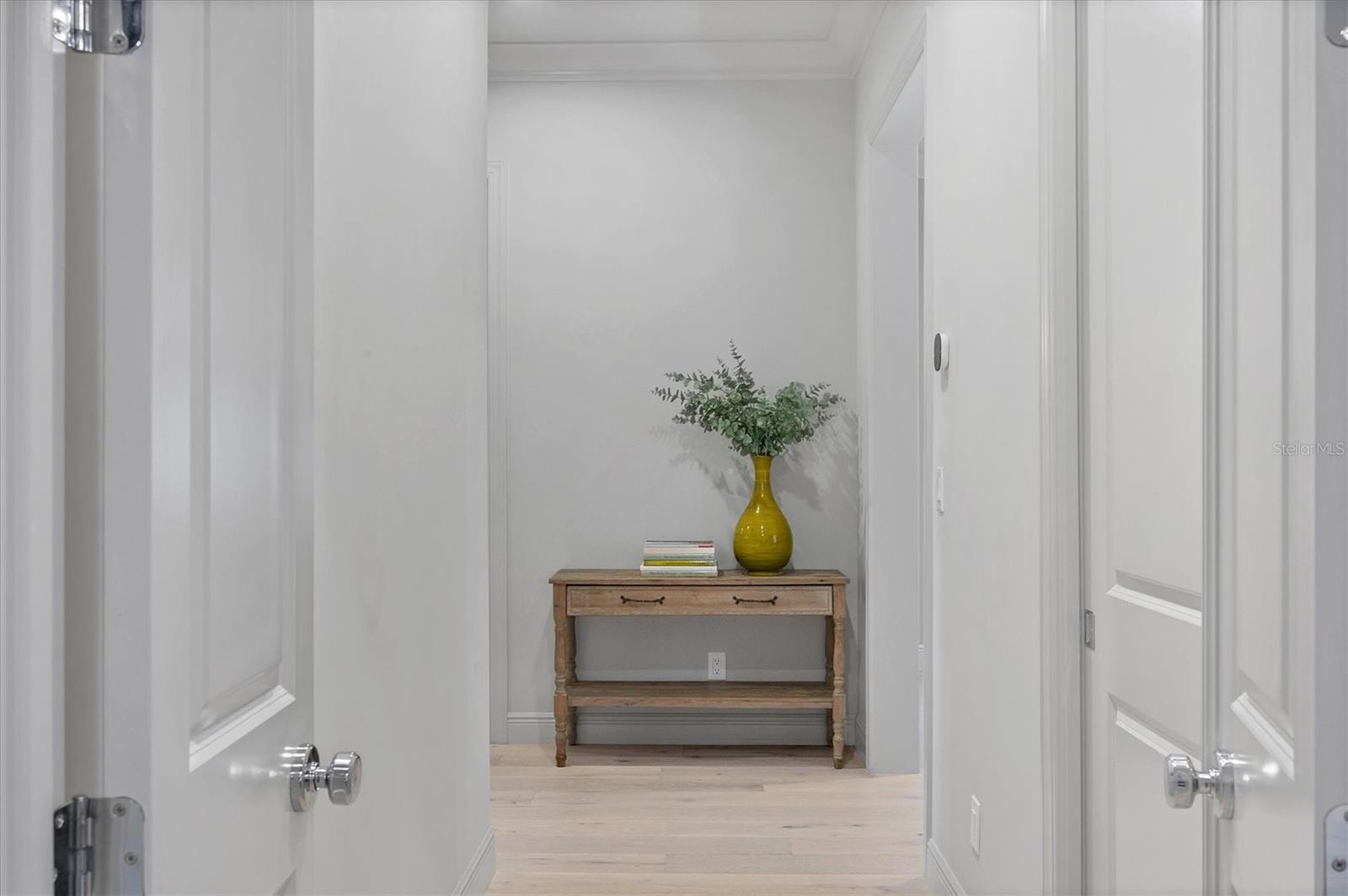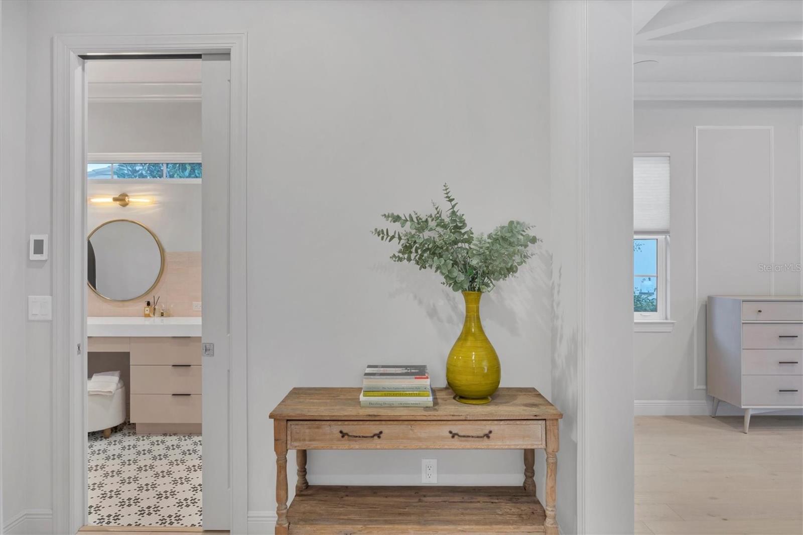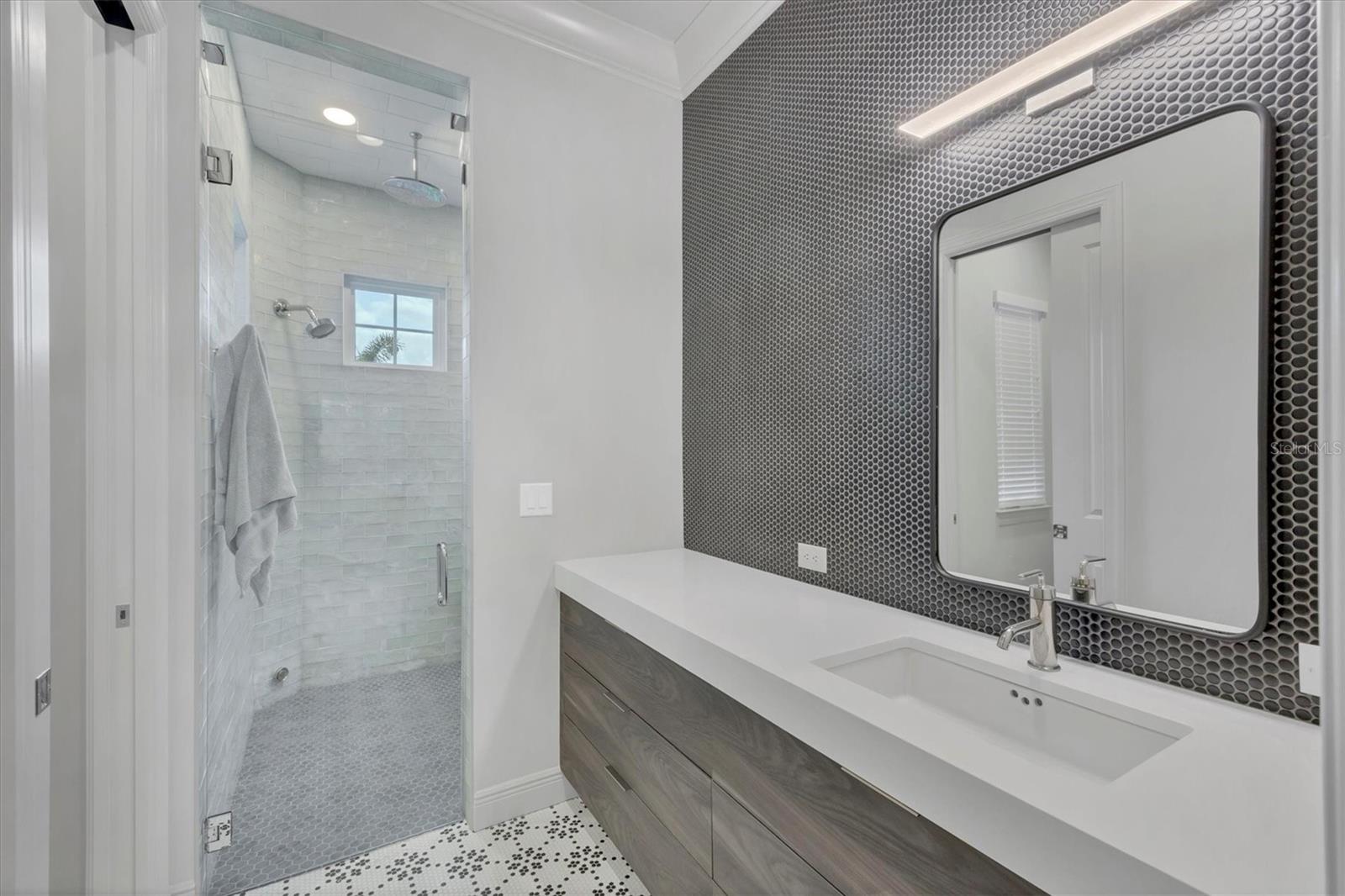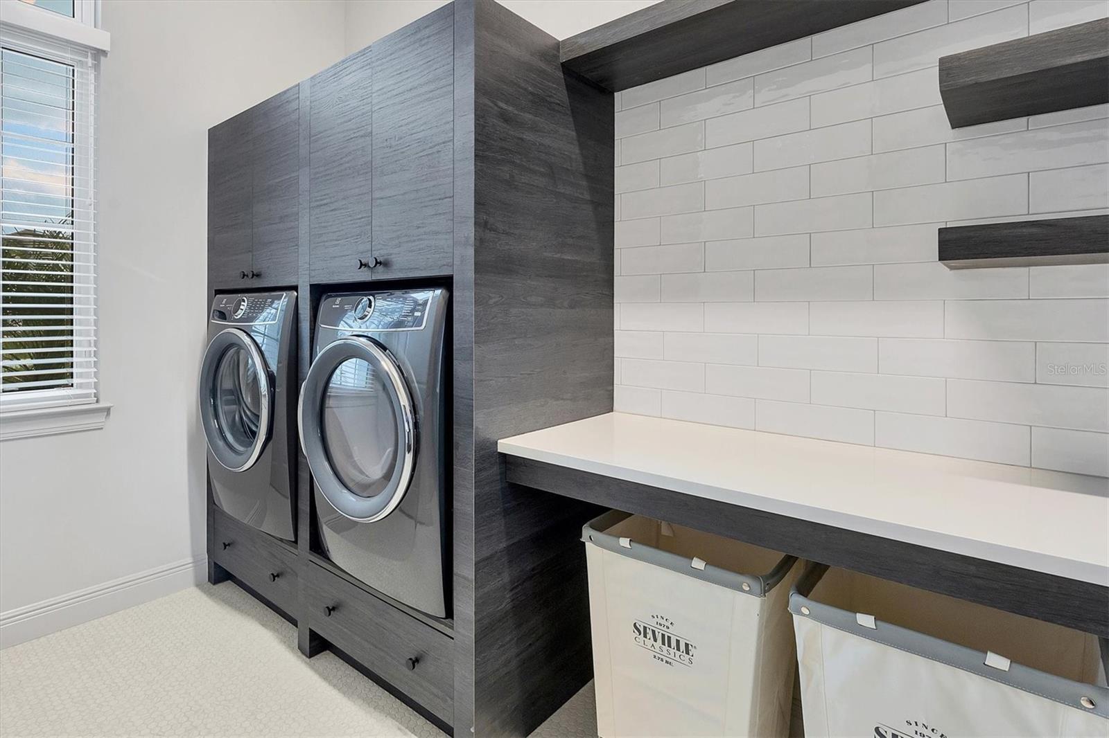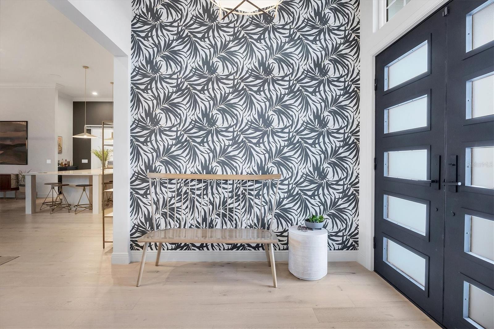 On a quiet preserve in the exclusive gated enclave of Country Club East, this exceptional John Cannon residence showcases refined craftsmanship, modern luxury, and seamless indoor-outdoor living. Designed for comfort and impact, the home features impact-rated windows and doors, a full-house generator, and an open layout that's as functional as it is beautiful. Enter through 10-foot iron and glass double doors into a dramatic great room with whitewashed European oak flooring, soaring 13-foot ceilings with chevron wood detail, and a striking natural gas fireplace framed by Basalt volcanic tile and reclaimed wood mantle. A custom Whisperkool wine wall holds up to 130 bottles, accented by a chevron Stickwood backdrop. The main foyer features a hidden closet for bags and shoes. The chef's kitchen boasts Sub-Zero and Wolf appliances, a six-burner range, built-in oven and microwave, quartz countertops, a prep island outfitted with pullout drawers, two for spices, a farmhouse sink and a standalone ice maker. An entertaining-sized island outside the kitchen features Sub-Zero beverage and wine coolers, an additional microwave and ample hidden storage. A spacious walk-in pantry is nearby and includes a built-in tall closet. The great room's 10-foot sliders fold back into a disappearing corner and lead to the expansive lanai with a PebbleTec infinity-edge heated saltwater pool and spa, panoramic screen enclosure, Shell Lock pavers and a fully outfitted summer kitchen with Alfresco grill, Trailwinds hood, True ice machine, Uline refrigerator and Blanco sink. The private owner's wing includes two walk-in closets, tray ceiling with crown molding, lanai access, and a spa-style bath with radiant heated floors and a steam shower. Two guest suites are positioned in separate wings, each with its full bath and walk-in closet, one with a private entrance and drop zone, the other with pool bath access. Additional living spaces include a bonus room with 10-foot sliders as a second disappearing corner as well as a study/exercise room with 15-foot ceilings. The laundry room features abundant cabinet storage, designer tile, sink and an additional 60 square feet of dedicated storage carved out behind two double doors. Adding even more value, the home is equipped with a whole-house water filtration system, designer lighting, automatic blinds and an oversized three-car garage. Every detail of this home has been thoughtfully curated for elevated living in one of Lakewood Ranch's prestigious communities.