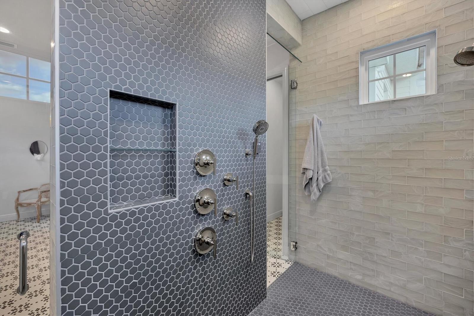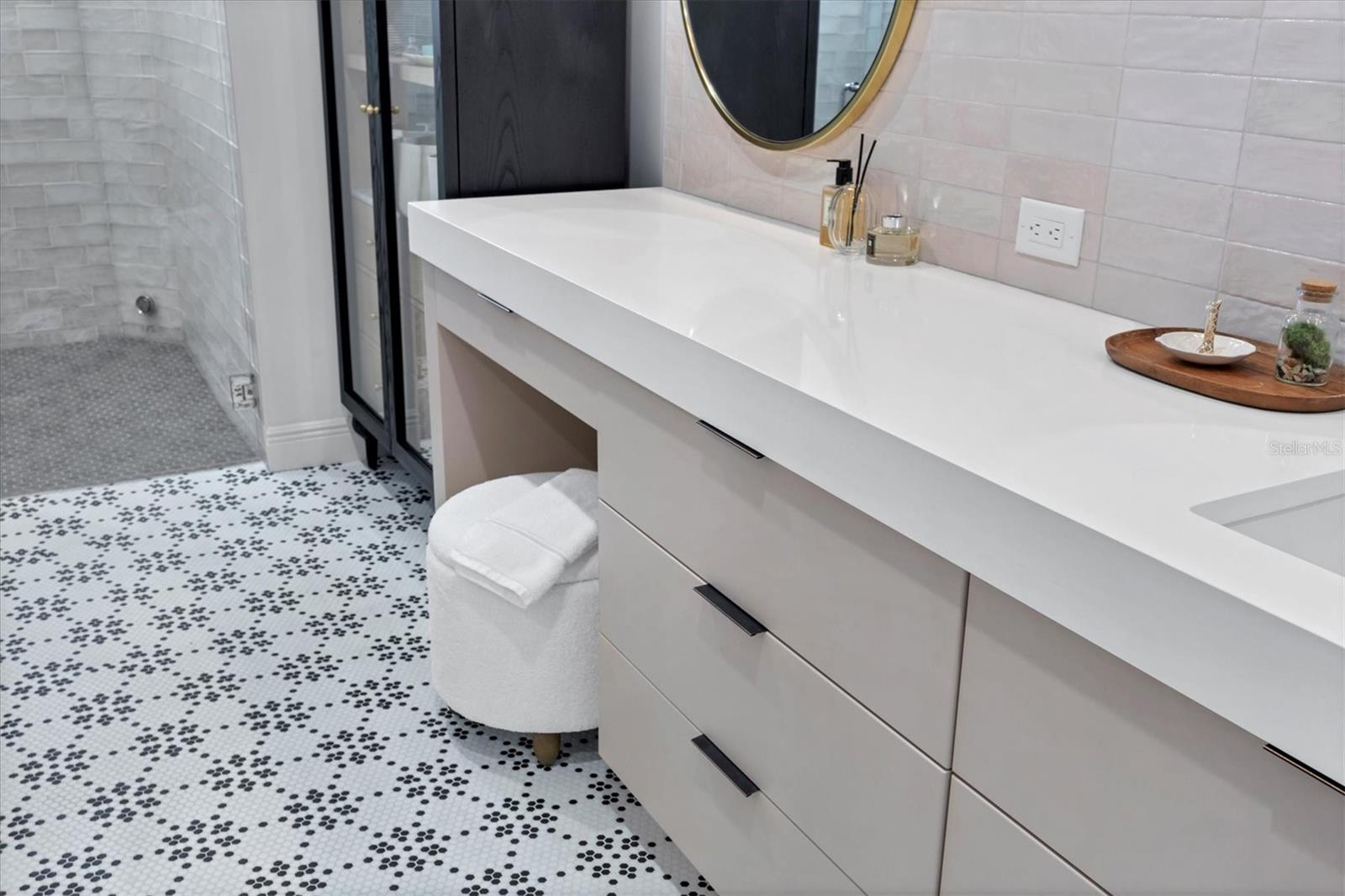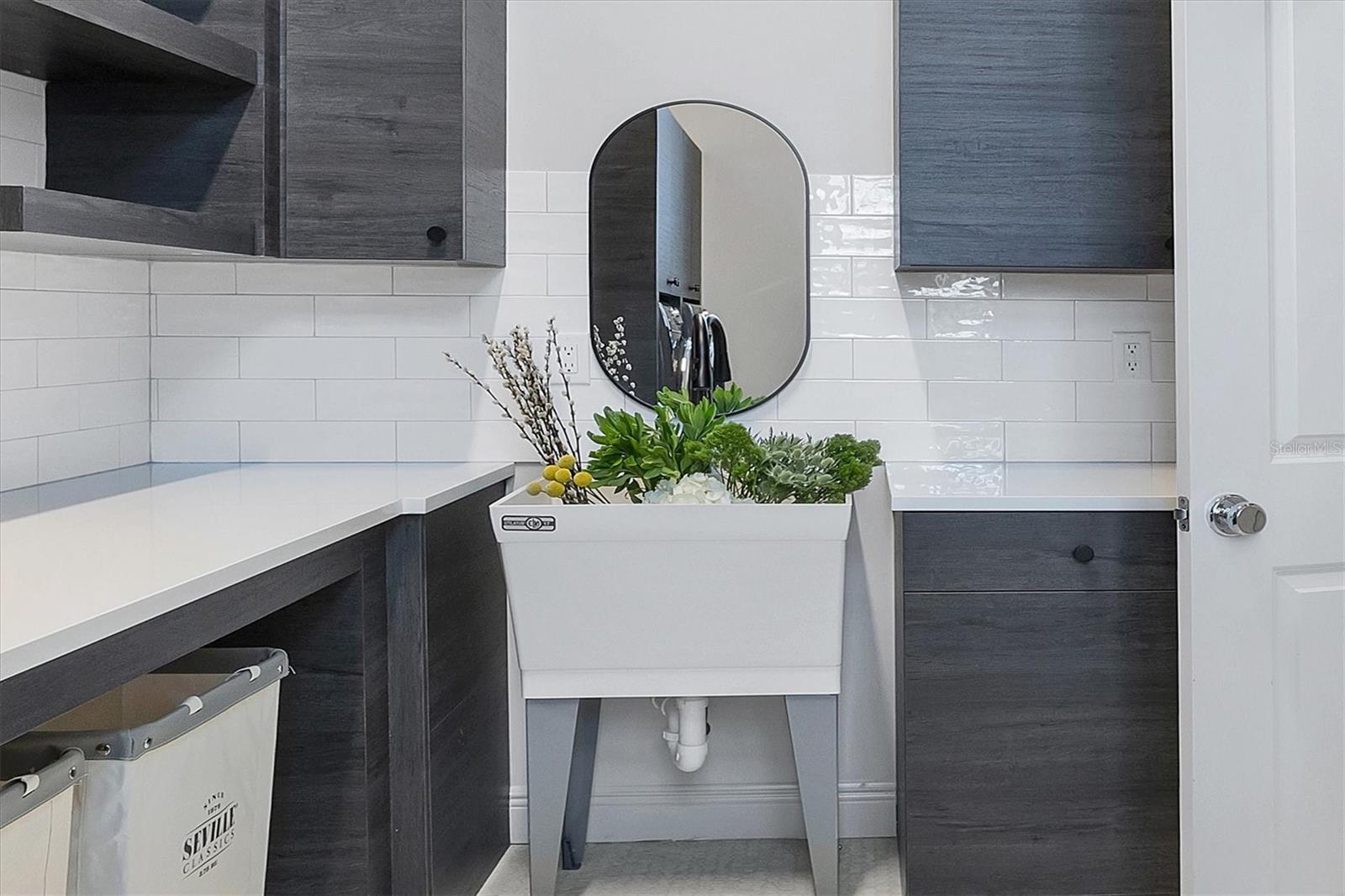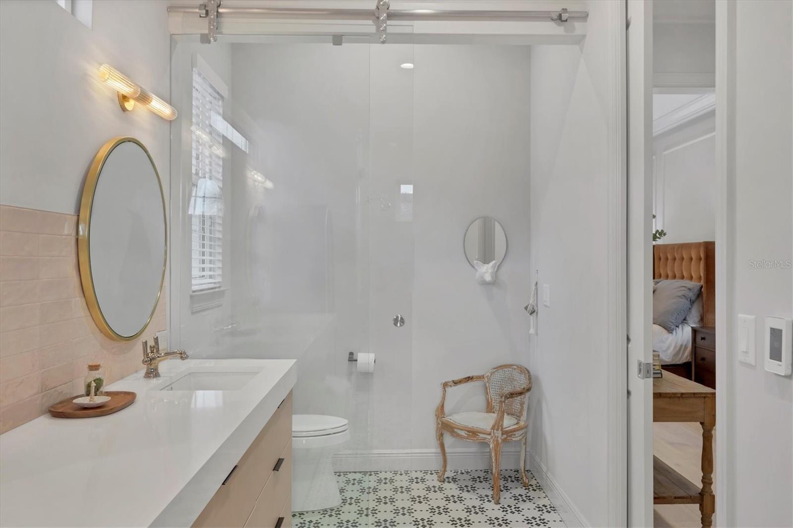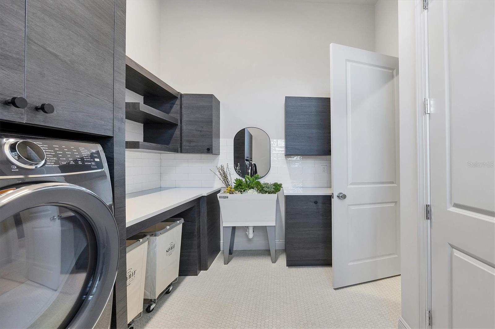 On a quiet preserve in the exclusive gated enclave of Country Club East, this exceptional John Cannon residence showcases refined craftsmanship, modern luxury, and seamless indoor-outdoor living. Designed for comfort and impact, the home features impact-rated windows and doors, a full-house generator, and an open layout that's as functional as it is beautiful. Enter through 10-foot iron and glass double doors into a dramatic great room with whitewashed European oak flooring, soaring 13-foot ceilings with chevron wood detail, and a striking natural gas fireplace framed by Basalt volcanic tile and reclaimed wood mantle. A custom Whisperkool wine wall holds up to 130 bottles, accented by a chevron Stickwood backdrop. The main foyer features a hidden closet for bags and shoes. The chef's kitchen boasts Sub-Zero and Wolf appliances, a six-burner range, built-in oven and microwave, quartz countertops, a prep island outfitted with pullout drawers, two for spices, a farmhouse sink and a standalone ice maker. An entertaining-sized island outside the kitchen features Sub-Zero beverage and wine coolers, an additional microwave and ample hidden storage. A spacious walk-in pantry is nearby and includes a built-in tall closet. The great room's 10-foot sliders fold back into a disappearing corner and lead to the expansive lanai with a PebbleTec infinity-edge heated saltwater pool and spa, panoramic screen enclosure, Shell Lock pavers and a fully outfitted summer kitchen with Alfresco grill, Trailwinds hood, True ice machine, Uline refrigerator and Blanco sink. The private owner's wing includes two walk-in closets, tray ceiling with crown molding, lanai access, and a spa-style bath with radiant heated floors and a steam shower. Two guest suites are positioned in separate wings, each with its full bath and walk-in closet, one with a private entrance and drop zone, the other with pool bath access. Additional living spaces include a bonus room with 10-foot sliders as a second disappearing corner as well as a study/exercise room with 15-foot ceilings. The laundry room features abundant cabinet storage, designer tile, sink and an additional 60 square feet of dedicated storage carved out behind two double doors. Adding even more value, the home is equipped with a whole-house water filtration system, designer lighting, automatic blinds and an oversized three-car garage. Every detail of this home has been thoughtfully curated for elevated living in one of Lakewood Ranch's prestigious communities.