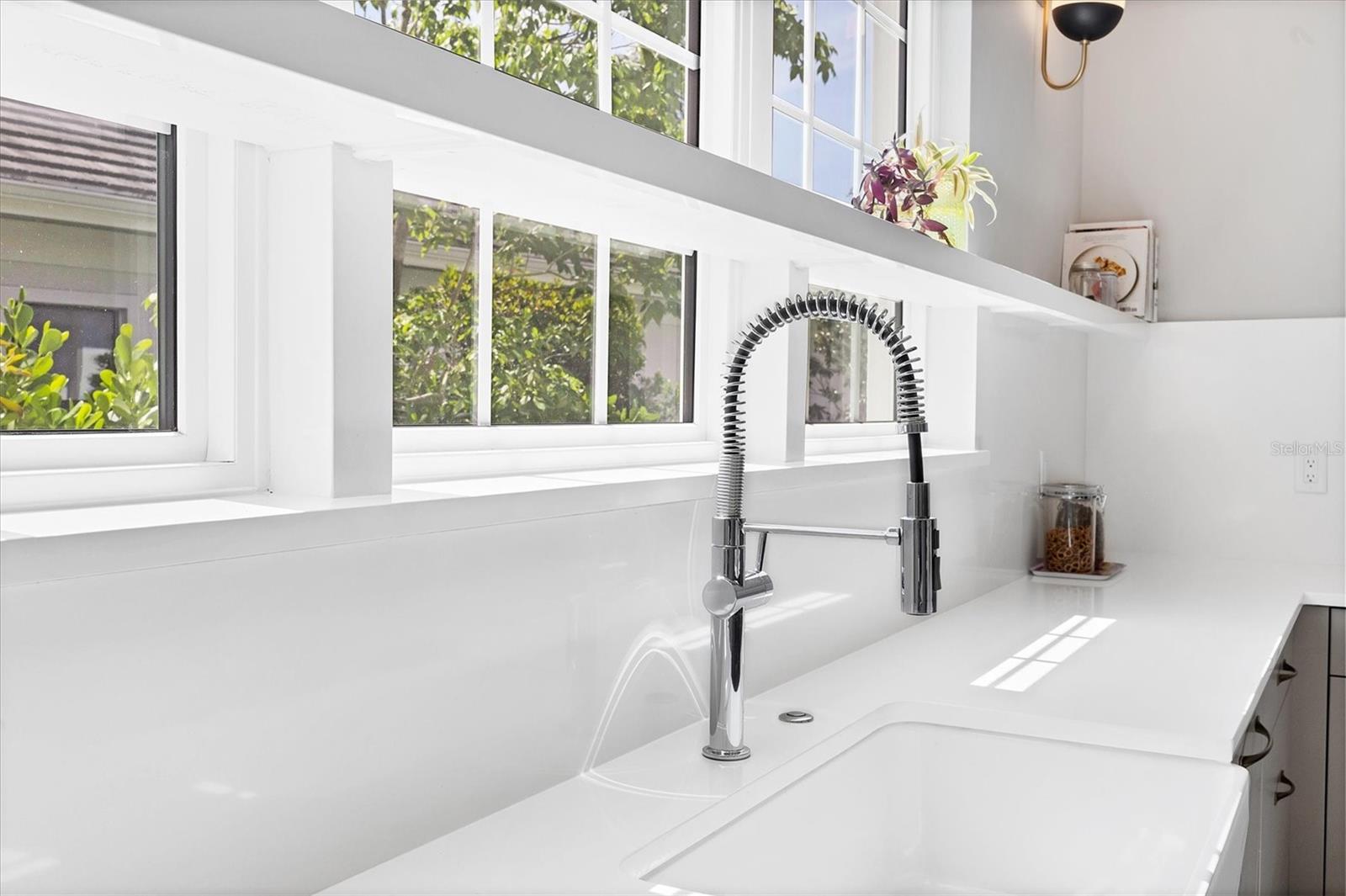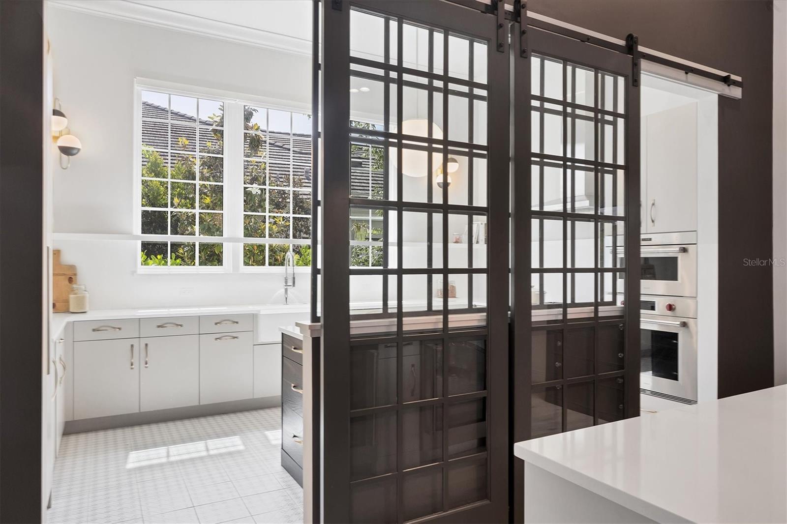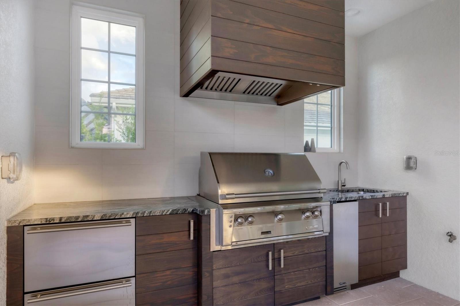 Exterior: Lighting, Outdoor Grill, Outdoor Kitchen, Sidewalk, Sliding Doors