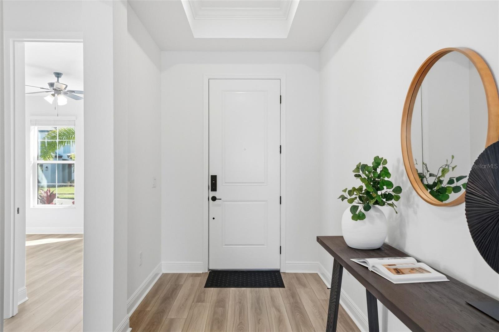 Experience refined Florida living in this exceptionally upgraded Calusa model by M/I Homes, perfectly situated on one of Sweetwater's most desirable water front homesites. This 4-bedroom, 3-bath custom model quality home has over $117,000 in custom enhancements that elevate comfort and style! From its Sierra-style paver driveway and tropical landscaping to the sleek modern elevation, every detail exudes curb appeal. Impact-rated windows and sliders offer year-round peace of mind, no shutters required.Inside, the gourmet kitchen is a showpiece with a waterfall-edge quartz island, herringbone tile backsplash, Sonoma-painted cabinetry with light rail, and GE Profile stainless gas appliances.The owner's suite provides a tranquil retreat featuring a spa-inspired bath with Cambria quartz counters, a frameless glass shower with matte black fixtures, and a custom-designed walk-in closet. An ensuite guest bedroom offers privacy and versatility, while also featuring a professionally installed custom closet.Elegant details continue throughout the home including, luxury vinyl plank flooring, 8' interior doors, crown molding in tray ceilings, upgraded matte black hardware, lighting, tankless water heater, SmartShield structured wiring, and pre-plumbed outdoor kitchen rough in. Step outside to the expanded lanai, where peaceful water views set the stage for morning coffee or evening gatherings.Located within the vibrant Sweetwater community of Lakewood Ranch, residents enjoy resort-style amenities, walking trails, and convenient access to top-rated schools, dining, and entertainment.