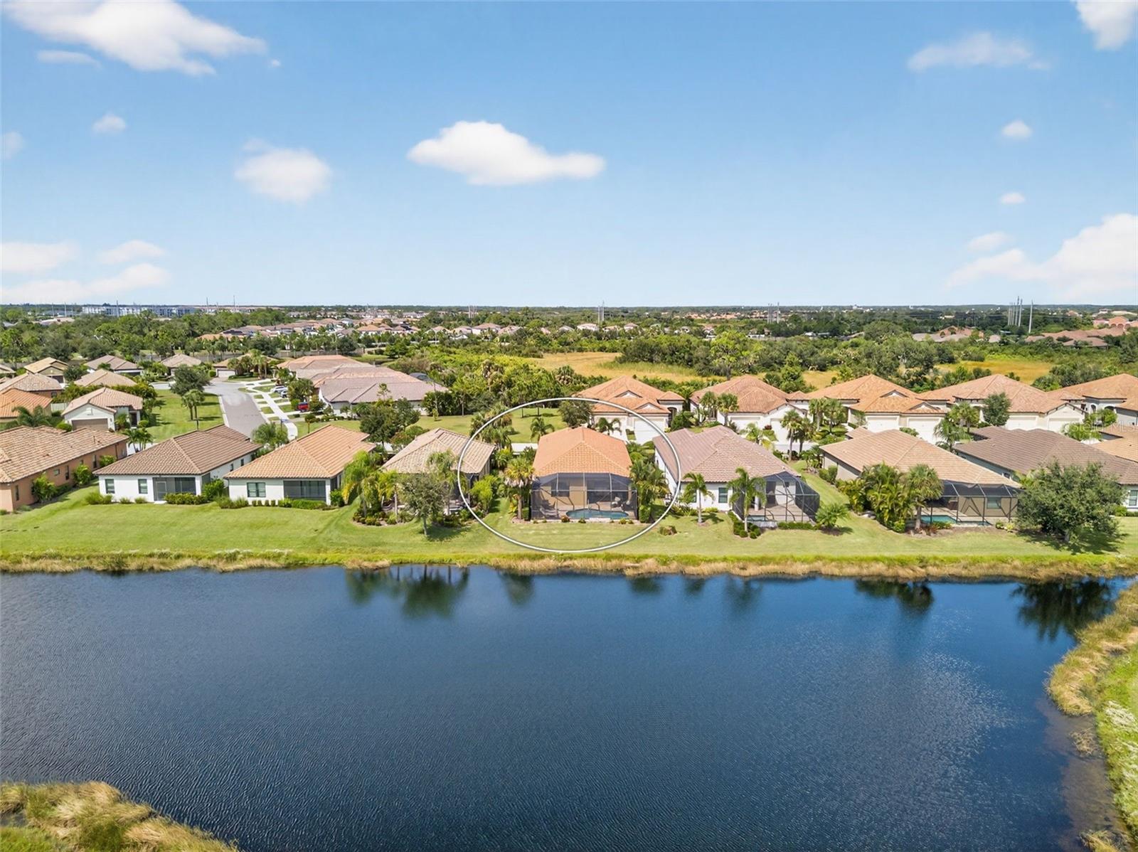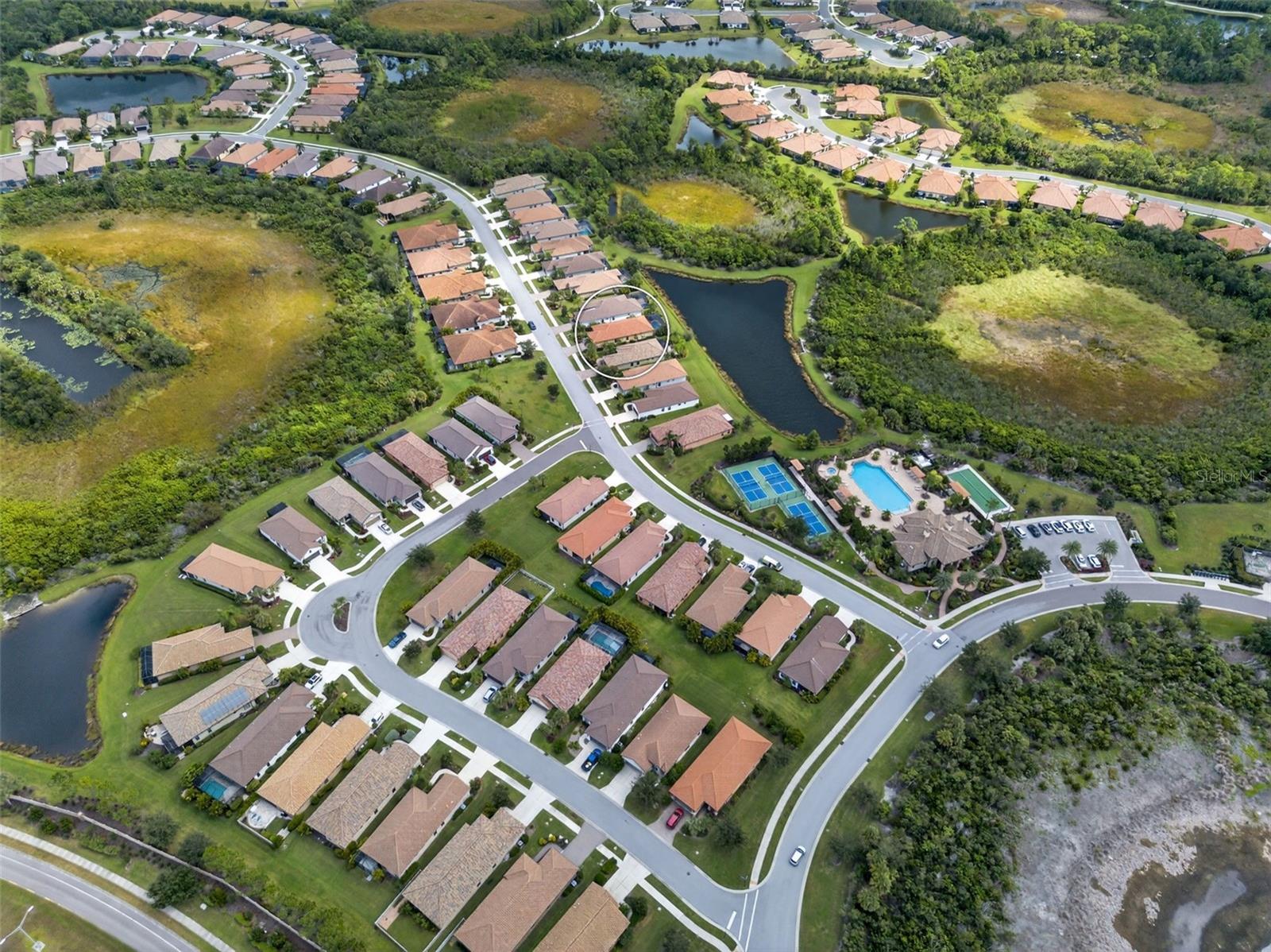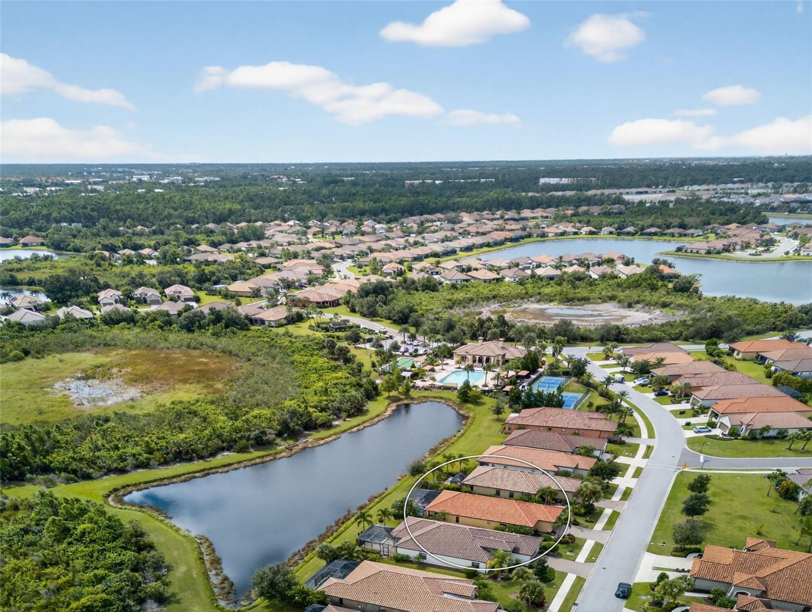 Step into the home that set the standard for Milano. This former model features the premium upgrades and lakefront setting that once welcomed prospective buyers, now ready for you to call home.An arched front porch and glass entry door open to a spacious foyer with immediate sightlines to the lake through triple pocket sliders. The open floor plan features a great room with coffered ceilings, wood detailing, and plank tile flooring that flows throughout the main living areas.The kitchen includes white wood cabinetry with crown molding and under-cabinet lighting, tile backsplash, stainless appliances, center island, a large walk-in pantry, and breakfast bar. The dining area features a shiplap accent wall. A den with French glass doors provides flexible space for an office or study.The primary suite offers dual walk-in closets, a shiplap accent wall, and an ensuite with a glass-enclosed walk-in shower. Two additional bedrooms have walk-in closets and share a full bathroom. The utility room includes cabinetry and storage.The screened lanai overlooks the lake and includes a heated saltwater pool (heater installed 2021). Milano offers resort-style amenities: clubhouse, community pool and spa, fire pit, bocce and pickleball courts, and dog park. Low HOA fees, no CDD, and close to beaches, I-75, downtown Venice, and top-rated schools.