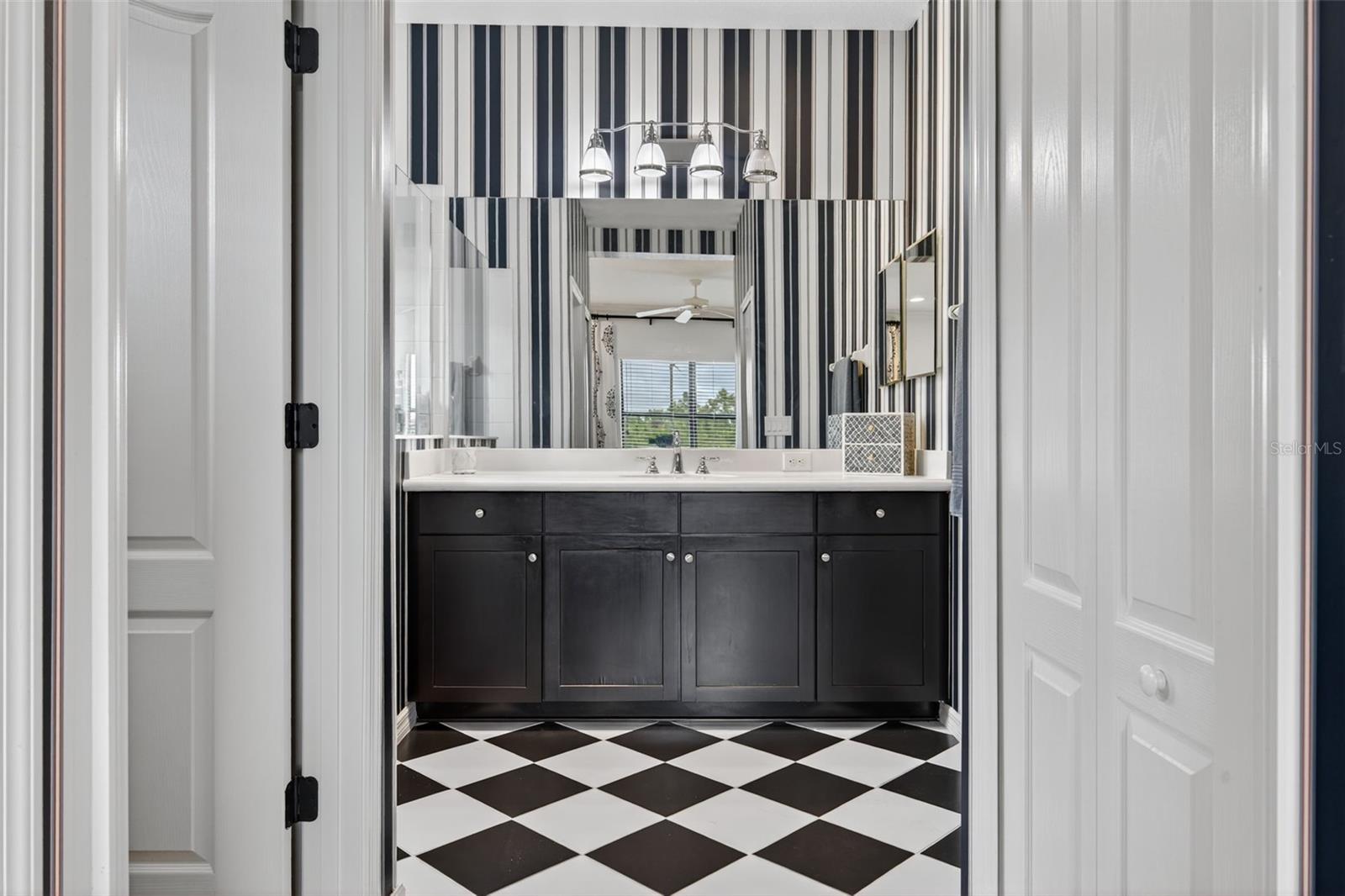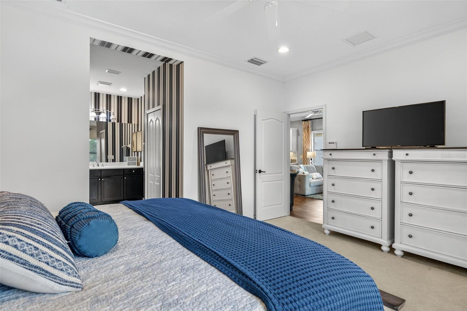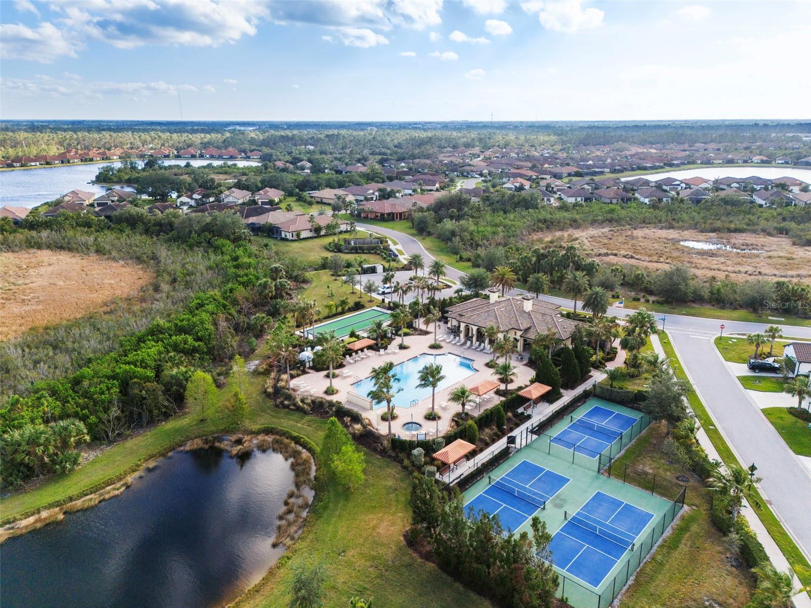 Step into the home that set the standard for Milano. This former model features the premium upgrades and lakefront setting that once welcomed prospective buyers, now ready for you to call home.An arched front porch and glass entry door open to a spacious foyer with immediate sightlines to the lake through triple pocket sliders. The open floor plan features a great room with coffered ceilings, wood detailing, and plank tile flooring that flows throughout the main living areas.The kitchen includes white wood cabinetry with crown molding and under-cabinet lighting, tile backsplash, stainless appliances, center island, a large walk-in pantry, and breakfast bar. The dining area features a shiplap accent wall. A den with French glass doors provides flexible space for an office or study.The primary suite offers dual walk-in closets, a shiplap accent wall, and an ensuite with a glass-enclosed walk-in shower. Two additional bedrooms have walk-in closets and share a full bathroom. The utility room includes cabinetry and storage.The screened lanai overlooks the lake and includes a heated saltwater pool (heater installed 2021). Milano offers resort-style amenities: clubhouse, community pool and spa, fire pit, bocce and pickleball courts, and dog park. Low HOA fees, no CDD, and close to beaches, I-75, downtown Venice, and top-rated schools.