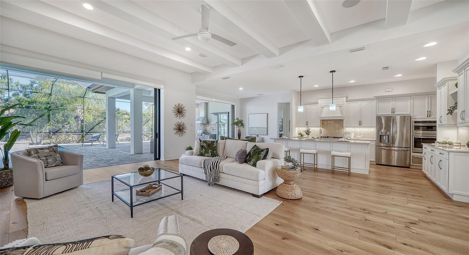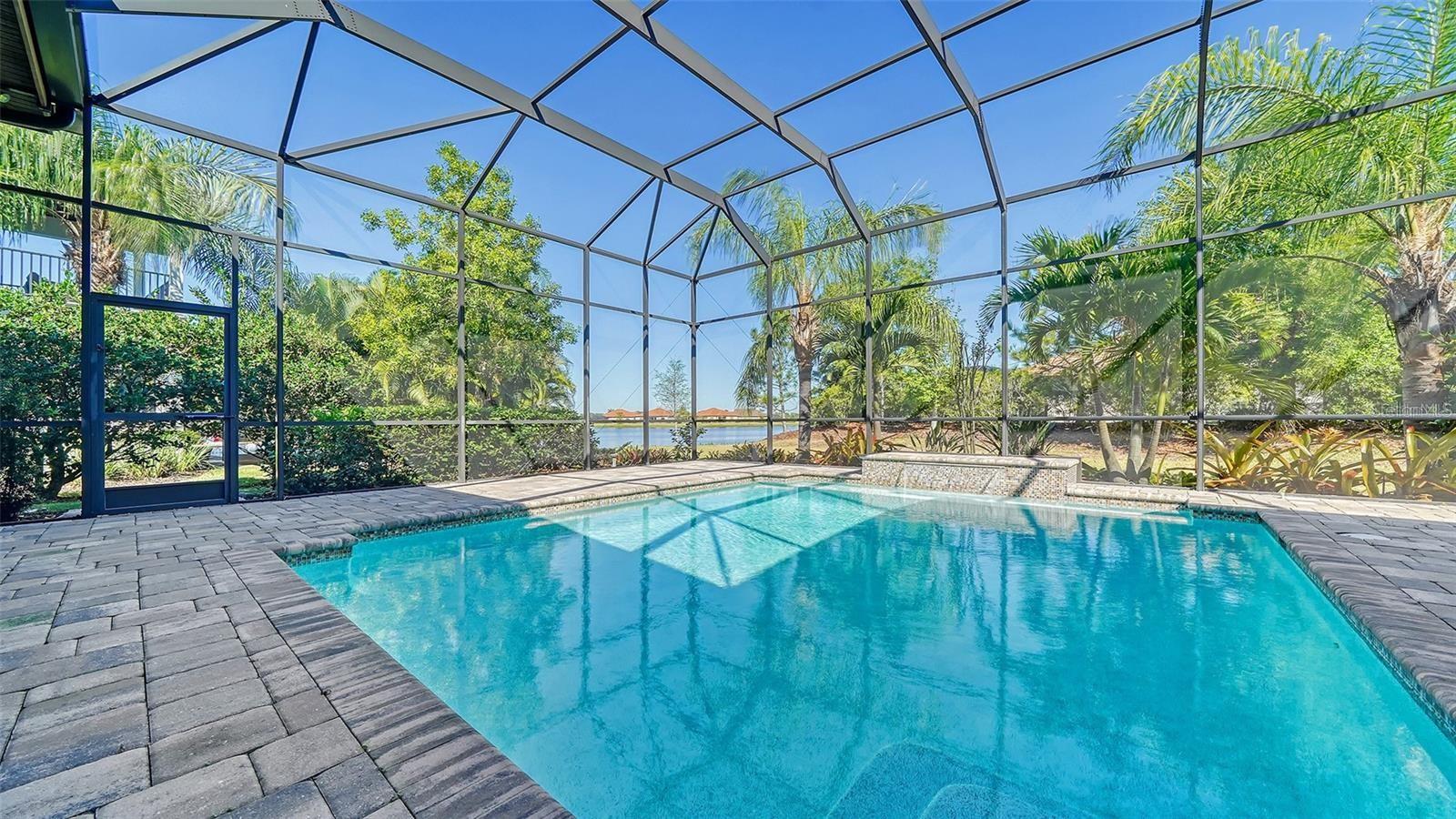 Discover your own piece of paradise in this stunning custom pool home, nestled within the serene confines of the gated community of Country Club East. Boasting meticulous maintenance and situated on an expansive corner lot within a gated community, this 2017-built Chandler model by Stock Homes presents a luxurious retreat with 4 bedrooms, 4.5 baths, and a 3-car garage. Embrace the privacy of this residence, where no neighbors flank one side, allowing for uninterrupted enjoyment of breathtaking water views and abundant natural light flooding in from every angle. The grand entrance, marked by double glass doors and a sprawling paver driveway, welcomes you into over 3,150 square feet of meticulously designed living space spread across a single level. Inside, soaring ceilings and warm wood floors set the stage for elegant living and dining areas, complemented by oversized sliders and custom lighting that accentuate the open layout. Safety and peace of mind are assured year-round with hurricane impact glass throughout. A gourmet chef's kitchen beckons with custom cabinets, quartz countertops, and top-of-the-line GE Profile appliances, including a refrigerator, range, double oven, and warming drawer. Step outside to discover a captivating outdoor oasis, complete with a generous pool featuring cascading water features, an expansive outdoor kitchen equipped with a refrigerator, sink, and extractor fan, and over 500 square feet of covered patio space, all overlooking a private lake. The oversized owner's suite is a sanctuary unto itself, boasting premium lake views, dual walk-in closets, and a spa-inspired en-suite bath with his-and-hers vanities, a walk-in shower, and a soaking tub. Three additional spacious bedrooms, each with its own ensuite bath, provide comfortable accommodations for family and guests. The fourth bedroom is currently used as a bonus room with 90 degree sliders to the lanai. Additional features include a 240-volt outlet in the large 3-car garage, a storage closet, utility sink, and custom fan. Other highlights include a large laundry room, tankless water heater, central speaker system, plantation shutters, crown and custom molding, custom cabinets in the fourth bedroom, and a whole-house water filtration system. Country Club East offers resort-style living with amenities such as three pools, fitness center and club room, all within a tranquil setting just moments away from Sarasota's vibrant dining, entertainment, and cultural offerings. With A+ rated schools, world-class beaches, and an array of recreational and medical facilities nearby, seize this opportunity to make this exceptional property your own in Lakewood Ranch.
