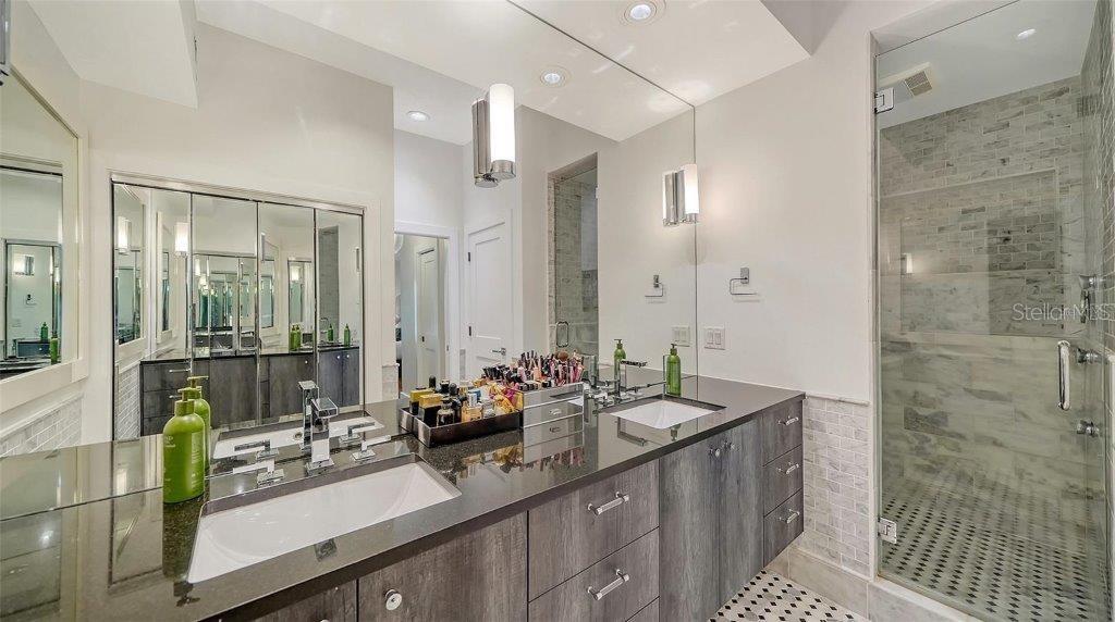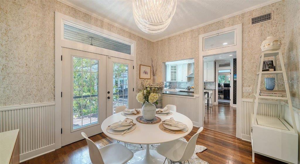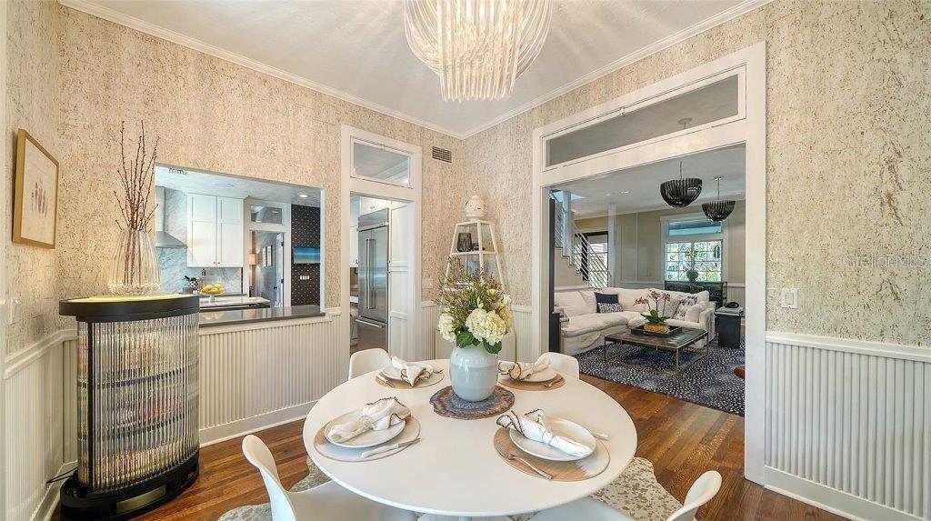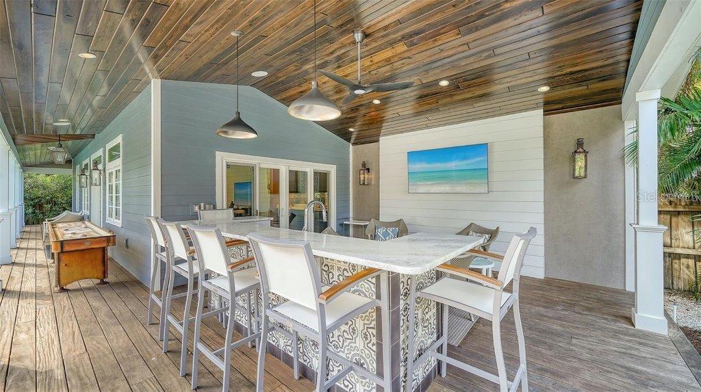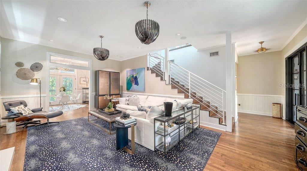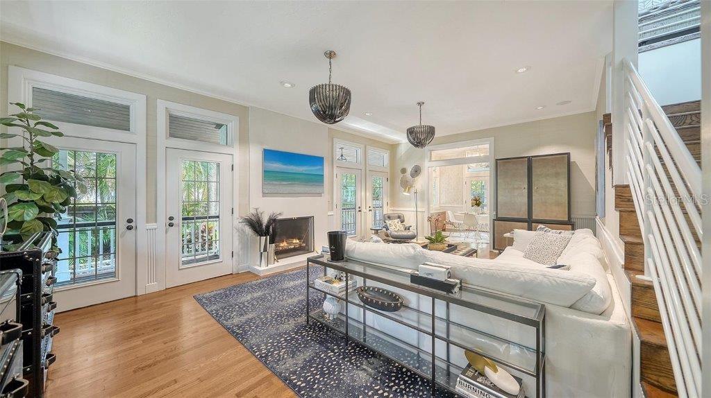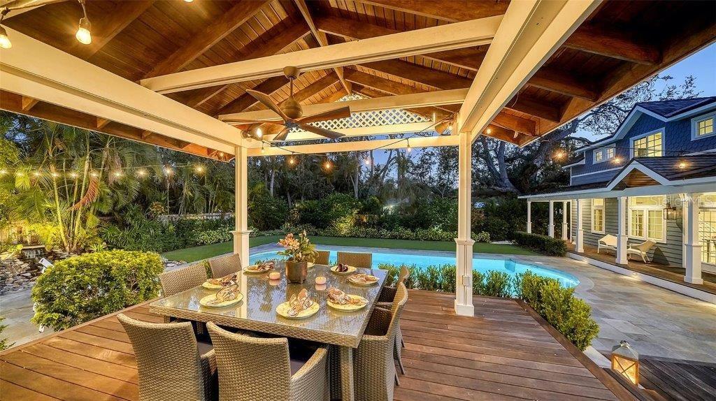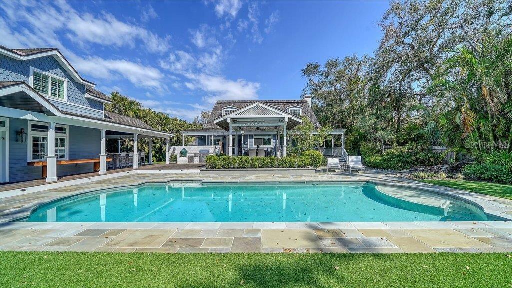 Welcome to this rarely available Cape Cod-style residence, comprised of a masterfully renovated main house and separate luxe guest house poised on an expansive 20,000 sq. ft. lot in Sarasota's prestigious Cherokee Park. Elevated 23 feet above sea level and nestled on a wide, tree-lined street in the coveted West of Trail district--within the top-rated Southside school zone--this 4-bedroom, 3 full/2 half bath +office private compound blends timeless architecture with designer-curated sophistication. A stately front porch framed by lush landscaping and classic brick walkway introduces the home with understated grandeur. Handcrafted, glass-inlaid iron double doors open to a refined foyer where natural light, elegant millwork, and soaring 10-foot ceilings set the tone for the bespoke interiors beyond. Inside, original hardwood floors, designer lighting by Arteriors, Eichholtz, and Kelly Wearstler, and high-end finishes selected by Chelsea Dunbar of Blu Interiors create a sense of warmth and refinement throughout. The quartz-clad chef's kitchen is as functional as it is beautiful, featuring a Wolf natural gas range, KitchenAid French-door refrigerator, ample pantry space, and custom cabinetry--perfectly suited for both intimate dining and entertaining. Anchored by a wood-burning fireplace, the main living and dining spaces flow seamlessly outdoors to an inviting Pennsylvania bluestone patio, low-maintenance Astroturf lawn, and wrap-around Brazilian teak deck--an idyllic setting for year-round enjoyment. The serene first floor primary suite is a private retreat showcasing three custom-designed walk-in closets and a spa-inspired bath with marble finishes, dual vanities, heated towel bar, and a zero-entry shower with body sprays. Ascend the custom staircase to find 2 tailored guest retreats with spa-like bath, each offering serene views and thoughtfully appointed details for ultimate comfort and privacy. Throughout the home, custom wallcoverings by Phillip Jeffries, Scalamandr, and litis add layers of texture and artistry, while upgraded systems--including a surround sound system, six climate zones, and multiple laundry areas--enhance everyday comfort. Resort-style living continues outdoors with a 9-foot-deep pool framed by classic Bevolo gas lanterns and an extraordinary luxury guest house built in 2016. This refined space includes an entertaining area with custom built-ins, full bar, refrigerator drawers, Scotsman icemaker, private guest suite, 1.5 baths, gym, and an outdoor teak shower. The fully equipped outdoor kitchen features a natural gas Lynx grill, XL Green Egg, quartzite prep counters, and a covered gazebo ideal for al fresco dining. All impact doors and windows, cedar shake roof, and Hardie Board siding add to the beauty and durability of the home. Completing this exceptional estate is an oversized 2.5-car detached garage and secure, fully fenced grounds with electric fence. Enjoy tree-lined streets with sidewalks and a true sense of community, all just a short stroll or golf cart ride to Southside Village where residents enjoy boutique shops, Morton's Gourmet Market, cafs, and top-rated restaurants, and minutes from downtown Sarasota and Siesta Key Beach. This is refined Gulf Coast living--where timeless architecture meets effortless luxury in one of Sarasota's most treasured neighborhoods.