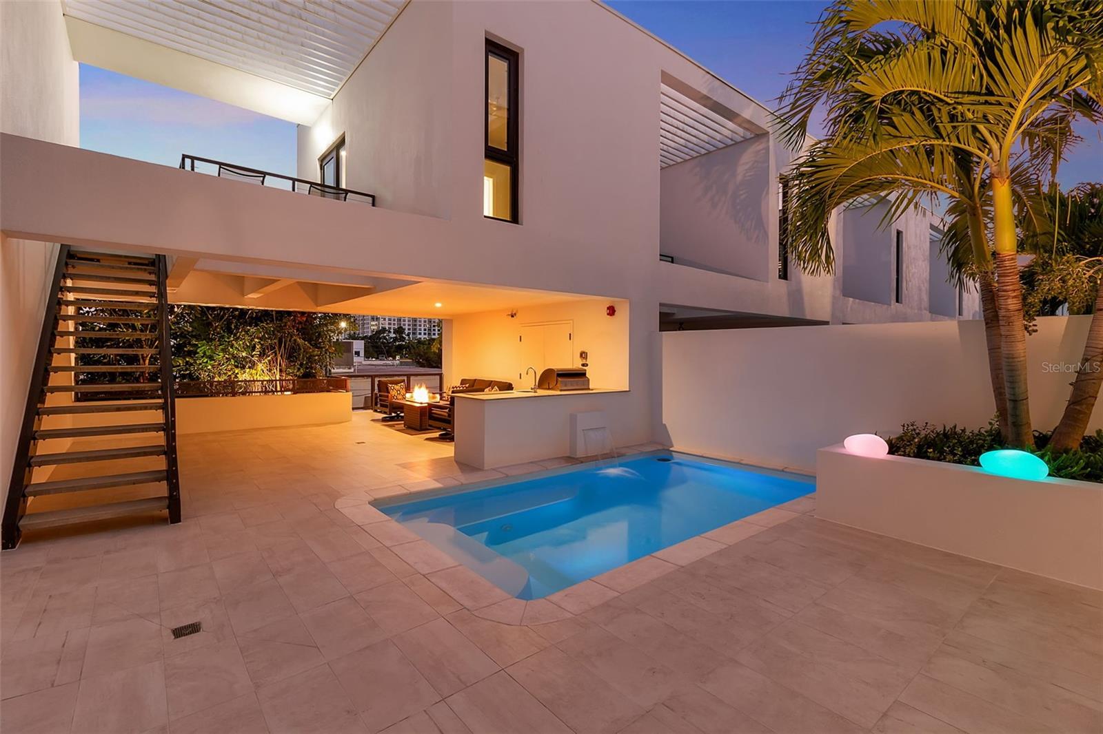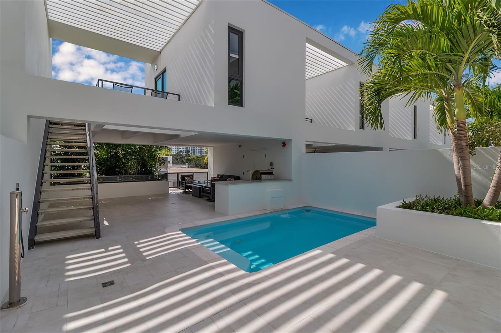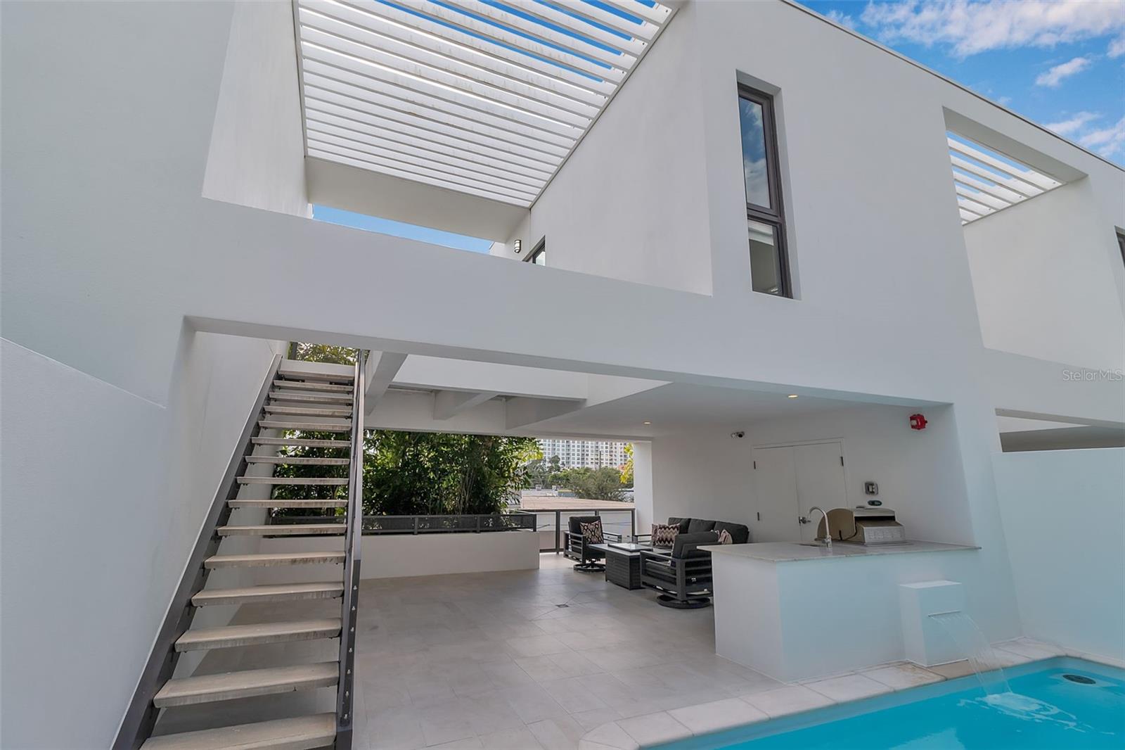 Anchored in Sarasota's vibrant Rosemary District, a hub of art, dining, and design just steps from downtown, this contemporary three-story residence captures the essence of urban coastal living. Defined by its clean architectural lines, striking white faade, and geometric precision, it offers a rare balance of privacy and proximity in one of Sarasota's most walkable neighborhoods. A sleek iron-and-glass entry framed by textured tile sets the tone for what's inside: light, volume, and effortless connection to the outdoors. The floating staircase, with open risers and maple treads, becomes a sculptural centerpiece beneath ceilings that soar up to 13 feet. A three-stop elevator ensures convenience from the ground-level garage to the uppermost terrace. The main living level unfolds with gallery-like openness, a seamless blend of style and function. The sleek kitchen, featuring quartz countertops, premium stainless-steel appliances, and clean-lined cabinetry, overlooks the dining and great room. The open living space is complete with expansive sliders open directly to the courtyard and its tranquil Zen pool, where the rhythm of water and greenery softens the modern form. With its summer kitchen, fire table, and covered dining terrace, the home transitions effortlessly from quiet mornings to lively evenings. Upstairs, the primary suite feels like a retreat, complete with a glass-framed balcony, spa-inspired bath, and thoughtful details that invite calm. Two additional guest rooms, one that is currently used as an office, mirror the home's minimalist aesthetic and abundant natural light. A private guest casita, accessible from the courtyard, expands the home's flexibility. With a kitchenette, full bath, and its own balcony, it's ideal for visitors, another primary suite or a fitness space, all with the independence of a separate entry. Constructed of concrete and steel with impact-rated glass, every element underscores quality and low-maintenance design, perfect for those seeking the ease of a lock-and-leave lifestyle. Positioned in Sarasota's coveted Rosemary District, one of Sarasota's most walkable neighborhoods, this residence places the best of the city just outside your door. Stroll to downtown dining, art galleries, live music, and cultural venues, or stop by the weekly Sarasota Farmers Market. Boutique shops, theaters, and cafs line the nearby streets, while the beaches, the John Ringling Bridge, St. Armand's Circle, and Sarasota Bay are only minutes away. With convenient access to Sarasota Bradenton International Airport, this address perfectly blends urban luxury, outdoor living, and strong architectural design, offering a downtown modernism that feels both refined and deeply livable.