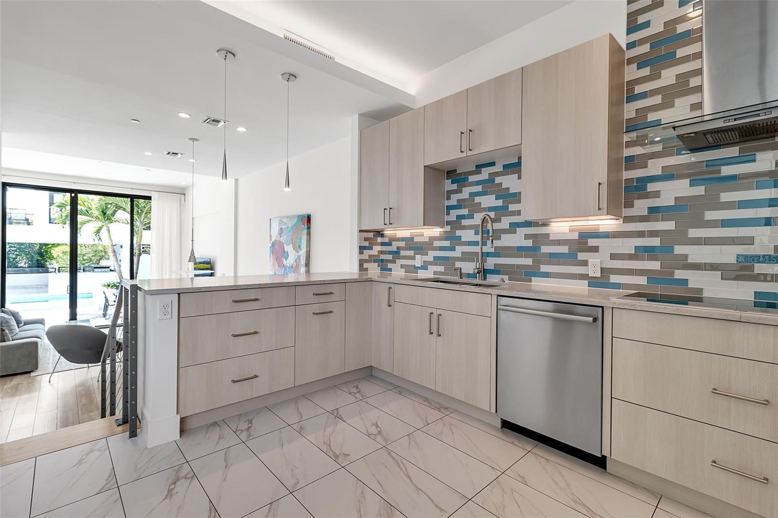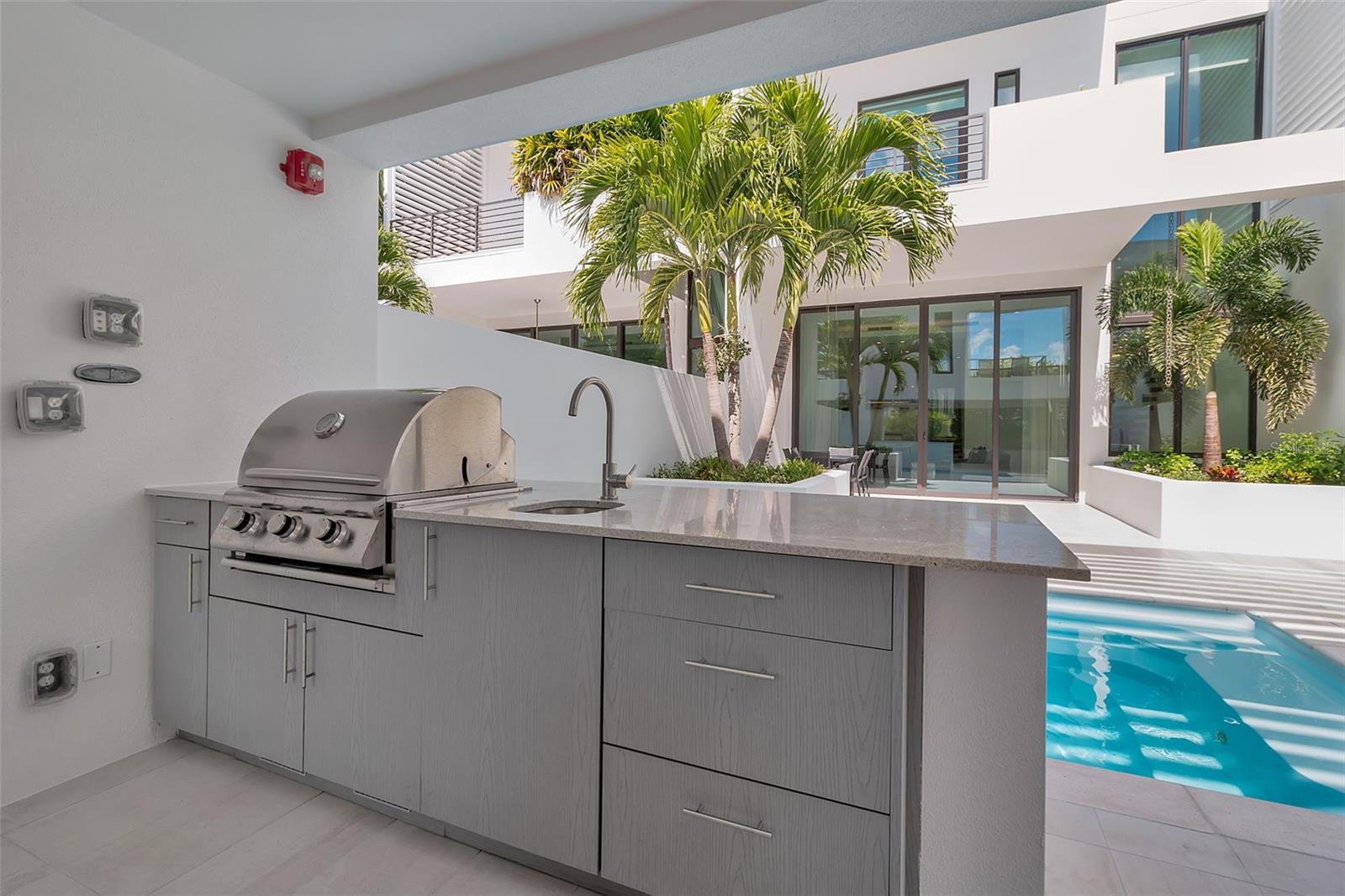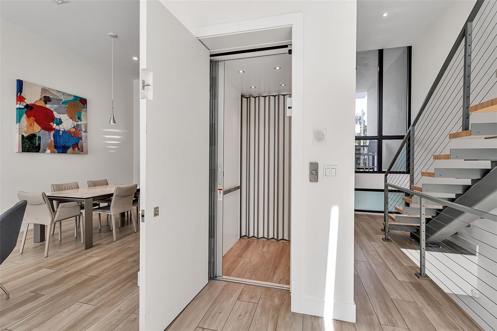 Anchored in Sarasota's vibrant Rosemary District, a hub of art, dining, and design just steps from downtown, this contemporary three-story residence captures the essence of urban coastal living. Defined by its clean architectural lines, striking white faade, and geometric precision, it offers a rare balance of privacy and proximity in one of Sarasota's most walkable neighborhoods. A sleek iron-and-glass entry framed by textured tile sets the tone for what's inside: light, volume, and effortless connection to the outdoors. The floating staircase, with open risers and maple treads, becomes a sculptural centerpiece beneath ceilings that soar up to 13 feet. A three-stop elevator ensures convenience from the ground-level garage to the uppermost terrace. The main living level unfolds with gallery-like openness, a seamless blend of style and function. The sleek kitchen, featuring quartz countertops, premium stainless-steel appliances, and clean-lined cabinetry, overlooks the dining and great room. The open living space is complete with expansive sliders open directly to the courtyard and its tranquil Zen pool, where the rhythm of water and greenery softens the modern form. With its summer kitchen, fire table, and covered dining terrace, the home transitions effortlessly from quiet mornings to lively evenings. Upstairs, the primary suite feels like a retreat, complete with a glass-framed balcony, spa-inspired bath, and thoughtful details that invite calm. Two additional guest rooms, one that is currently used as an office, mirror the home's minimalist aesthetic and abundant natural light. A private guest casita, accessible from the courtyard, expands the home's flexibility. With a kitchenette, full bath, and its own balcony, it's ideal for visitors, another primary suite or a fitness space, all with the independence of a separate entry. Constructed of concrete and steel with impact-rated glass, every element underscores quality and low-maintenance design, perfect for those seeking the ease of a lock-and-leave lifestyle. Positioned in Sarasota's coveted Rosemary District, one of Sarasota's most walkable neighborhoods, this residence places the best of the city just outside your door. Stroll to downtown dining, art galleries, live music, and cultural venues, or stop by the weekly Sarasota Farmers Market. Boutique shops, theaters, and cafs line the nearby streets, while the beaches, the John Ringling Bridge, St. Armand's Circle, and Sarasota Bay are only minutes away. With convenient access to Sarasota Bradenton International Airport, this address perfectly blends urban luxury, outdoor living, and strong architectural design, offering a downtown modernism that feels both refined and deeply livable.