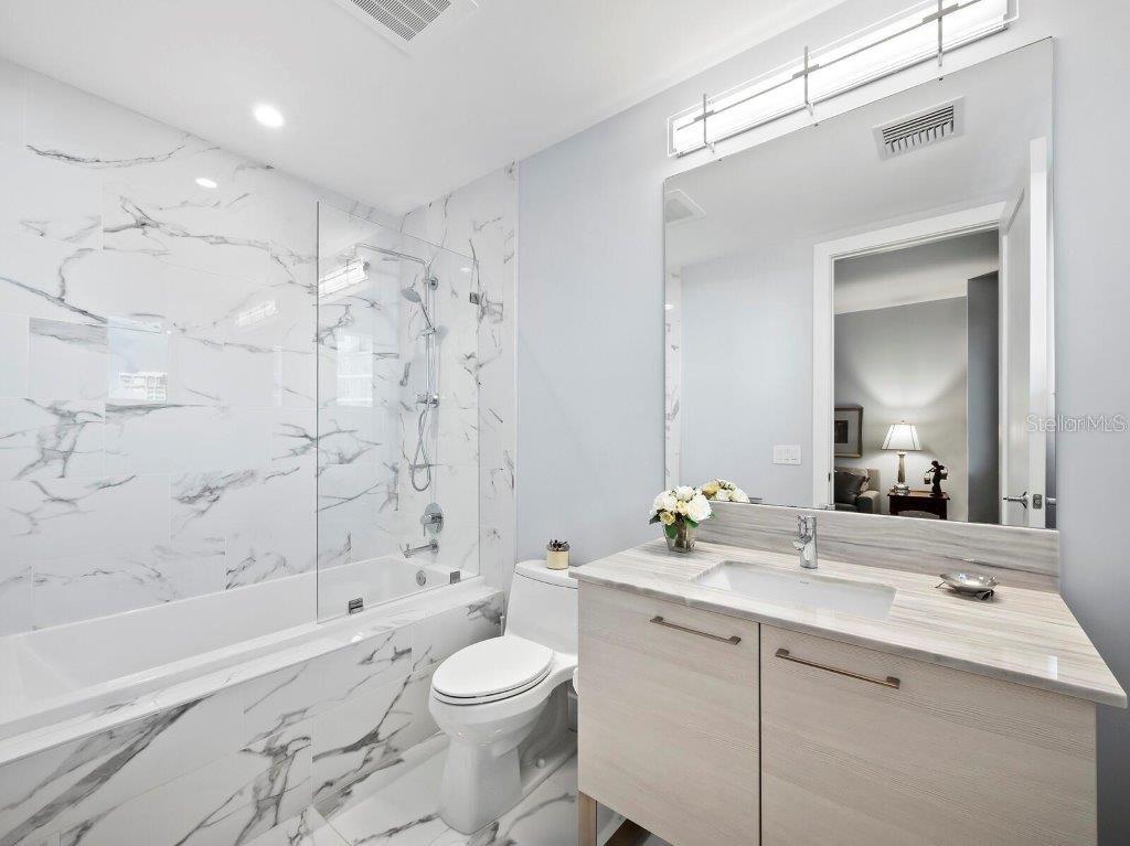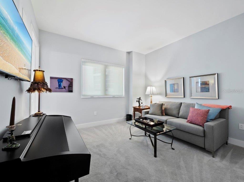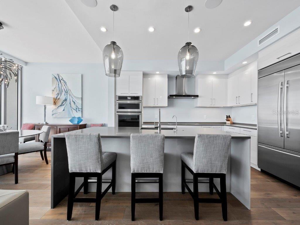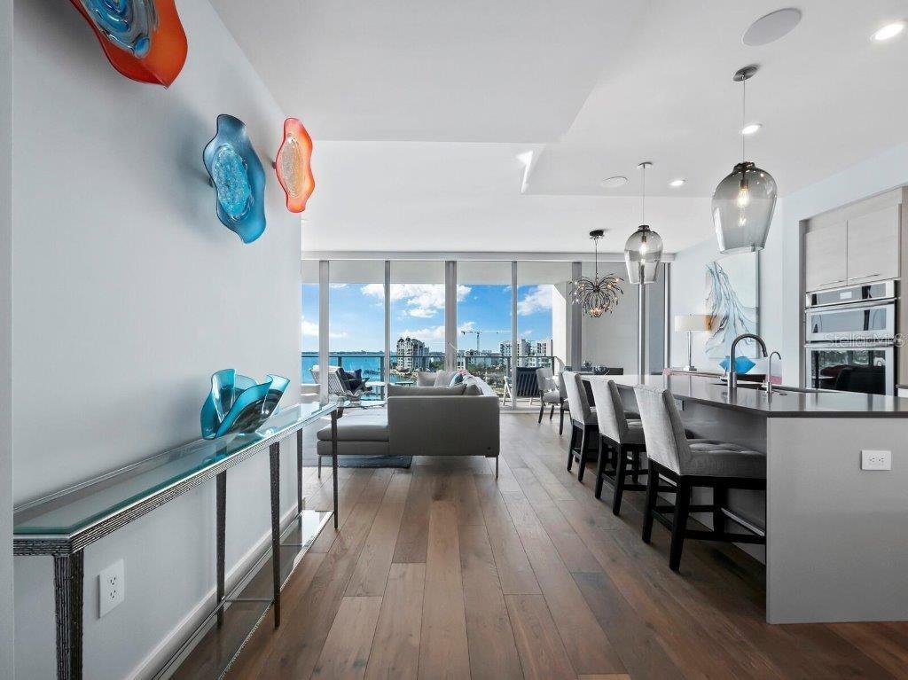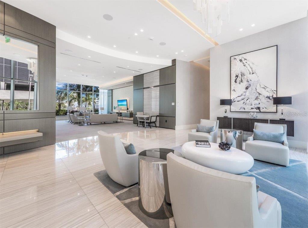 A fabulously appointed designer residence in a coveted, amenity-rich building, VUE 703 offers the pinnacle of luxury living in the heart of Sarasota's cosmopolitan downtown. Now available turnkey with luxury furnishings and accessories. Renowned for its exceptional resort-style living and elegant contemporary style, VUE is an incredible high-rise building with enviably curated amenities that extend from the valet service and concierge to plush resident lounges and facilities, all within steps of Sarasota's world-class cultural scene and thriving hub of shops, restaurants, and galleries. This elevated residence with private elevator access is a spacious retreat that blends the sleek modern style of the building with exquisite design elements that lend warmth and enhance the luxurious comfort. Premium upgrades include elegant wide-plank wood floors, designer lighting and dcor-both by Creston; high-end built-in audio video system, water filtration by Aqua, while tall 10' ceilings throughout accentuate absolutely stunning water views. From the front door, unobstructed site lines showcase spectacular southwest vistas across Sarasota Bay and the keys to the Gulf of Mexico beyond. Thoughtfully designed to maximize the views, the home features an airy, open layout with a full wall of floor-to-ceiling sliding impact glass doors that extend the central living space to a deep private terrace with glass railings. Overlooking the dining and central living spaces, the gourmet kitchen with beautiful Italian cabinetry and stainless appliances wraps around a large quartz-clad island with abundant prep and storage space as well as additional seating for guests. The open plan living room and dining area are perfect for entertaining, flowing seamlessly to a private terrace that spans nearly 300 square feet with protective shade and picture-perfect views overlooking the waterfront and marina. The owners' suite enjoys its own floor-to-ceiling wall of windows for spectacular water and sunset views, with a resort-style bathroom that features extra-long double vanity, enviable storage, glass-enclosed walk-in shower, and separate water closet. Two separate walk-in closets add to the owners' luxury. Near the home's entry, a spacious second bedroom offers en suite comfort and ample closet space, and a separate den accommodates a private office or media lounge. The additional half bath is luxuriously outfitted with haute design elements including crystal sconces and a carved onyx sink. A generous, separate utility room with washer and dryer adds to the exceptional in-home conveniences. The residence comes with deeded, secure storage space and two assigned parking spaces that are gated and enclosed. Ideally located across from Sarasota's celebrated waterfront and within steps of Downtown's cosmopolitan core, VUE is a highly sought after address with a dazzling array of premium amenities including heated pool and spa with a spectacular pool deck that encompasses multiple lounge areas, fire pit, and enormous pergola with gourmet grill station. Additional amenities include fitness center, dedicated pet recreational area, concierge and security. Offered by the original owners, meticulously maintained and upgraded, VUE 703 is a valuable opportunity to enjoy a lifestyle of ultimat comfort and style.