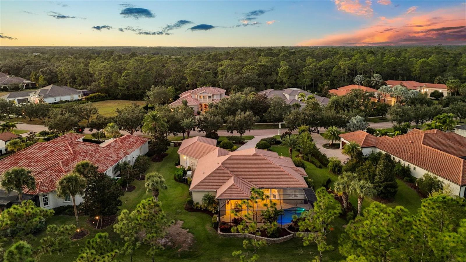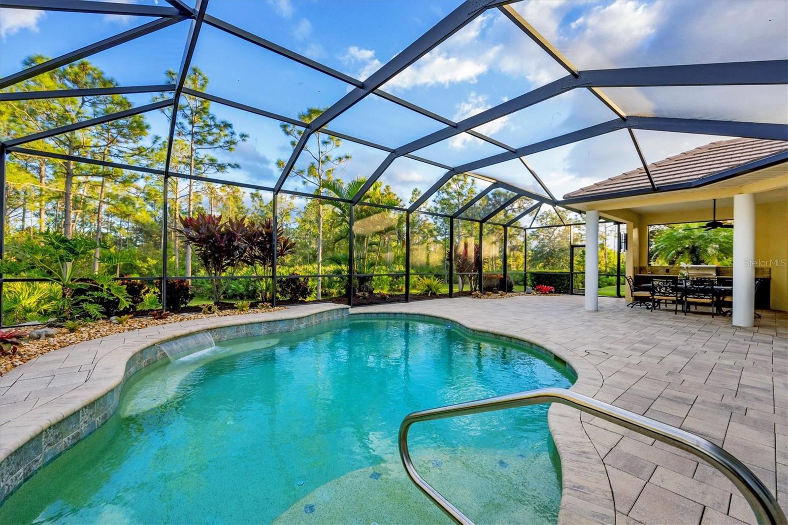 This stunning three-bedroom, three-bath home with a private office offers elegant single-story living designed for comfort, style, and seamless indoor-outdoor enjoyment. The open-concept floor plan welcomes you with custom glass double entry doors, soaring tray ceilings, designer lighting, and expansive living and dining areas that flow effortlessly to the oversized screened lanai. Framed by lush tropical landscaping, this large private lot with tranquil preserve offers an outdoor retreat featuring a heated, saltwater pool, covered entertaining spaces, and a fully equipped outdoor kitchen, ideal for quiet mornings and evening gatherings. Inside, the chef's kitchen serves as the heart of the home, showcasing custom cabinetry, quartz countertops, spacious island, large pantry, premium stainless steel appliances and a breakfast nook with aquarium window that allows a view to the lanai. The adjoining great room and dining area are filled with natural light, creating an inviting atmosphere for entertaining or relaxing. The primary suite offers a serene escape with lanai access, dual walk-in closets, and a spa-inspired bath featuring dual vanities, and an oversized walk-in shower. Two additional guest suites each include private baths, ensuring comfort and privacy for family and visitors. Additional features include a whole house generator, impact glass, elegant crown molding, upgraded fixtures, immaculate landscaping and an oversized 3.5-car garage with ample additional storage space. In the exclusive gated community of The Concession, this home offers a lifestyle defined by luxury and tranquility. Residents enjoy access to one of Florida's prestigious golf destinations, a Jack Nicklaus Signature course co-designed by Tony Jacklin, along with winding nature trails, refined dining at The Concession Golf Club, and a setting known for privacy, elegance and natural beauty, just minutes from Lakewood Ranch and Sarasota's finest beaches.