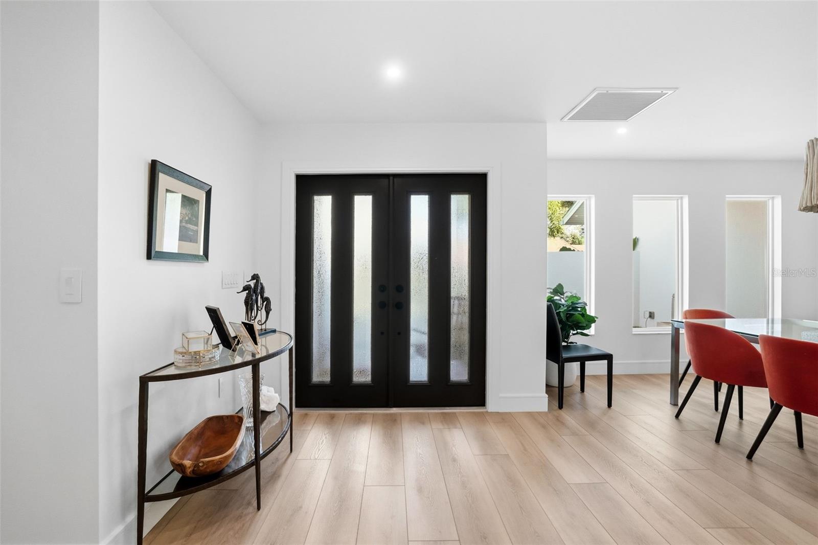 Welcome to this masterfully reimagined 3-bedroom, 3-bath residence in the prestigious, gated community of The Landings. Every detail of this home has been meticulously curated through a full-scale, down-to-the-studs renovation seamlessly blending timeless sophistication with today's most desirable comforts. Step inside to discover expansive, light-filled living spaces adorned with wide-plank luxury vinyl flooring backed with cork for exceptional comfort and durability. Thoughtful upgrades abound, including all-new electrical systems, energy-efficient LED lighting, and solid wood interior doors finished with designer Emtek hardware each element reflecting refined craftsmanship and enduring quality. The chef-inspired kitchen serves as the heart of the home, showcasing premium Bosch appliances, quartz countertops, a stylish apron-front sink, and a generous gathering island ideal for entertaining. The spa-worthy primary suite offers a serene retreat, featuring a freestanding soaking tub, custom built-in cabinetry, and a spacious walk-in closet. Each of the three bathrooms exudes understated elegance, highlighted by porcelain tile and elevated designer finishes. Outside, the property is equally impressive. A new roof and driveway, lush landscaping with professional lighting, and an upgraded well and irrigation system create a picture-perfect setting. The fully fenced backyard offers low-maintenance turf ideal for pets or play and a stunning chlorine pool with new surfacing, tile, and a heater/chiller for year-round enjoyment. The travertine paver patio provides both open-air and covered spaces for alfresco living, while the private entry courtyard with a tranquil fountain welcomes guests in true Florida style. Additional highlights include a well-appointed laundry room with extended countertops and a secondary refrigerator designed for both beauty and everyday ease. This residence exemplifies luxury living within one of Sarasota's most coveted communities where elegance, craftsmanship, and comfort converge.