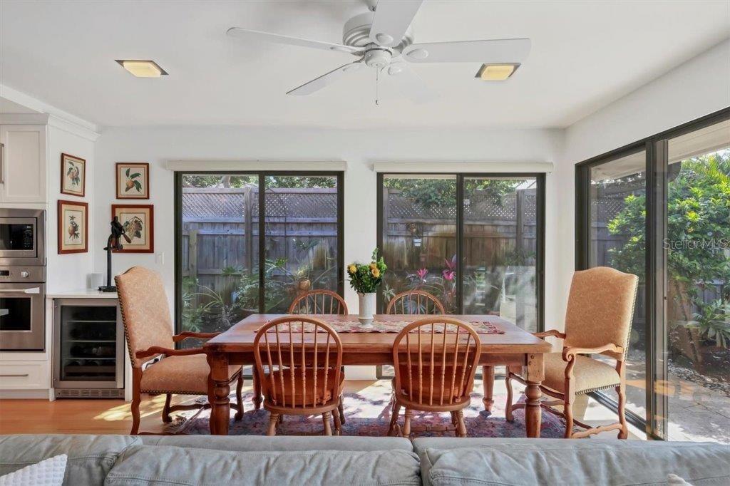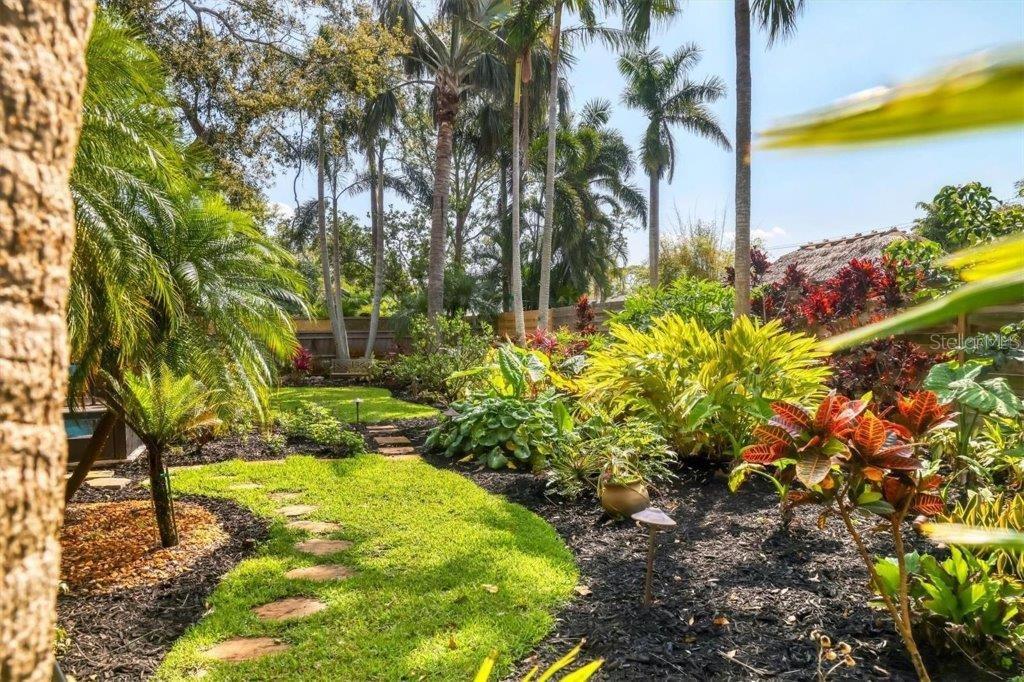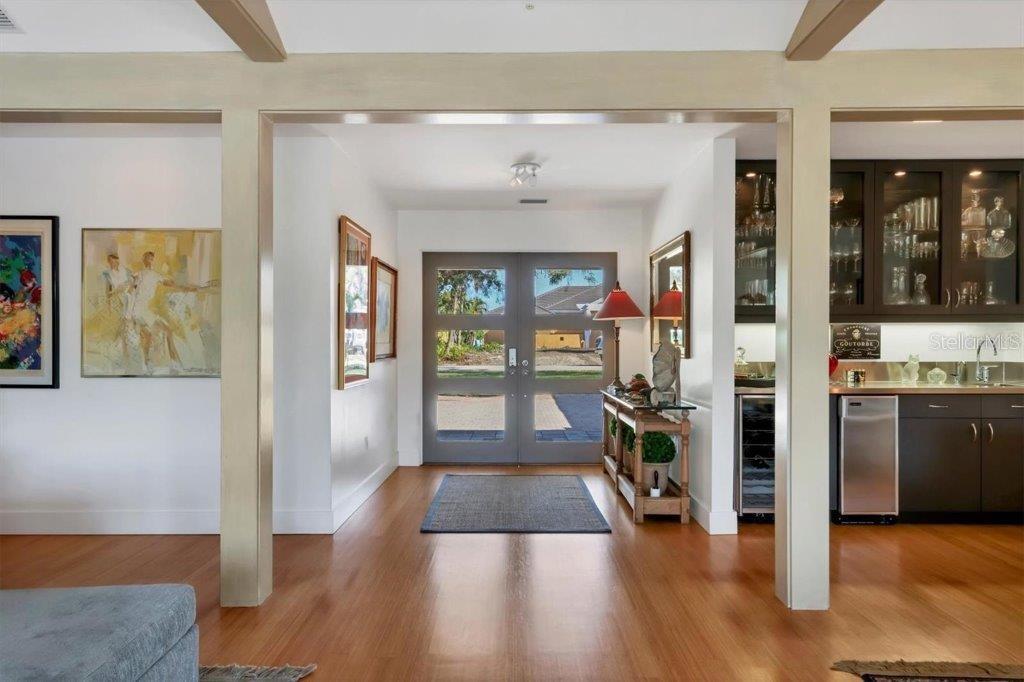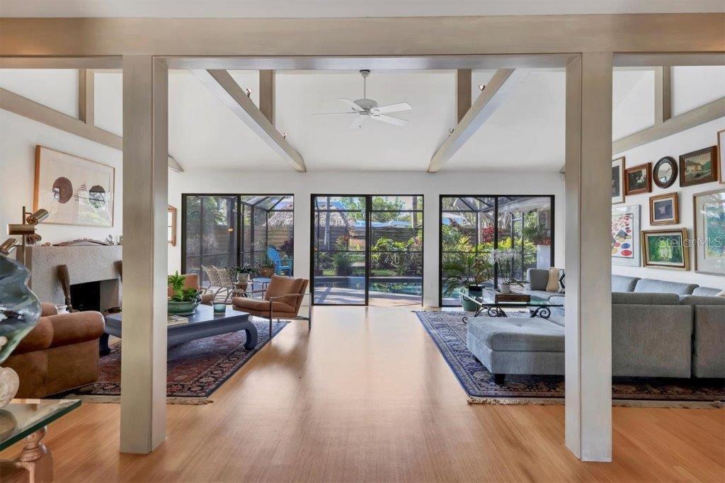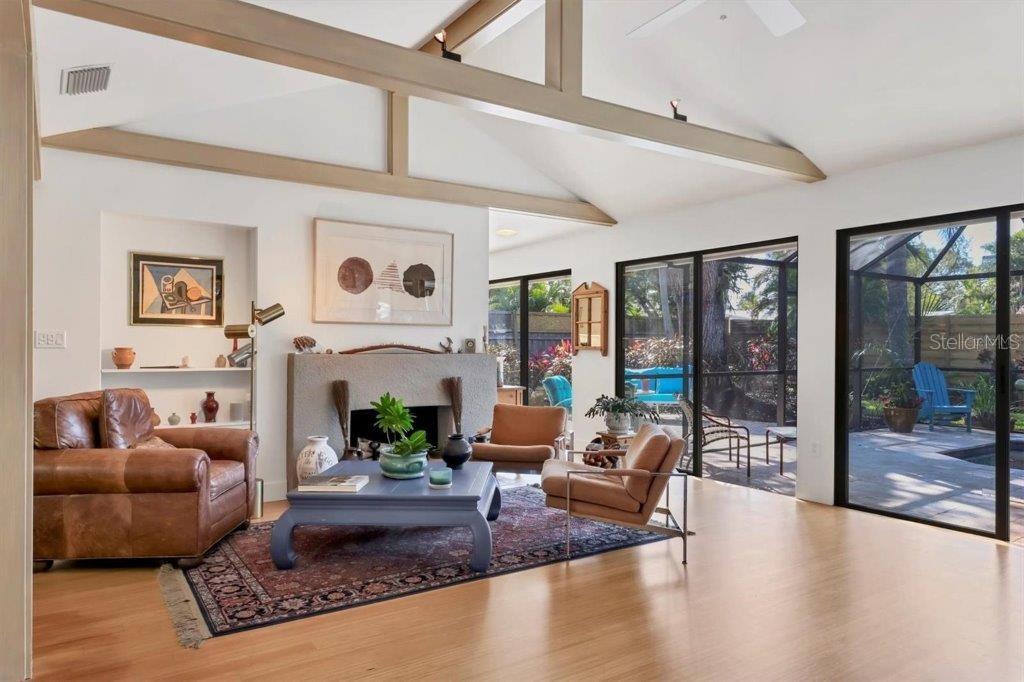 Nestled among towering oaks and mature landscaping sits this mid-century modern home. On an oversized lot with a pavered circular driveway, a fully fenced yard that is perfect for pets, and a side entry oversized 2 car garage. This updated home exudes both charm and sophistication. Boasting 9 sets of sliding glass doors, the views of the tropical gardens and outdoors blend seamlessly with indoor living... a true nod to Sarasota architecture. A large foyer leads to a living room with a vaulted and beamed ceiling, wood burning fireplace, with views of the caged pool and butterly garden, a gracious entertaining space. The updated kitchen features white cabinets, quartz counters and an oversized island with a breakfast bar and storage, Monogram gas cooktop, built-in oven, microwave, Bosch dishwasher, a large side-by-side Kitchen Aid refrigerator, and a wine cooler make this kitchen a cook's delight! Open to the family room, with uncompromised views of the outdoors, this space easily becomes the hub of casual dining. A cozy "office" complete with a built-in desk, 2 storage closets and windows also viewing the outdoors, is an added bonus. Bamboo floors throughout, updated baths, an abundance of storage space, an above ground hot tub and heated pool make this Oyster Bay Estates property special. Conveniently located close to the Field Club and Publix and all the fantastic amenities in the re-imagined Landings Shopping Center.
