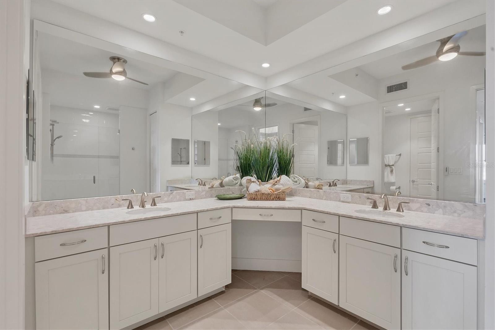 Experience lakefront sunsets and modern luxury in this top-floor penthouse at Waterfront at Main in Lakewood Ranch. Designed by Homes by Towne, the sought-after Eleuthera floor plan blends contemporary sophistication with relaxed coastal style, offering 3 bedrooms, 2.5 baths, and beautifully curated finishes throughout. Upon entry, tray ceilings, designer lighting, and warm wood flooring introduce an airy open concept where high ceilings and expansive windows fill the home with natural light. The dining area centers around a sleek linear fireplace, creating an intimate yet elegant setting that flows seamlessly into the living area and chef's kitchen. The kitchen is a showpiece, highlighted by a quartz waterfall-edge island with seating, GE Monogram stainless steel appliances, white cabinetry with pullouts, an electric cooktop, and a modern tile backsplash that completes the refined aesthetic. Six sliding glass panels open to a large, screened lanai with tile flooring and tranquil lake views, an inviting outdoor retreat ideal for morning coffee or sunsets. The primary suite impresses with double-door entry, two walk-in closets, a tray ceiling, and private access to the lanai. Its spa-inspired bath features dual sinks, a quartz-topped vanity with a makeup area, a walk-in shower, a private water closet, and designer tile finishes. Two additional bedrooms provide flexibility for guests or office space. Bedroom two includes plush carpet and an oversized closet, while bedroom three enjoys peaceful lake views and a ceiling fan. A stylish full bath with a tub/shower combination and a chic powder room with a barn door and designer vanity complete the layout. Additional highlights include an oversized laundry room with a frosted glass door, ample cabinetry, and counter space, as well as two covered parking spaces, an air-conditioned storage locker, dual A/C units, and two water heaters for enhanced comfort and convenience. Waterfront at Main offers gated entry and resort-style amenities, a saltwater pool, spa, outdoor firepit, clubhouse, and fitness center, plus a vibrant social calendar. Step outside to enjoy Lakewood Ranch Main Street's array of shops, dining, and entertainment, or take a short drive to Waterside Place, UTC, and Sarasota's world-famous beaches. This penthouse pairs contemporary luxury with a low-maintenance lifestyle, an exceptional opportunity to live effortlessly in one of the nation's most desirable communities.