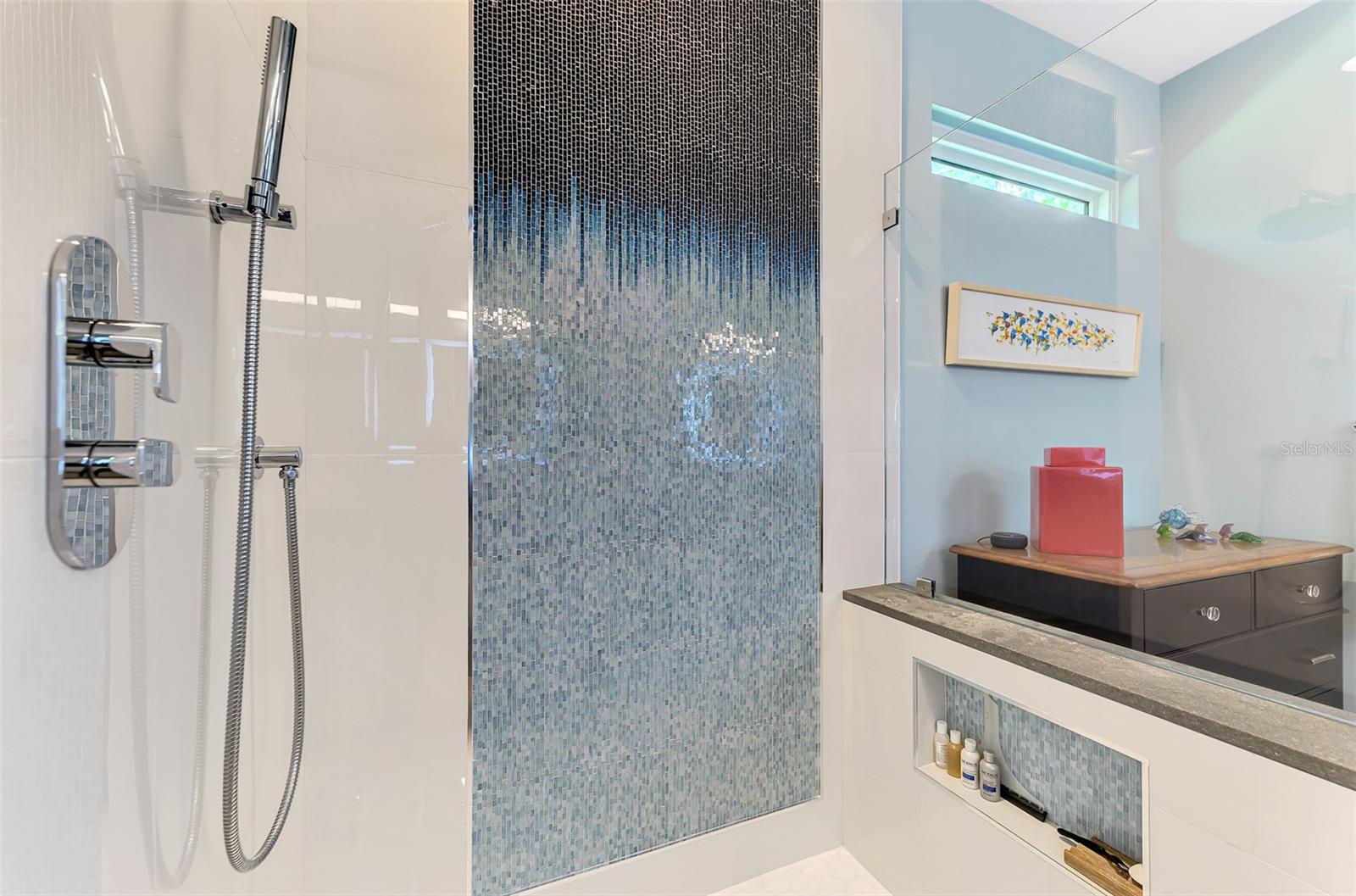 Exterior: Lighting, Outdoor Shower, Rain Gutters, Shade Shutter(s), Sidewalk, Sliding Doors