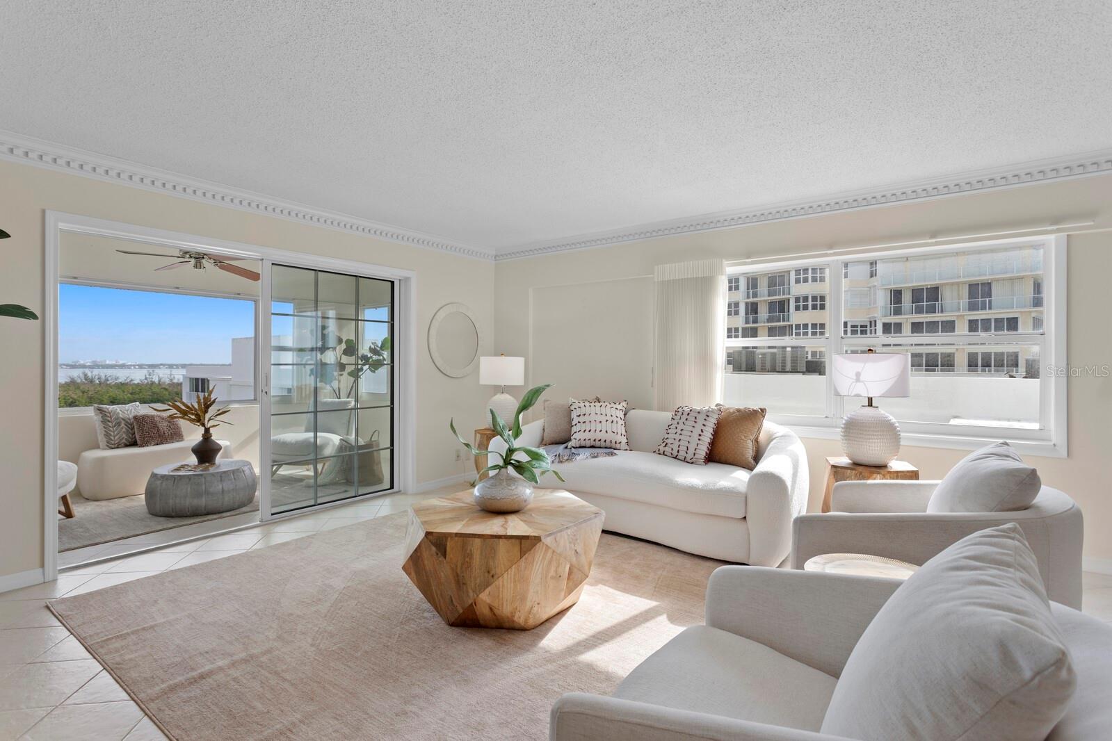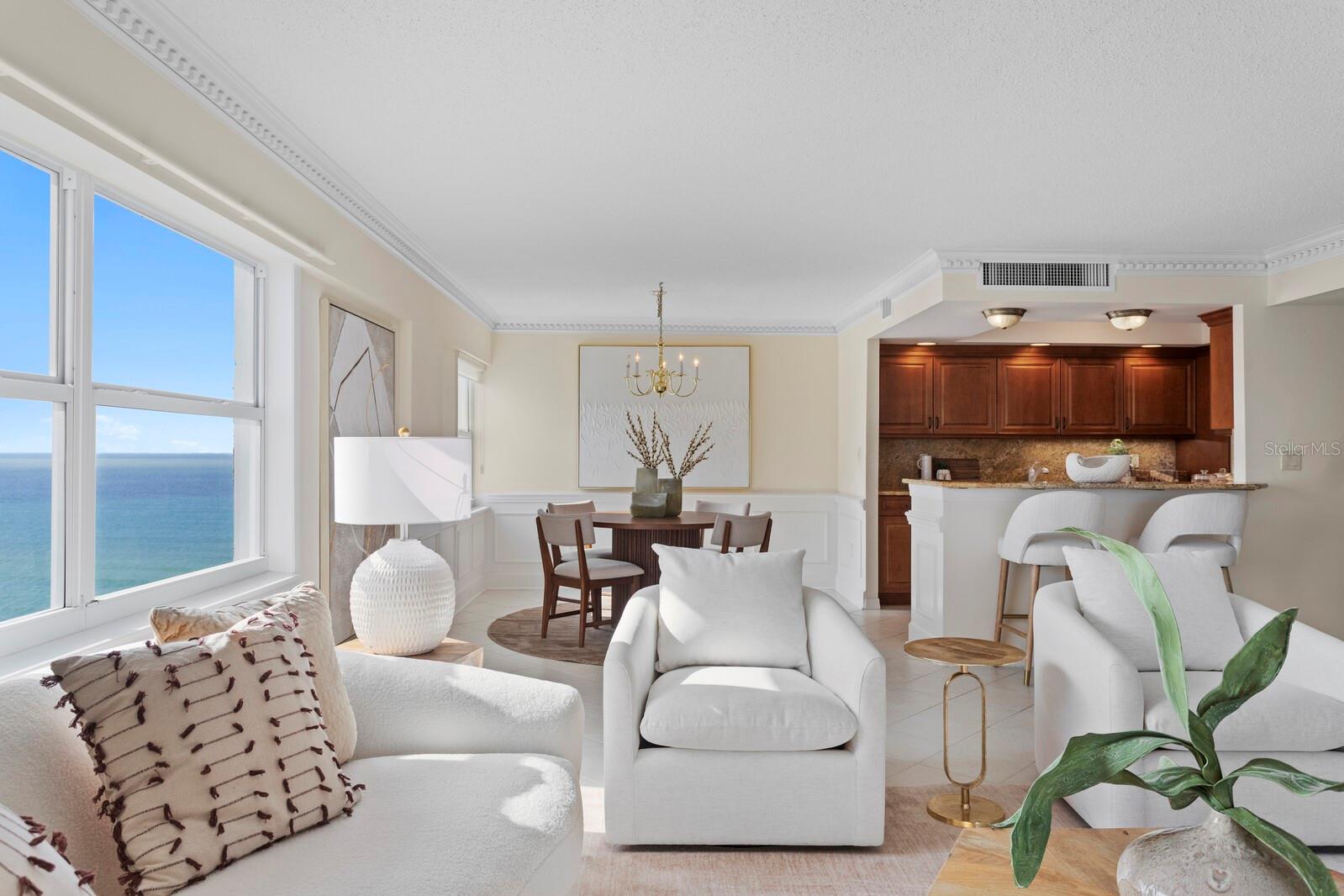 Welcome to your direct beachfront 2 bedroom, 2 bath condominium located in the highly desirable Key Tower South on Lido Key featuring panoramic views of the Bay, Ringling Bridge, Sarasota City skyline and Gulf of Mexico. Enter through the front door of this corner unit into a welcoming foyer, ideal for showcasing large-scale artwork, where the eye is immediately drawn toward the light-filled main living and dining area beyond. The open layout is beautifully accented by hand-laid dentil and picture frame molding, creating a sense of timeless refinement. The dining room is perfectly positioned to capture the mesmerizing Gulf view and sunsets, while the adjoining enclosed Florida Room reveals sweeping vistas of Sarasota Bay, the Ringling Bridge, and the Downtown skyline--a front-row seat to dazzling fireworks and twinkling city lights. The kitchen combines classic craftsmanship with thoughtful design, featuring wood cabinetry, granite countertops, and a peninsula with generous seating for casual dining. Tile flooring flows throughout the main living spaces, enhancing the coastal ease of this well-appointed home. The primary suite is a serene retreat, offering gorgeous water views, new plush carpeting, and private access to the Florida Room. A spacious walk-in closet provides ample storage, while the en suite bath showcases granite countertops and a tub-shower combination. The guest bedroom is equally inviting, featuring new carpet, a walk-in closet, and stunning views that mirror the home's tranquil setting. Additional conveniences include a dedicated covered carport and private storage locker located in the shared laundry room. Key Tower South is a meticulously maintained beachfront community boasting 201 feet of pristine Gulf frontage. Residents enjoy a heated beachside pool with an expansive sundeck for soaking in the endless horizon, as well as direct access to the sugar-white sands just steps from home. The first-floor community spaces were fully remodeled in 2025, offering a stylish and welcoming lobby, fitness room, library, and social room with a catering kitchen--perfect for gatherings. Additional amenities include saunas with showers, bicycle storage, and on-site management ensuring effortless living. Set on the quiet, walkable streets of Lido Key, the neighborhood offers a relaxed, beachside lifestyle. Spend your days exploring South Lido Park's nature trails and kayak launches, strolling to the boutique shops and cafs of St. Armands Circle, or crossing the iconic Ringling Bridge into downtown Sarasota's vibrant cultural and dining scene. Even SRQ Airport is just minutes away, adding convenience to this idyllic coastal address.