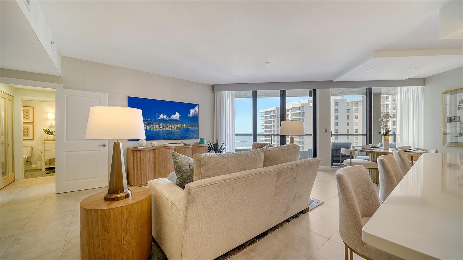 Amazing opportunity to own a completely renovated two bedroom two bath condo at the sought after Gulf side condominium Promenade. This spacious condo has been taken down to the studs and custom redone with designer finishes. The bright kitchen features top of the line Subzero and Wolf appliances plus a Subzero wine refrigerator. The condo features an open floorplan from the main living area which seamlessly flows to the kitchen where you have a bar for dining. Custom cabinets plus natural quartzite countertops highlight the kitchen. The bathrooms are all refinished with the latest Kohler fixtures and finishes. All windows and doors are new in 2024 plus the floors are gorgeous engineered wood and porcelain tile. There is a terrace adjacent to the living room and master bedroom accessed through sliding glass doors that offers excellent outdoor enjoyment and views of the Gulf of Mexico, gorgeous beach plus wildlife. Promenade amenities include a 24 hour guard gate, 4 har tru tennis courts, exercise gym plus an on-site office. The Gulfside pool and spa has ample seating for enjoying the serene surroundings and lush landscaping. This condo has garage parking with ample room plus a storage area. The condo is being sold fully furnished.