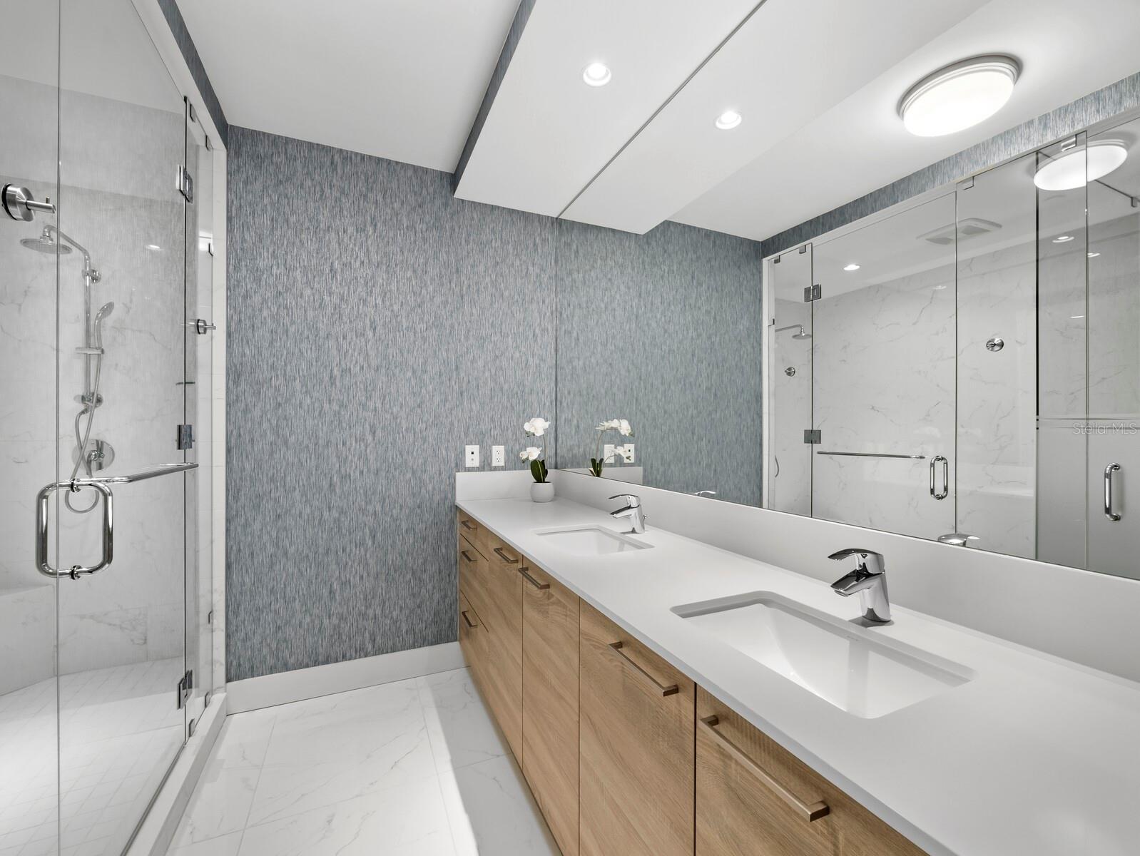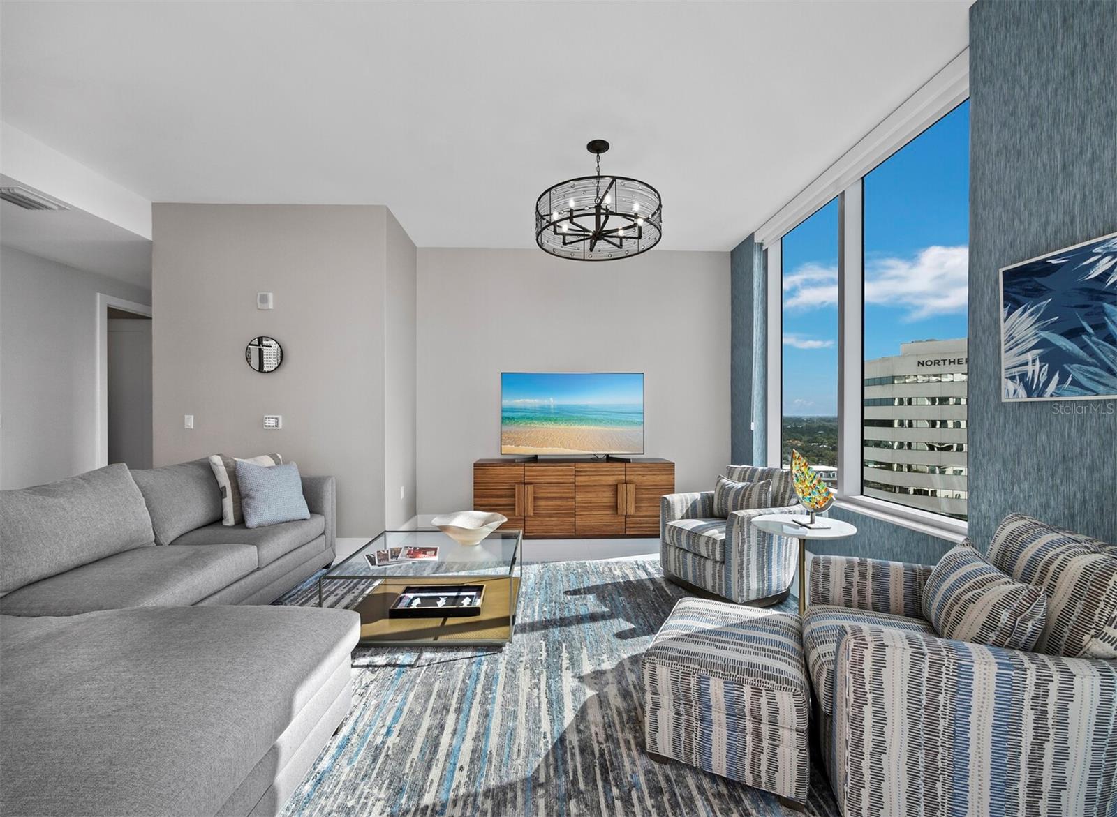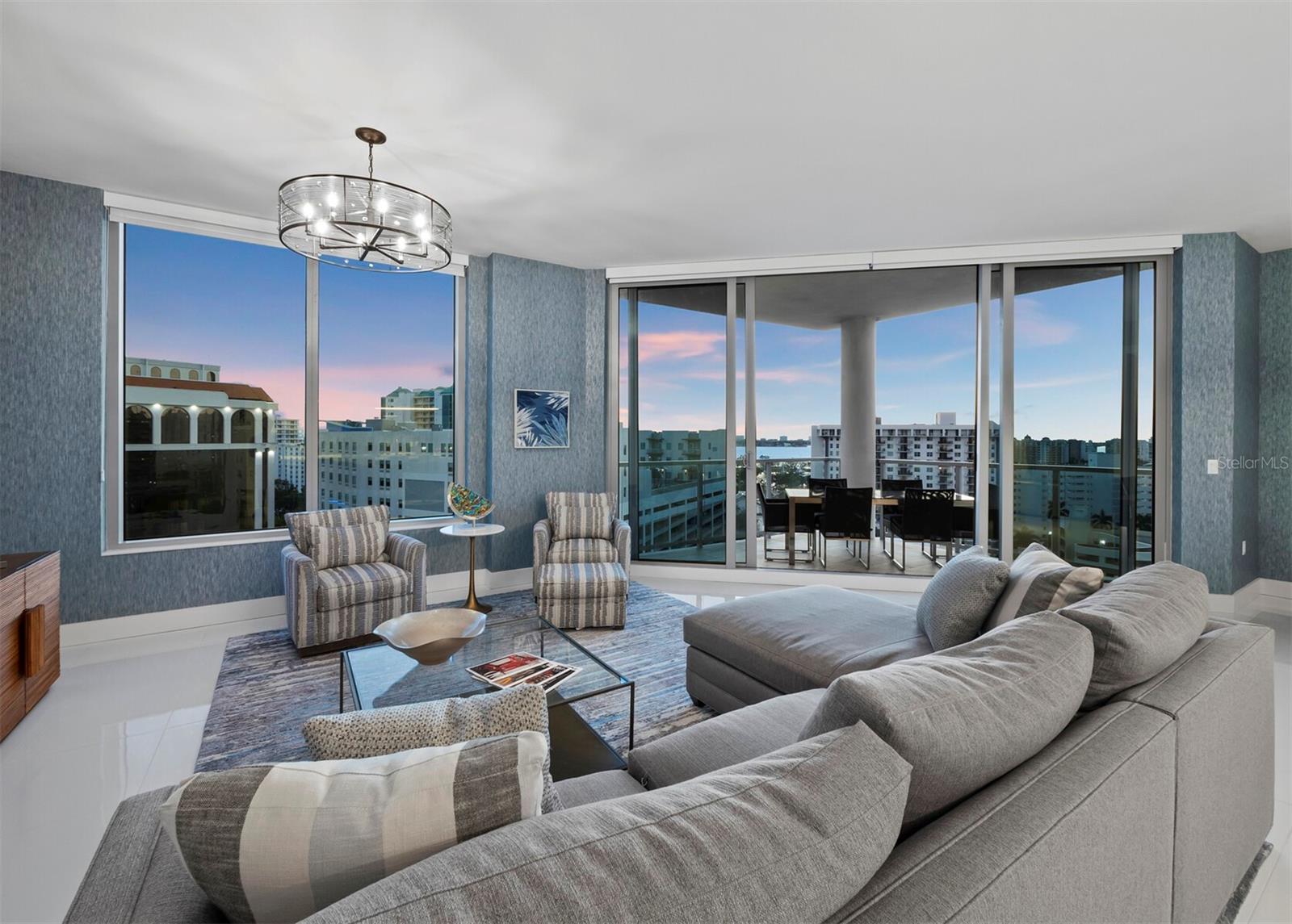 A perfectly positioned corner residence with coveted southwestern exposure offers the ideal perch within Downtown Sarasota's preferred address. This tenth floor residence at the Mark boasts a spacious floorplan and impeccable modern design, with abundant amenities and two assigned EV-equipped parking spaces adding exceptional value. From the entry, a private corridor leads to a central great room with showstopping elevated views of the cityscape and water beyond. The open layout enhances the spacious feel of the residence, complemented by floor-to-ceiling sliding glass doors that expand the living space to a private terrace with room for dining or lounging. The primary living space enjoys picturesque vistas and a seamless flow to the kitchen and adjacent dining area, all laid out ideally for entertaining and enjoying sunset views. The gourmet kitchen, clad with white quartz countertops and sleek modern cabinetry, overlooks the primary living space with an oversized island that offers additional counter seating. Stainless top-line appliances include a dedicated beverage refrigerator along with microwave drawer and range with hood vent. Beyond the kitchen island, the spacious dining area is accentuated by a dramatic chandelier. A separate den past the dining area adds incredible space and value to the distinctive layout of this unit, creating dedicated space for a media lounge or office and separating the primary suite from the rest of the residence. Within the primary suite, luxurious appointments include dual closets and a resort-style bathroom with an extra-long double vanity, glass-enclosed shower, and enclosed water closet. Ideal for privacy, the guest room with en suite is on the opposite side of the home. The additional powder bath offers convenience for entertaining and two-zone heating and cooling, exclusive to this floorplan, ensures optimal comfort. Designer finishes and fixtures throughout complement high gloss porcelain tile flooring, recessed lighting, and oversized windows to present a sleek blend of contemporary form and function. Residents of the Mark enjoy resort-style amenities and privileges that include lap pool, private cabanas, state-of-the-art fitness center, secured parking and elevators, and 24-hour concierge. This residence enjoys the most desirable layout and orientation in the building, with an elevation that captures beautiful views and preserves quietude while still enjoying proximity to the notable amenities of Downtown Sarasota.