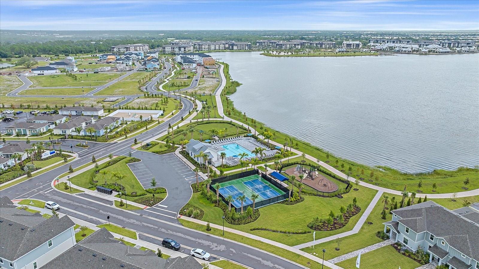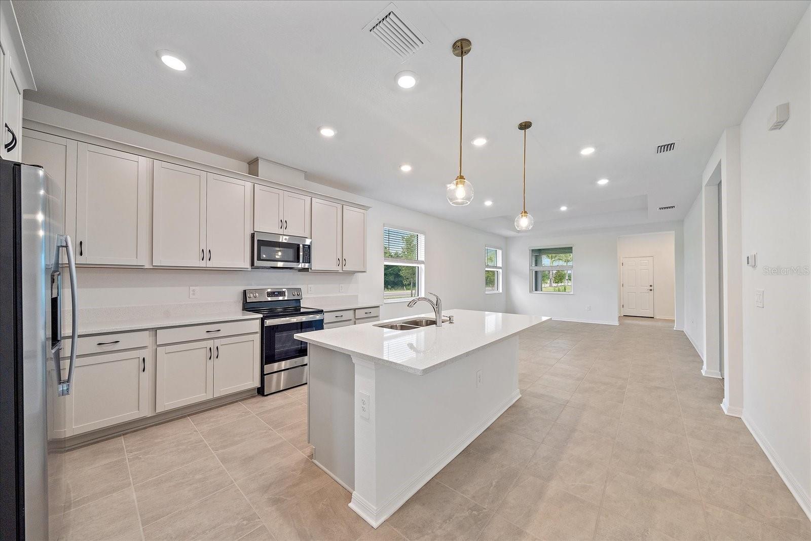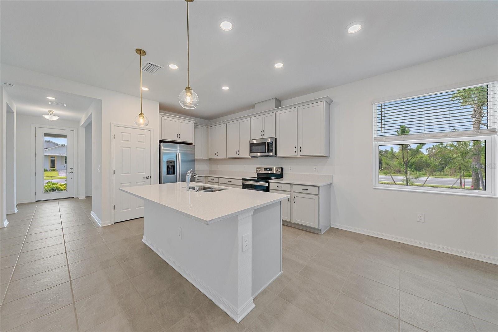 Perfectly positioned in Nautique at Waterside, this single-story M/I-built Bimini floorplan offers a walkable lifestyle just moments from the energy of Waterside Place. You'll enjoy lakefront dining, boutique shopping, community events, and the popular Sunday Farmers Market, all while being a short drive to downtown Sarasota and nearby Gulf beaches.The 1,743-square-foot layout includes 3 bedrooms, 2 baths, a flex room, and a two-car rear-load garage. The long foyer is flanked by two bedrooms and a shared bath on the right and a flex space, ideal for a home office or media room, on the left. The main living area features an open kitchen with abundant cabinet and counter space, a large island, quartz countertops, and tile flooring throughout the primary living spaces. The owner's suite is tucked off the great room and includes a spacious walk-in closet and a well-appointed bath with dual sinks and a large walk-in shower. A laundry room is located at the rear of the home before leading to the attached two-car garage, offering practical storage for beach gear, bikes, and seasonal items. The home is equipped with impact windows and doors throughout for peace of mind.Nautique amenities include a pool overlooking Kingfisher Lake, pickleball courts, a playground, a dog park, and miles of walking and biking trails. Lawn care and irrigation is included in the monthly HOA.