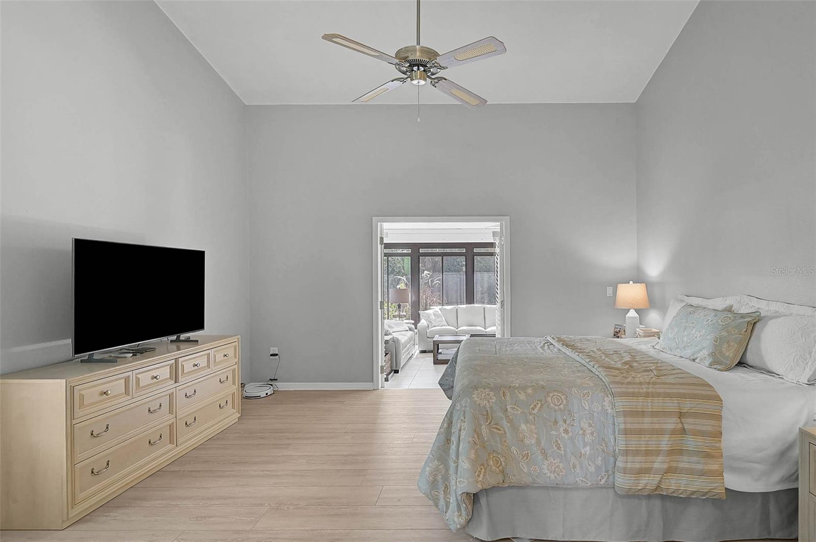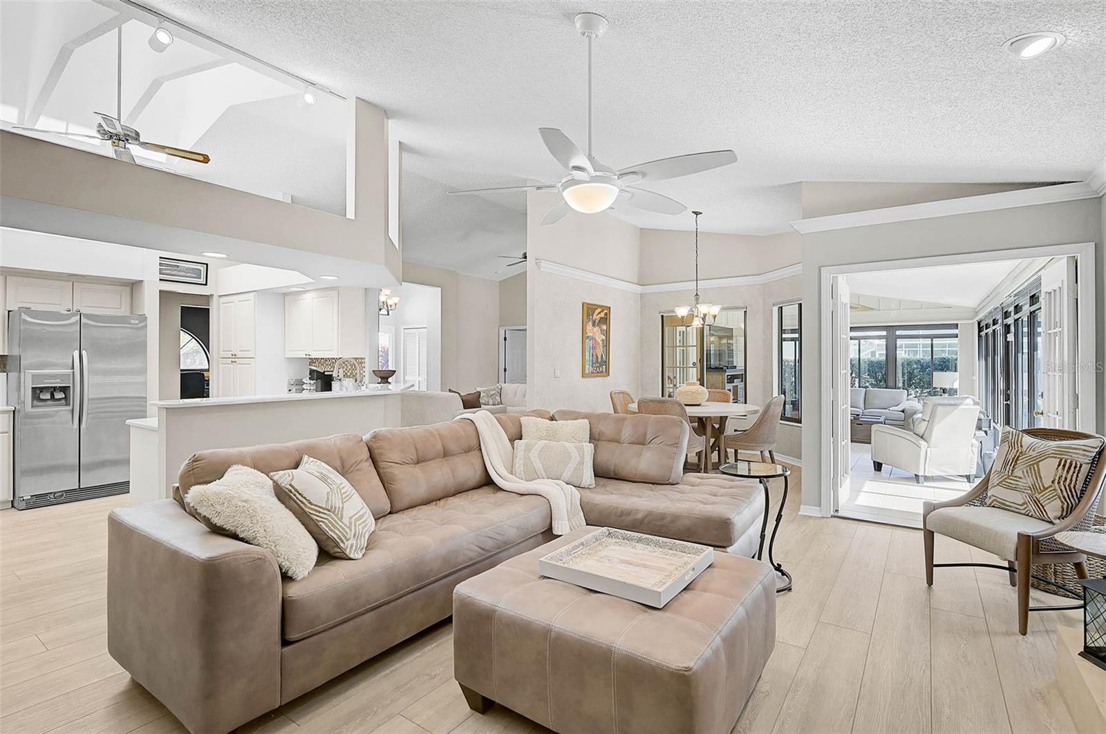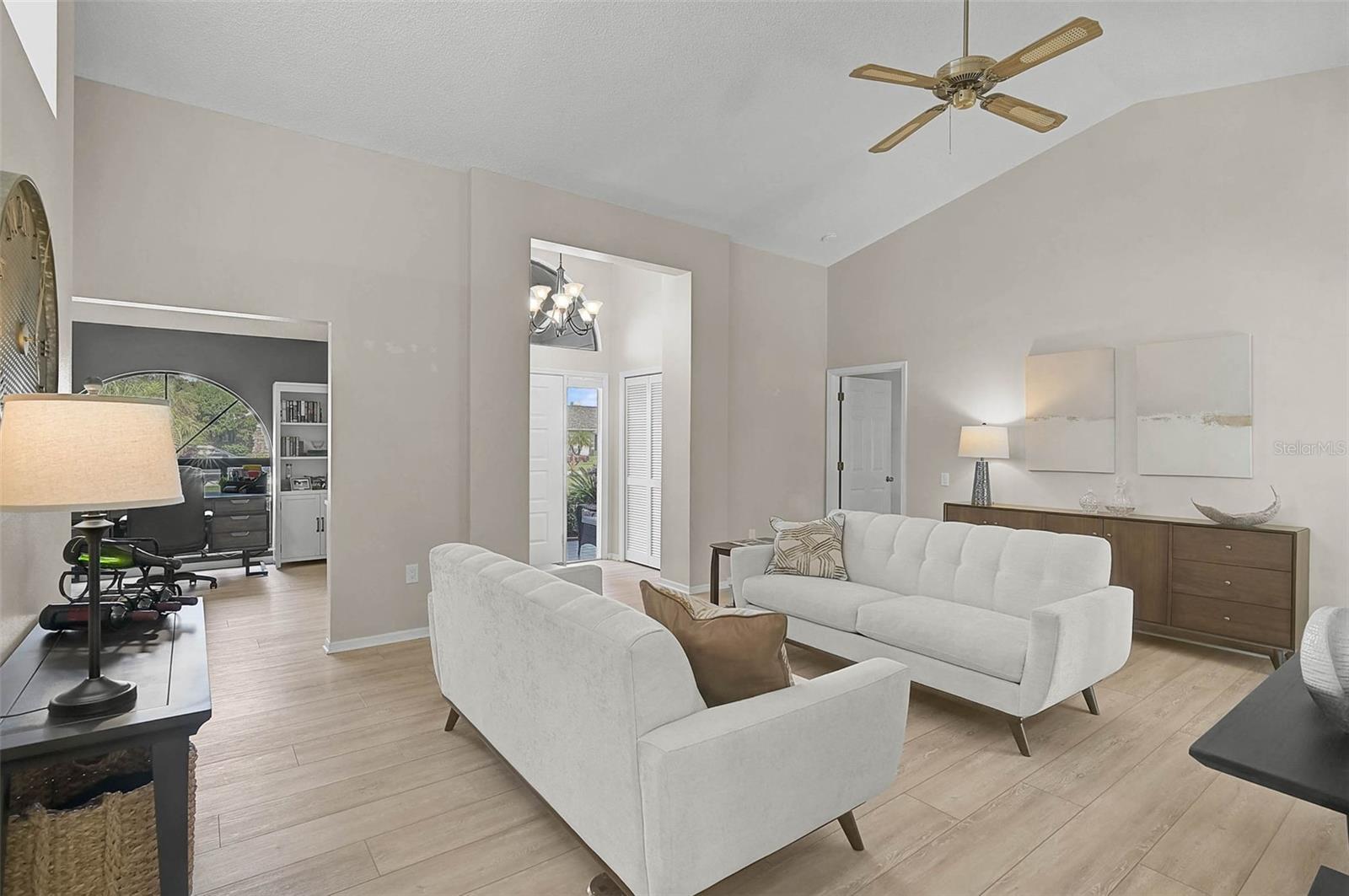 Gorgeous, Model-Perfect 3BR/2BA plus Den home on a Private Corner Lot! Step into this stunning home offering 2,512 square feet of beautifully designed living space. The entry welcomes you with a striking wood beam ceiling, adding warmth and architectural interest, creating a grand first impression. Situated on a quiet corner lot, the private backyard includes a paver courtyard, organic garden, and plenty of space for a pool--ideal for entertaining or relaxing in style. Inside, engineered wood floors flow throughout, creating warmth and elegance. The primary suite is a serene retreat with dual walk-in closets and a spa-like bathroom featuring dual sinks, a soaking tub, and a separate shower. High ceilings enhance the open, airy feel throughout the home. The enclosed lanai, accessed through three sets of French hurricane doors, features hurricane-protected windows and a new split A/C unit for year-round comfort. The kitchen is bright and inviting with new skylights (2024), a tile backsplash, new dishwasher, and a Culligan reverse osmosis system under the sink. Recent upgrades also include a new roof (2024), new hot water heater, new washer and dryer, and new garbage disposal, making this home completely move-in ready. Additional features include a Hydrawise irrigation that is Wi-Fi accessible, a water softener, and a cozy wood-burning fireplace in the living area. Peridia offers an active lifestyle with an executive 18-hole golf course, tennis, pickleball, heated pool, tiki bar, restaurant & bar, and pro shop. Ideally located, this home is close to shopping, airports, restaurants, and some of the best beaches in Florida, offering both convenience and lifestyle. Additional Fees: $877 quarterly master association fee, $450 annual food/beverage minimum, $100 one-time application fee, $4,000 one-time capital reserve.