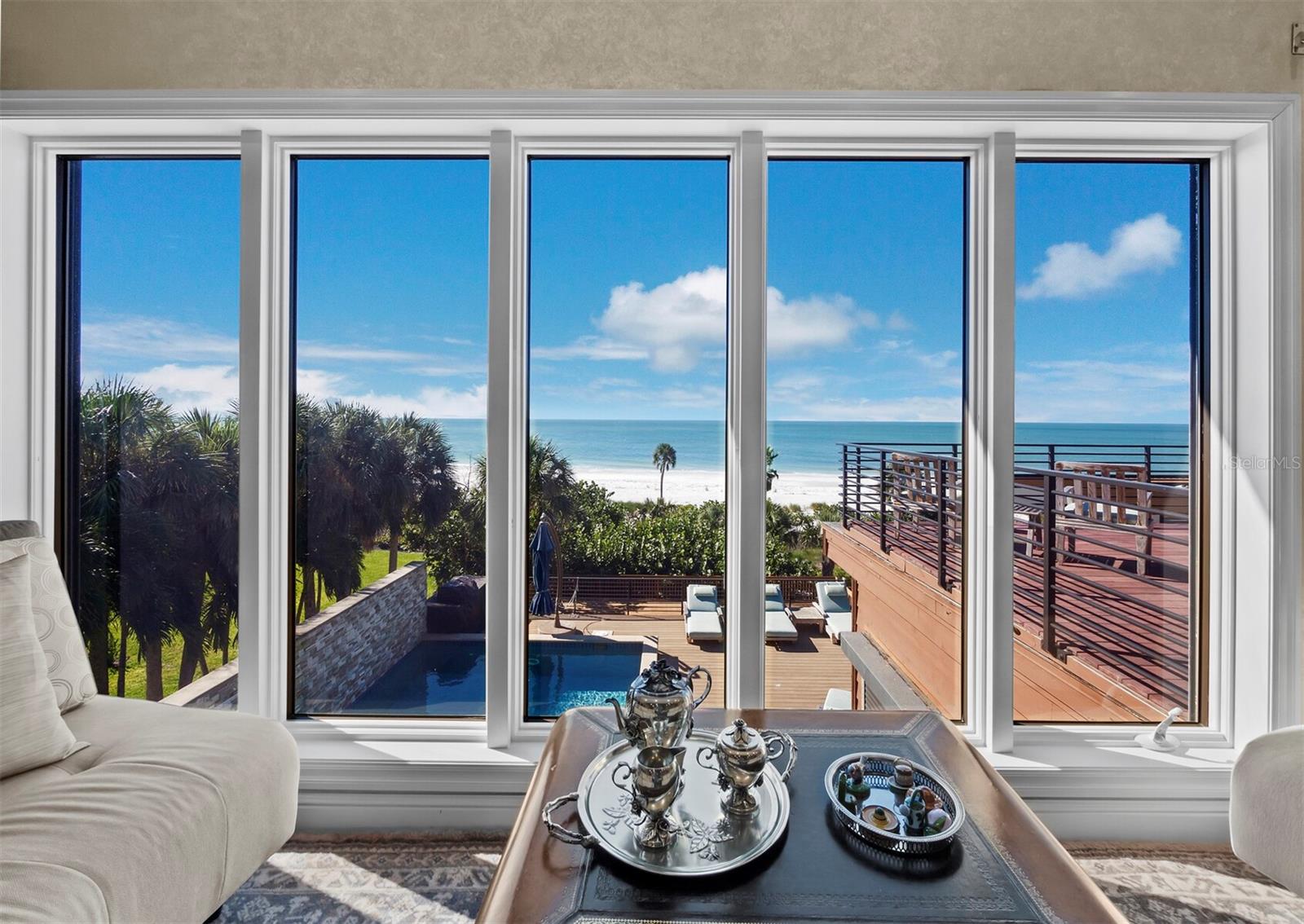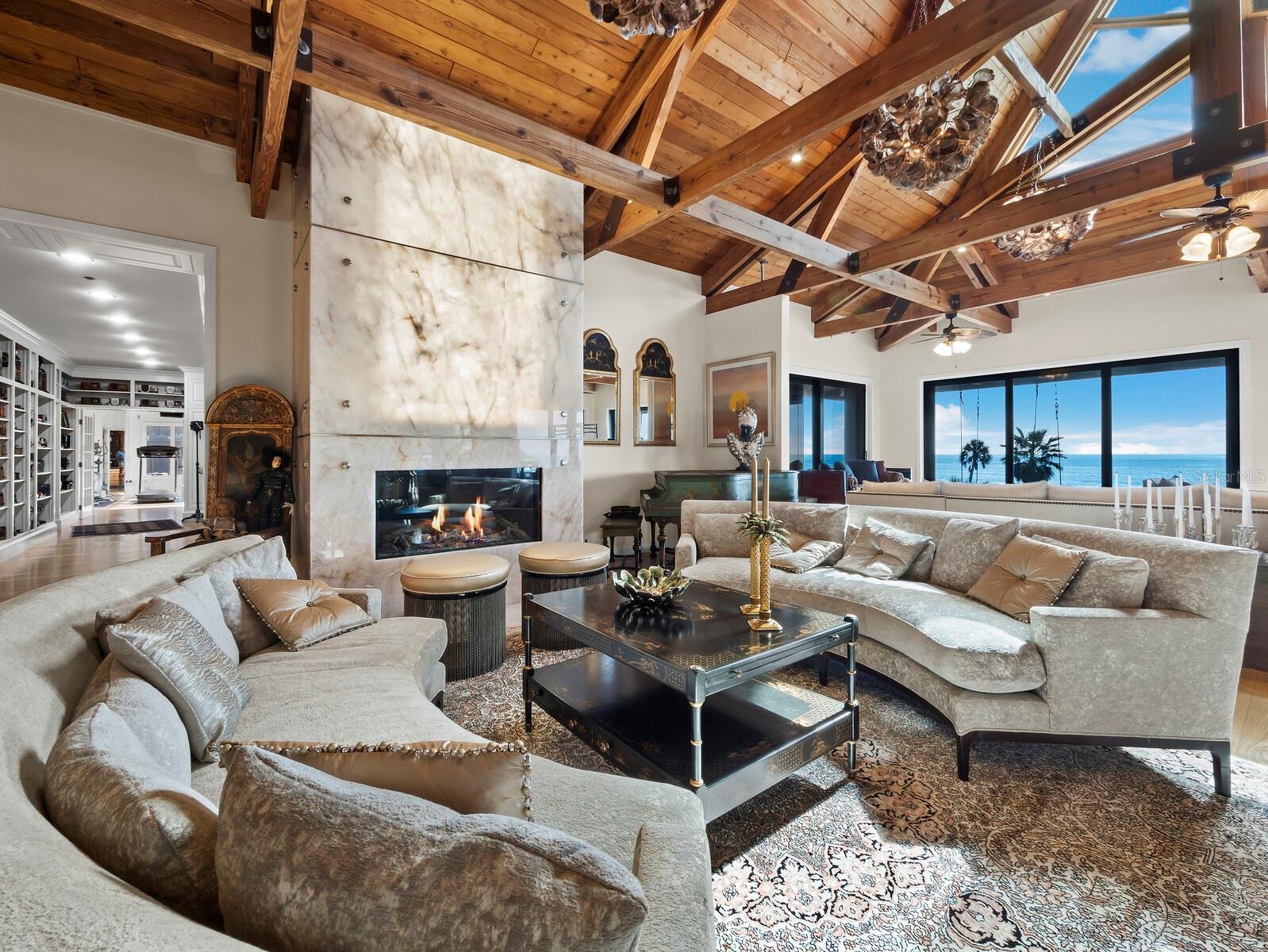 Where the sky opens wide above the Gulf and the shoreline runs uninterrupted, this extraordinary 12,000+ sq. ft. estate stands with a presence that defies comparison. Set on nearly 200 feet of pristine beachfront, the residence is elevated on pilings and wrapped in walls of glass that pull the Gulf's horizon into every major living space. Inside, soaring cedar ceilings, exposed trusses, and dramatic lines create a sense of volume and warmth that is both refined and inviting. The great room unfolds beneath grand architectural beams and transitions effortlessly to expansive terraces above the sand. A richly crafted lounge with custom bar and billiards area brings a club-like sophistication to the home's entertainment spaces. The extraordinary chef's kitchen commands attention with custom inlaid cabinetry, dual oversized islands, professional-grade appliances, and a hidden pantry--ideal for both catered events and everyday living. The second-floor primary suite serves as a private escape with Gulf views, generous sitting area, and a spa-inspired bath. Additional bedroom suites offer privacy for guests, while flexible spaces--including offices, fitness room with sauna, and bonus areas--accommodate a variety of lifestyles. An elevated pool and spa overlook the beach, complemented by multiple decks and outdoor living areas that capture sunrise, sunset, and the sound of the surf. With two elevators, multi-car garage, and exceptional craftsmanship throughout, this is a residence designed for those who seek scale, presence, and true Gulf-front living.