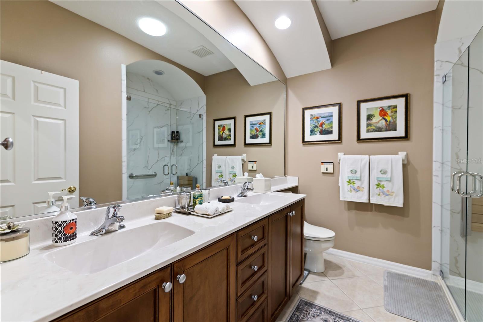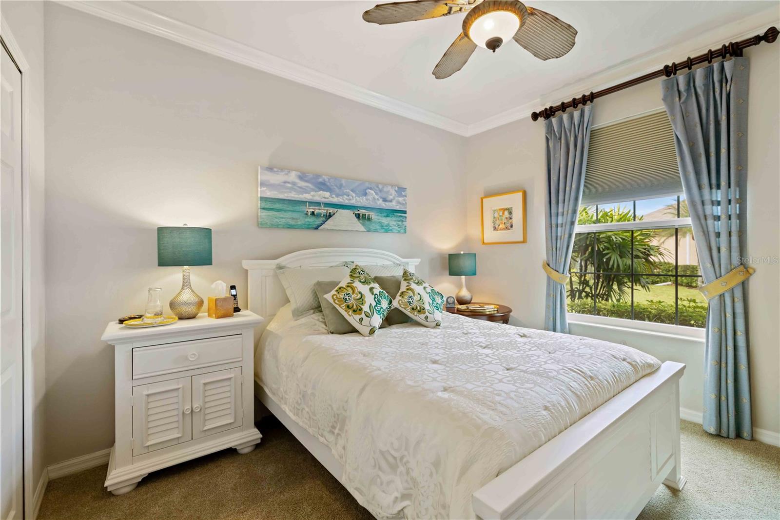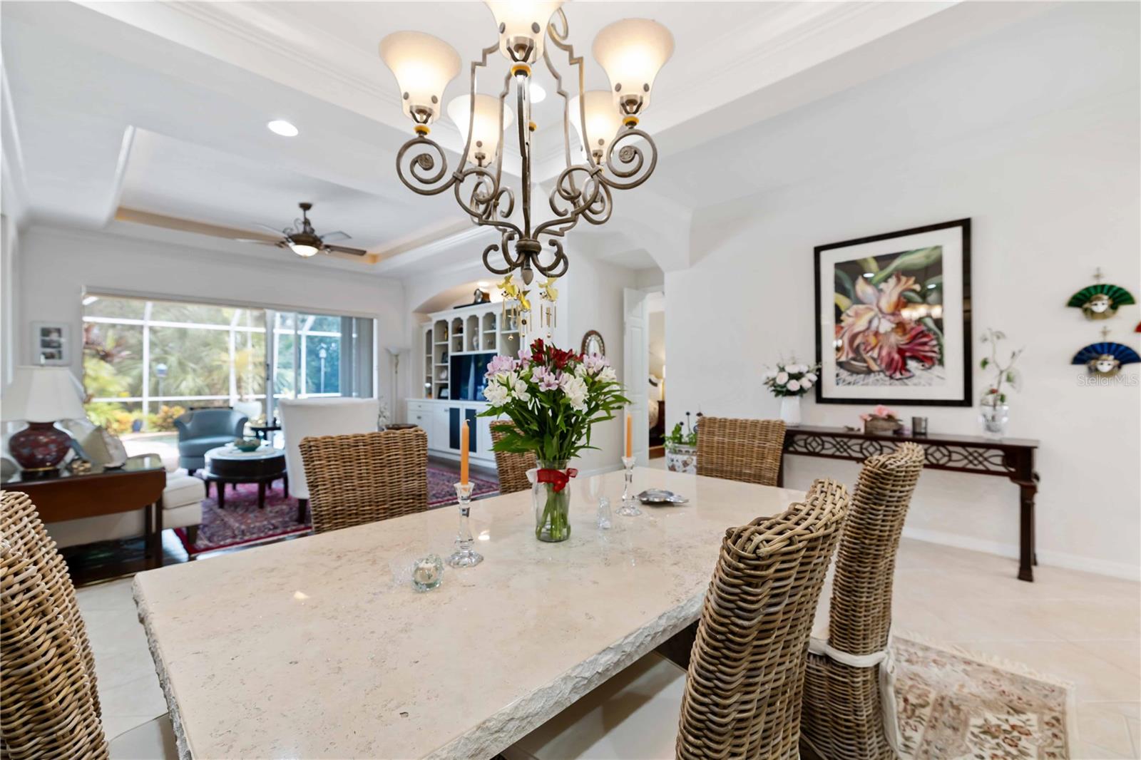 Lee Wetherington built home with designer's touches enhance this exquisite home showcasing 3 bedrooms, 2 and baths plus a study. Hand-scraped wide plank wood floors grace the great room and study while 18" tile floors are diagonally set. Stunning kitchen with stately 42" maple-glazed cabinets with crown molding, tumbled marble backsplash, black granite sink, stainless steel appliances, gas stove top and range hood, pendant lights, exotic Bordeaux di Crema granite countertops, oversized breakfast/center island and tray ceiling. Recently replaced roof and HVAC system! Living large with 2,530 square feet, the great room has a tray ceiling with cove lighting, designer fan and a custom built-in wall unit, all open to the dining room with its columns and beveled mirrored wall bringing into view the saltwater pool and preserve. The inviting owner's retreat with wood floors, tray ceiling and designer fan opens to the lanai and pool. Two separate custom closets on your way to the luxurious master bath with walk-in shower, garden tub, dual sinks and vanity. Two additional guest rooms share a bath with dual sinks. The laundry room has a laundry sink, cabinets and a large closet. To complete the picture is the three car garage with paver driveway leading to the double leaded glass entrance doors. All in an outstanding gated community with fitness room, two large heated community pools and Spa, exercise facility, tennis courts and playground. Excellent location just west of I-75, surrounded by TONS of shopping and restaurants, UTC mall area, benderson park, and easy access to golf, beaches- Siesta Key, Anna Maria and Longboat Key, St Armands Circle, downtown Sarasota, ST Pete, Bradenton, Detweilers market and so much more.