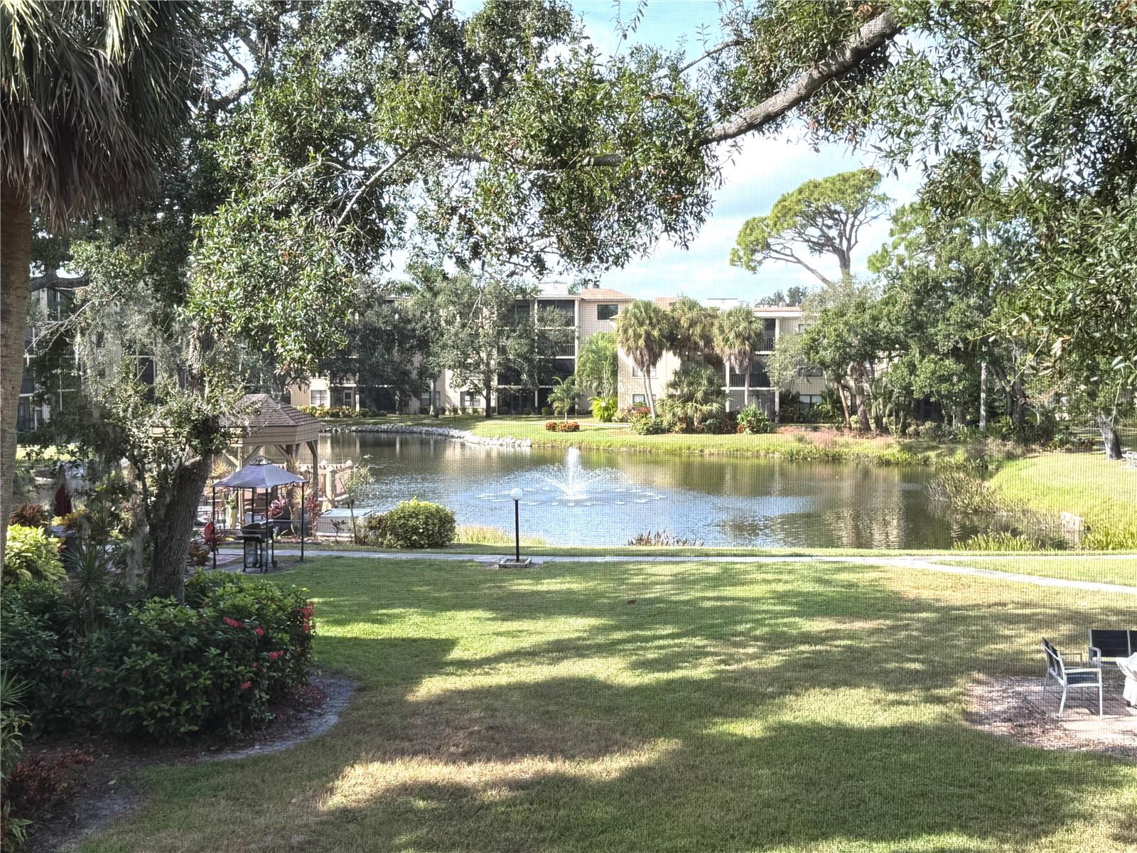 Unbelievable water and garden views from this beautiful Driftwood floorplan at wonderful Desoto Square Villas. This is the largest floorplan and these are rarely available. 2nd Floor unit right by stairs but there is also an elevator. Parking space is right directly in front! This unit has been wonderfully cared for and has many upgrades including a 3 year-old air conditioning unit and a 2-year old hot water heater. Big kitchen with large breakfast bar and separate family room off the kitchen. Both bathrooms are nicely updated. Huge walk-in closet in master bedroom and large built-in closet in guest bedroom. Beautiful waterproof wood plank vinyl flooring in the main areas. Private storage area included with this condo. Offered partially furnished. Big beautiful heated pool, clubhouse, shuffleboard, pickleball, exercise room and many activities. This is a gated community and is located near shopping and restaurants and an easy drive to beautiful beaches and also to the Tampa, St. Pete area. Don't wait too long on this one!