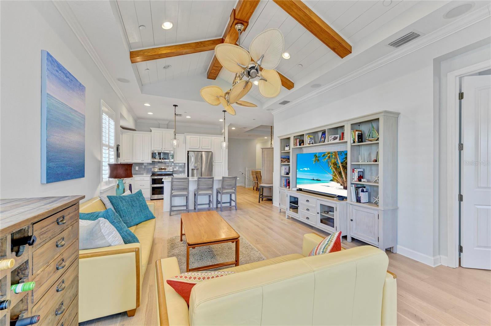 Welcome to this immaculate 3-bedroom, 3-bath, award-winning Andros-style home, perfectly situated in the gated coastal resort community of Harbour Isle on Anna Maria Sound. Nestled at the end of a quiet cul-de-sac, this premium homesite offers exceptional privacy and peaceful surroundings. With the main living room, sunroom, kitchen, and primary suite all facing west, you'll enjoy expansive, unobstructed Sapphire Lake views and breathtaking sunsets every evening. This upgraded residence features beautiful, engineered wood flooring, designer lighting, and custom window treatments--including shutters and motorized blinds. The gourmet kitchen impresses with white cabinetry, newer GE stainless steel appliances, GE Caf series refrigerator, double oven, and an extra quite Bosch dishwasher, sleek quartz countertops, and a generous island ideal for cooking and entertaining. The Great Room is enhanced by upgraded ceiling-mounted surround sound and an impressive 65" LG television for exceptional viewing and audio. Vaulted wood-beam and tray ceilings, crown molding throughout the common areas, shiplap accents in the guest room, wainscoting, and elegant French doors add warmth and architectural charm. A private elevator provides effortless access from the oversized two-car garage to the main living level. The tranquil primary bedroom boasts stunning water views and a spacious walk-in closet. beautiful mirrors flank each side of the king size bed. Most furniture can be included in this gorgeous home. Additional highlights include a 12-foot garage ceiling with abundant storage, a Trane air-conditioning system for year-round comfort. Just moments from the sugar-sand beaches and vibrant island lifestyle of Anna Maria, Harbour Isle offers an unmatched array of resort-style amenities. Enjoy scenic walking and biking trails, multiple pools, playgrounds, and the spectacular 23,000 sq. ft. Beach Club, complete with water views, Sky Bar restaurant, fitness center, resort-style pool, and private beach. Nearby, residents can also enjoy the Jimmy Buffett-inspired Compass Hotel, marina, and tiki restaurant. Outdoor enthusiasts will love the close access to Robinson Preserve and other pristine natural areas. Don't miss the opportunity to make this exceptional coastal retreat your own--schedule your private showing today!