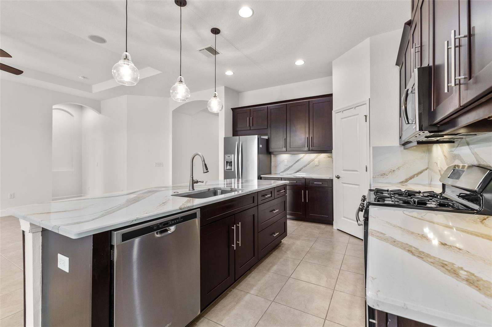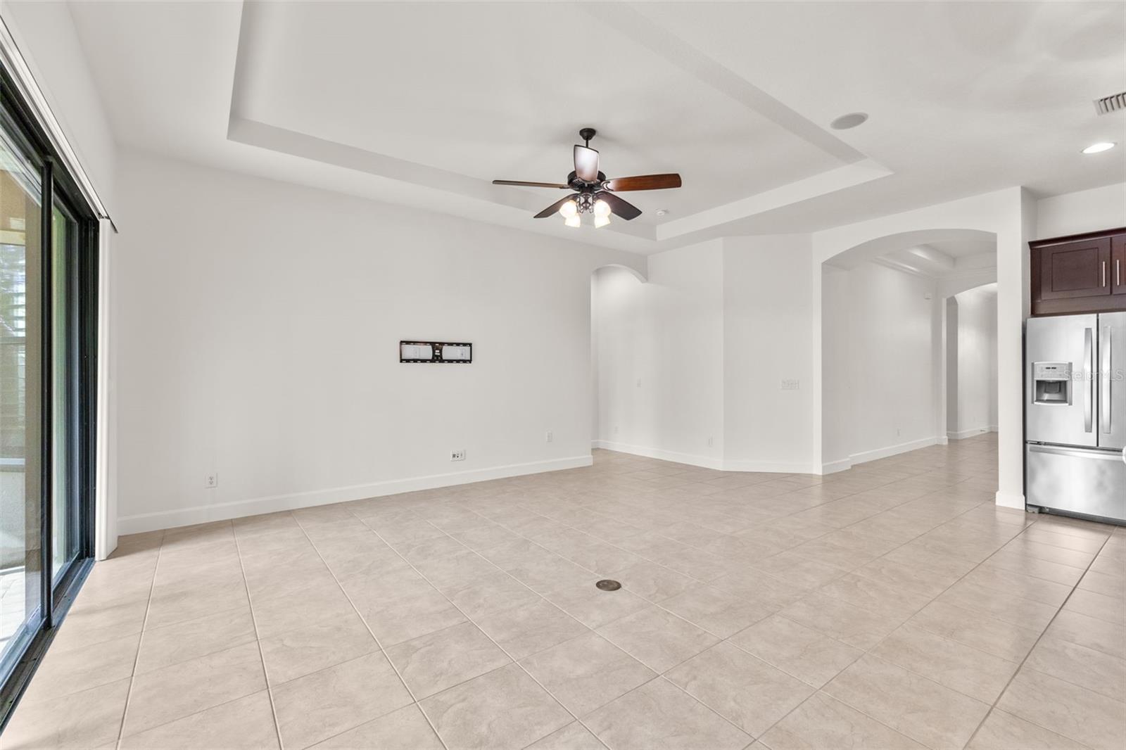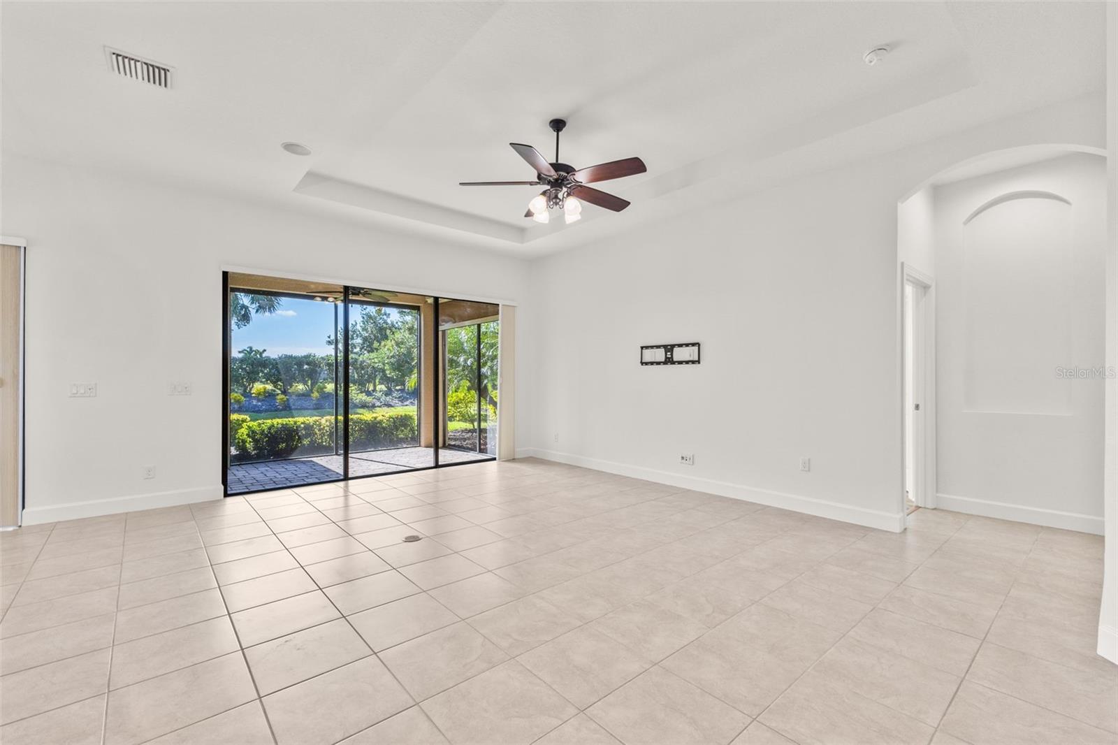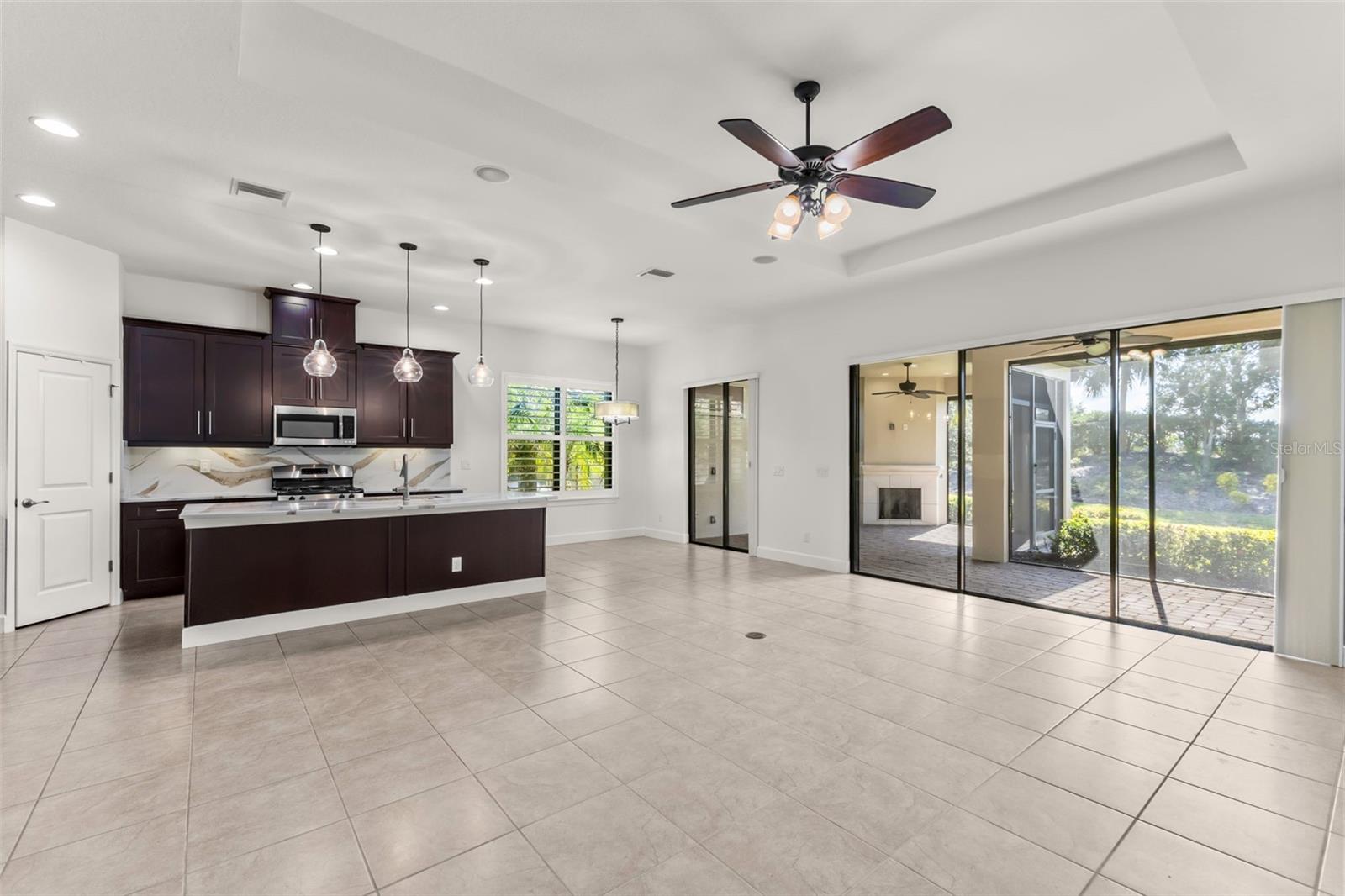 Welcome to 5242 Napoli Run, an exceptional residence located in the highly desirable Esplanade Golf & Country Club in Lakewood Ranch. This beautifully upgraded 2-bedroom plus den/office, 2.5-bath home offers 2,053 sq. ft. of elegant living space and includes a golf-deeded homesite, providing golf membership for two--all included in the HOA fees. Step inside to discover a thoughtfully designed floor plan enhanced by premium upgrades throughout, including stylish flooring, upgraded bathrooms, and custom closets that elevate both comfort and functionality. The spacious gourmet kitchen and open-concept living areas make this home ideal for entertaining or enjoying quiet evenings in.One of the standout features of this property is its expansive screened-in back porch, complete with a built-in outdoor gas fireplace--perfect for year-round relaxation. The backyard offers exceptional privacy with lush landscaping and a tranquil pond view just beyond, creating a serene outdoor retreat. Esplanade is renowned for its amenity-rich lifestyle, featuring a resort-style community pool, tennis courts, pickleball courts, a state-of-the-art fitness center, on-site restaurant, Tiki bar, and beautifully maintained walking paths. With its vibrant community atmosphere and unparalleled amenities, Esplanade remains one of Lakewood Ranch's most sought-after neighborhoods.Updates completed recently in this home include: New quartz countertops, new showers, LVP flooring in bedrooms and office, custom closets, new light in kitchen/foyer, plantation shutters, new hot water heater (2025) and hurricane screens on all Lanai/porch openings. **Some photos have been virtually staged.