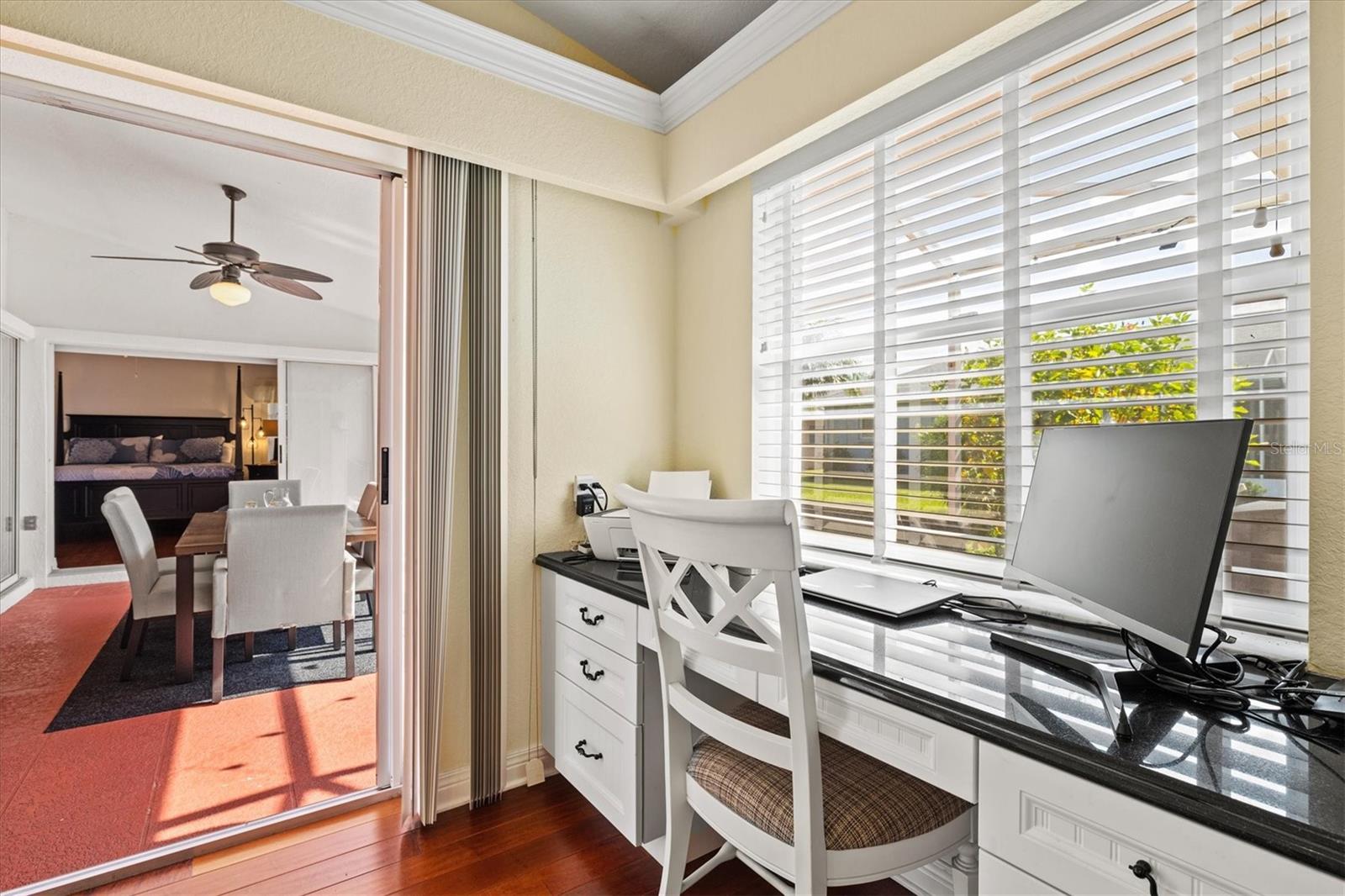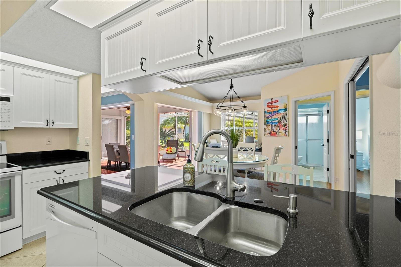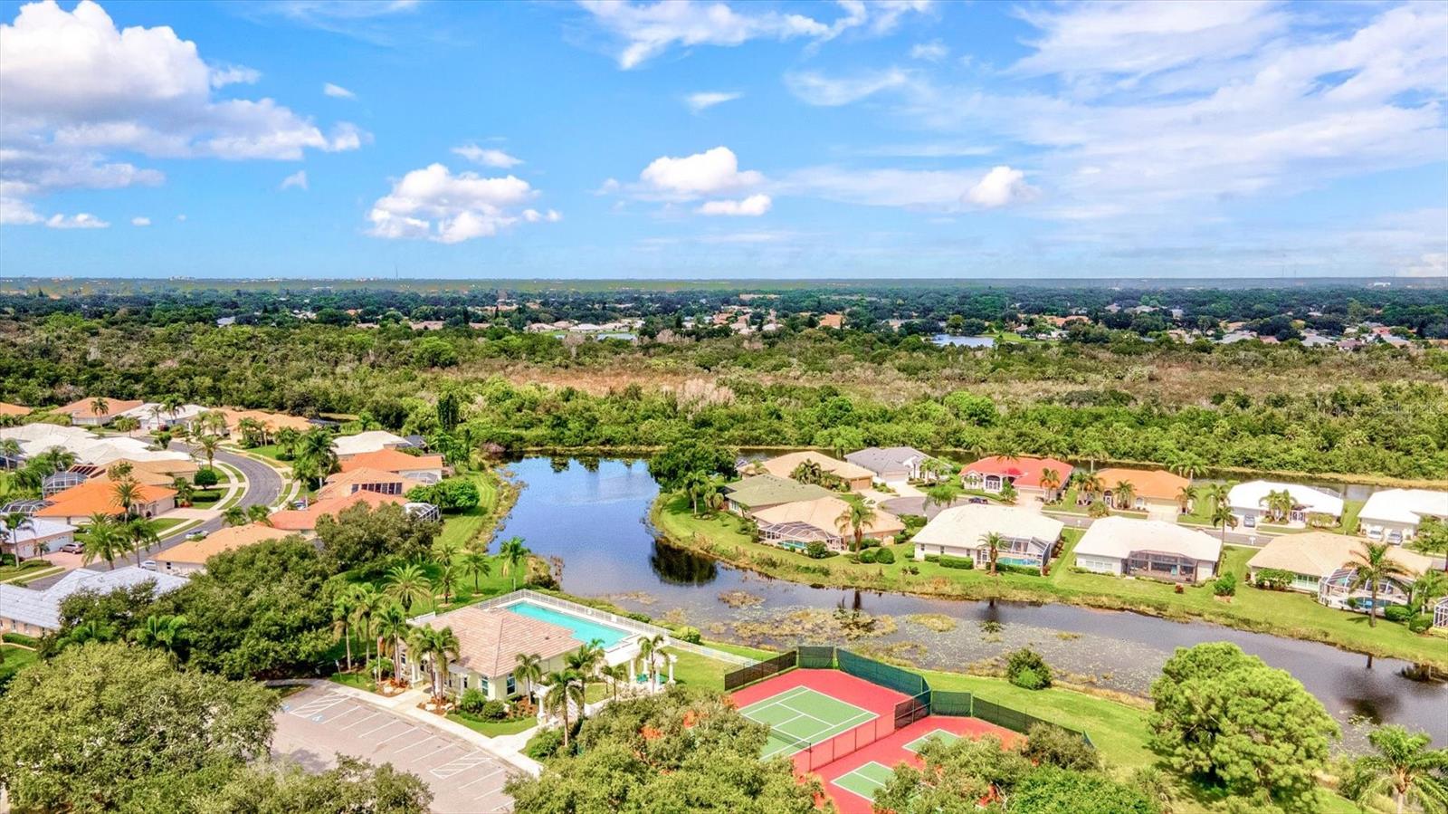 Welcome to your new home in the sought after Lake of the Woods community. Situated on 0.20 acres, this 3 bedroom, 2 bathroom home with a 2 car garage is move in ready with a brand new roof installed in Spring 2025. The neighborhood offers low annual HOA fees, no CDD fees, and a prime location just five minutes from historic Venice Island. This coastal community keeps you close to the water without the worry of a flood zone, so no flood insurance is required. Attractive curb appeal welcomes you the moment you arrive, with refreshed landscaping, new plantings, and sidewalks winding through this beautiful tree-lined setting. Through the double doors, you will find more than 1,800 square feet of interior living space with an ideal layout, soaring ceilings, and abundant natural light. Hardwood flooring and crown molding run throughout the home, and your eyes are immediately drawn to the pocket sliding doors that open to the lanai and create a seamless indoor outdoor living experience. The formal dining room sits just off the kitchen for easy entertaining and is lined with classic beadboard wainscoting that adds character to the space. The kitchen provides plenty of storage with ample cabinet space, granite countertops, barstool seating, a nearby breakfast nook, and a built in desk overlooking the backyard. An indoor laundry room adds everyday convenience. The oversized owner's suite features sliding glass door access to the lanai, a large walk in closet, and a spacious ensuite bathroom with dual sinks, a soaking tub, and a separate stand up shower. The split bedroom floorplan offers privacy, with the additional bedrooms located near the guest bathroom, and one bedroom enjoying direct access to it. The third bedroom offers flexible use and can easily serve as a guest room, cozy den, or a home office to suit your needs. The extended lanai is the perfect spot to unwind at the end of the day. Additional upgrades include a newer AC unit, newer water heater, updated sprinkler and pump system, and a garage with built in features and additional cabinetry ideal for a workshop. Lake of the Woods residents enjoy miles of scenic walking and biking paths throughout this welcoming master planned neighborhood. Within minutes you can explore historic downtown Venice Island with its boutiques, cafs, farmers markets, and concerts in the park, as well as the brand new Wellen Park Town Center for shopping, dining, and entertainment. For beach lovers, Venice Beach and the iconic Sharky's Pier are just a short drive away, and world famous Siesta Key is only 35 minutes from your doorstep. What more could you ask for? Schedule your showing today.