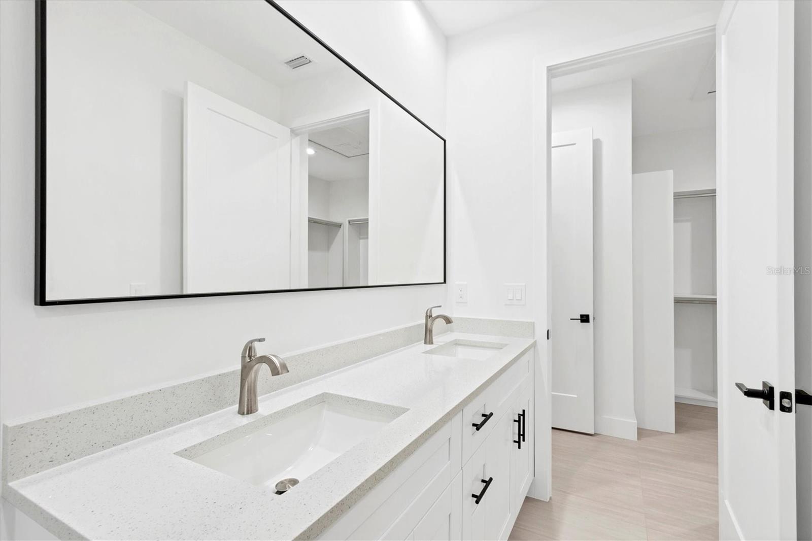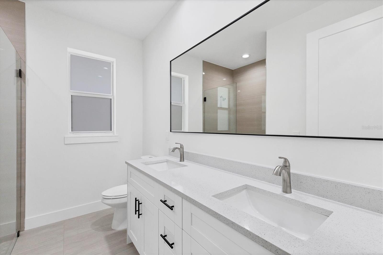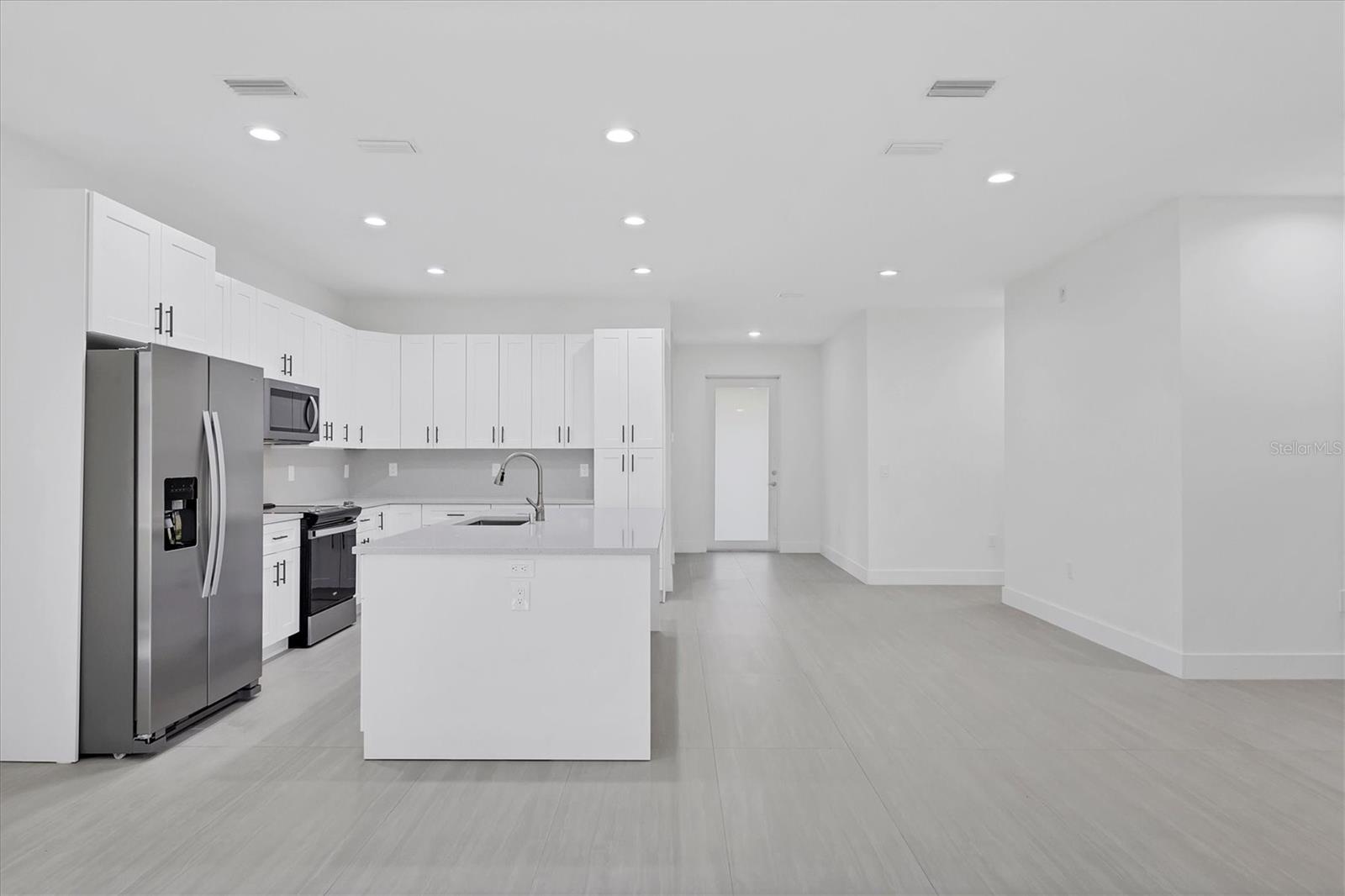 One or more photo(s) has been virtually staged. Discover unparalleled elegance and affordability in this stunning 2025-built 3-bedroom, 2-bathroom modern residence of 2,374 SF when you add the covered porch and lanai, perfectly positioned in a highly desirable North Port neighborhood with no HOA fees and no flood zone requirements. Boasting hurricane-rated impact windows and doors throughout, a whole-house gutter system, and an efficient irrigation setup, this energy-saving home combines superior safety features and utility savings, all backed by a 1-year builder craftsmanship warranty.Step through the elegant full-view frosted impact-glass entry door onto a charming tiled front porch, ideal for welcoming neighbors, and into a light-filled foyer complete with a coat closet. Sleek 24x48 tile flooring flows seamlessly across every room, complemented by soaring 9'-4" ceilings, tall 8-foot interior doors, 6-inch modern baseboards, and smooth flat walls. The heart of the home is a sophisticated open-concept gourmet kitchen equipped with premium Whirlpool stainless steel appliances, soft-close wood cabinetry featuring 42-inch uppers and a convenient lazy Susan, sparkling quartz countertops paired with a matching backsplash, and a generous eat-in island that anchors the spacious living and dining areas. Entertain effortlessly as impact-rated sliding glass doors open to an expansive 24' x 11.5' covered, tiled lanai overlooking a serene, tree-filled tropical backyard framed by mature landscaping. Each bedroom is appointed with custom closet organizers, while the luxurious primary suite impresses with a large walk-in closet featuring a premium organization system anda spa-like en-suite bath showcasing dual quartz vanities, a glass-enclosed tiled walk-in shower, a dual-flush toilet, and a privacy-glass window. The guest bathroom echoes this refined style with matching quartz finishes and a modern glass walk-in shower. Ideally located just minutes from Town Center Mall's shopping, dining, and movie theater, top-rated Sarasota County schools (Atwater Elementary, Woodland Middle, North Port High), two community pools, the expansive North Port Aquatic Center with its lazy river and slides, and Centennial Park's fitness facilities, sports fields, and trails. Enjoy quick access to Warm Mineral Springs, Peace River, Charlotte Harbor's boating canals, Wellen Park's vibrant restaurants and concerts, Fishermen's Village, CoolToday Park (home of the Atlanta Braves spring training), I-75, and pristine Gulf beaches in Venice or Englewood--all within 30 minutes. This move-in-ready masterpiece delivers exceptional quality craftsmanship and contemporary Florida living at its finest! Some photos virtually staged.