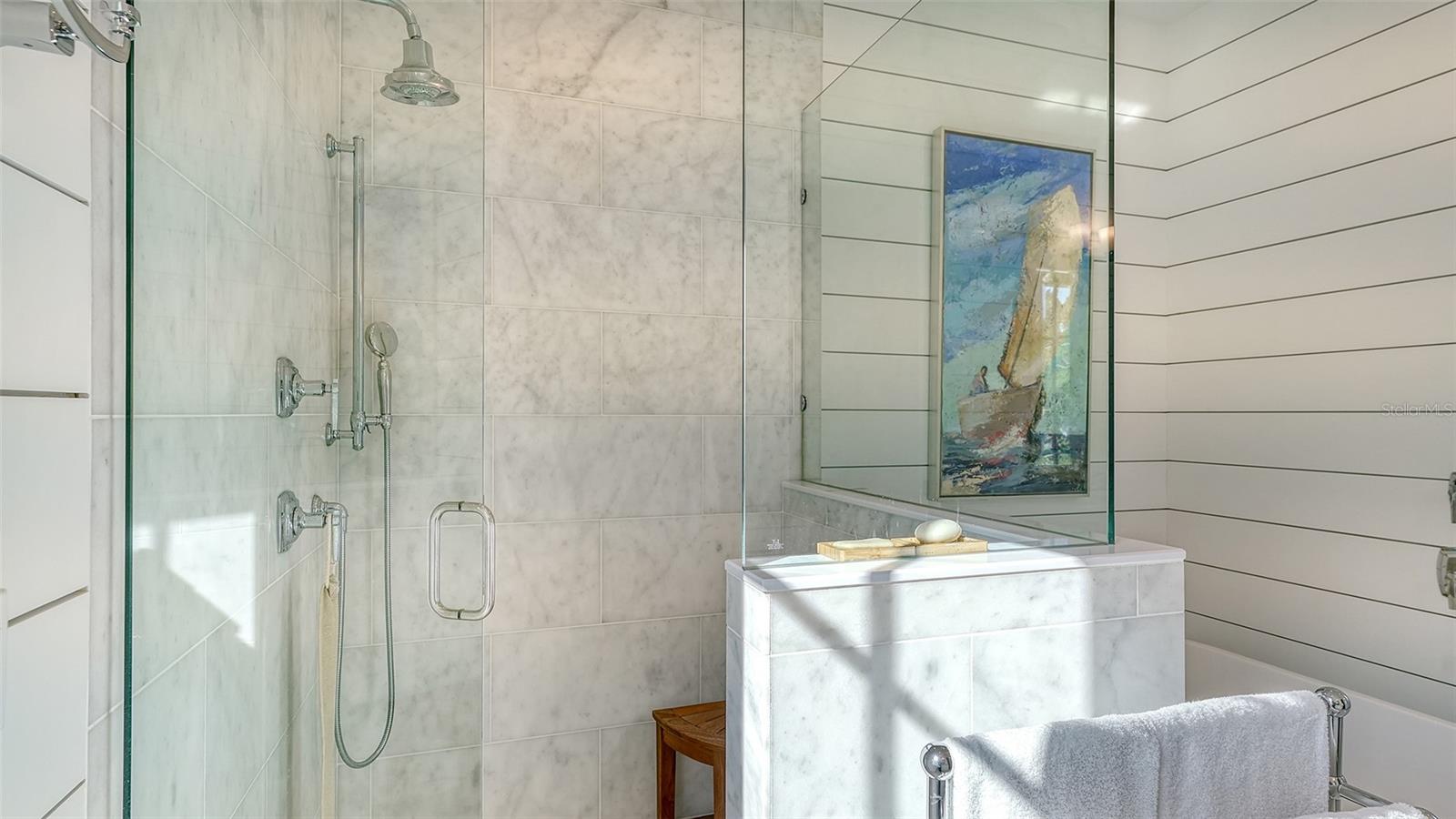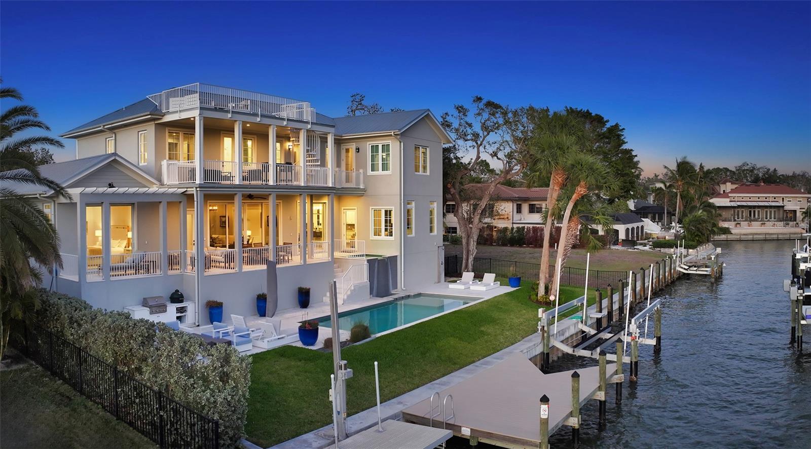 Experience unparalleled waterfront luxury living in this modern coastal residence, nestled in McClellan Park, one of Sarasota's most sought-after locations. Offering five bedrooms and five and a half bathrooms, this exquisite custom-built home blends timeless elegance with stylish sophistication. Step inside the lovely living room with engineered hardwood floors, elegant crown molding, and designer light fixtures throughout. Gather around the gas fireplace finished in coastal shiplap which frame the views of the water. The formal dining room boasts a dry bar with a wine refrigerator adding a touch of refinement for effortless entertainment. The gourmet chef's kitchen is a culinary dream, featuring a Sub-Zero refrigerator, Wolf gas range, built-in microwave, Bosch dishwasher, two refrigerator drawers, and a water filtration system. Wine enthusiasts will appreciate the large pantry that houses an oversized Sub-Zero wine cooler, ensuring your collection is always at the perfect temperature. The kitchen opens to a cozy family room with views of the water. The primary suite, conveniently located on the first floor, offers a serene retreat with two large walk-in closets with built-in shelving. The spa-like primary bath exudes luxury, featuring marble finishes, polished nickel fixtures, and shiplap walls--a true sanctuary. Four ensuite bedrooms with large closets provide the perfect place for family and friends. An additional den provides optimal flexibility. Electronic shades in all bedrooms and throughout first floor. Step outside to your private resort-style oasis, where a gunite heated saltwater pool and spa with a cascading waterfall create a tropical escape. Entertain effortlessly with an outdoor kitchen featuring a built-in gas grille and Green Egg. This home is built for the ultimate waterfront lifestyle, featuring a 16,000-pound boat lift, private Trex boat dock, and kayak launch. After a day on the water, refresh in the outdoor shower before gathering on the belvedere to take in the breathtaking Sarasota Bay sunsets. Enjoy peace of mind with hurricane-rated windows, a whole-house generator, and a well for irrigation. Landscape lighting enhances the lush, tropical setting, creating an enchanting ambiance at night. A three-car garage and elevator-ready design complete this exceptional property. Located just minutes from world-class beaches, fine dining, and Sarasota's vibrant arts and culture scene, this waterfront masterpiece offers an unmatched lifestyle of elegance and comfort."