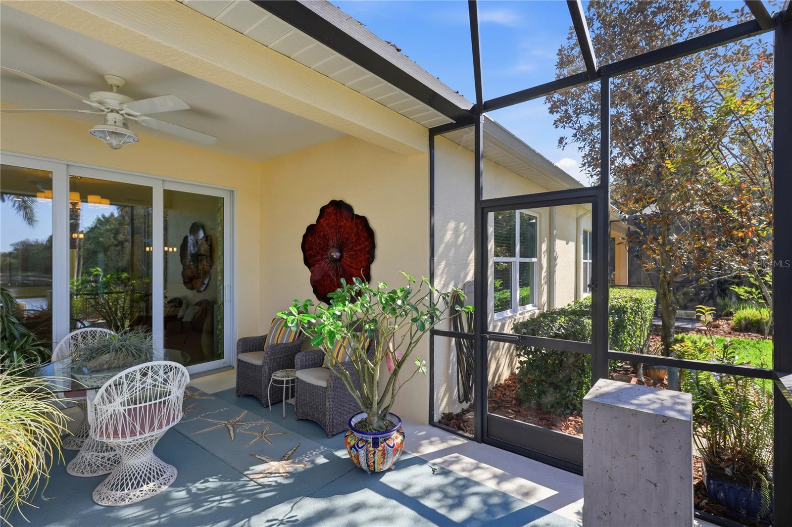Introducing this beautifully upgraded villa in Eagle Trace, set on a quiet lot with long water views and a preserve positioned to the left side for enhanced privacy. As you enter, tall ceilings and the impact windows throughout create a bright, open feel throughout the home. To the right, a thoughtfully designed den features built-in cabinetry and a desk area featuring a drop-down extension providing additional workspace. Across the hall, the guest bedroom and bath offer a comfortable and private space for family and friends that come to visit. Beyond the entry, the home opens into the spacious kitchen and great room. The kitchen includes a spacious island, an under-counter water filtration system, and a dual-fuel gas range with a double oven, creating a functional and inviting space for everyday cooking or for entertaining. South American mahogany interior doors throughout the home add extra warmth and character, while custom closets in every room provide beautifully organized storage and a refined, custom-built feel. The primary suite is positioned at the rear of the villa featuring serene views of the water and preserve, offering a peaceful space at the end of the day to unwind. Energy-efficient improvements include radiant barriers and extra insulation in the attic and foam filled block walls, enhancing comfort year-round. The insulated impact-rated garage door provides peace of mind and protection while the additional storage and cabinetry are a huge bonus. Outside, the extended lanai takes full advantage of the home's premium setting, offering a generous outdoor living space with tranquil water views and a quiet natural backdrop. Located within the gated community of Eagle Trace, residents enjoy maintenance-free landscaping along with access to a resort style pool and spa, tennis/pickle ball court, dog parks, and a playground. Thoughtfully enhanced and ideally situated, this villa combines comfort, efficiency, and a desirable homesite within one of Lakewood Ranch's sought after communities.