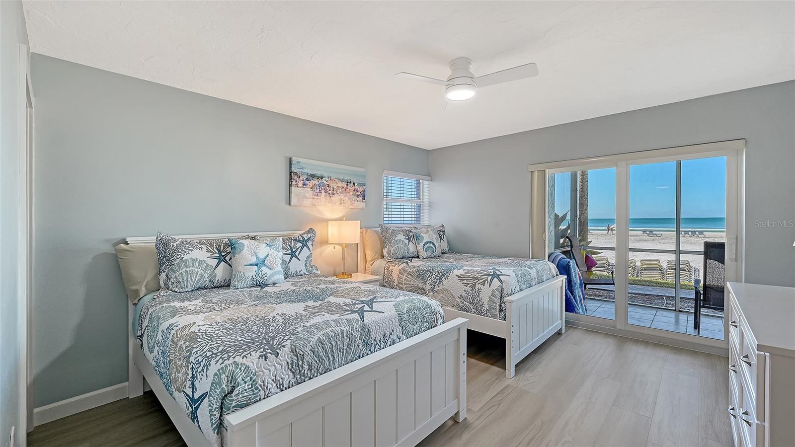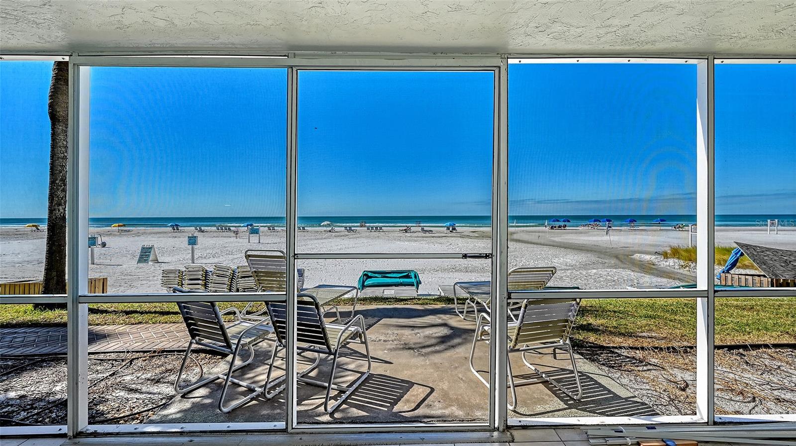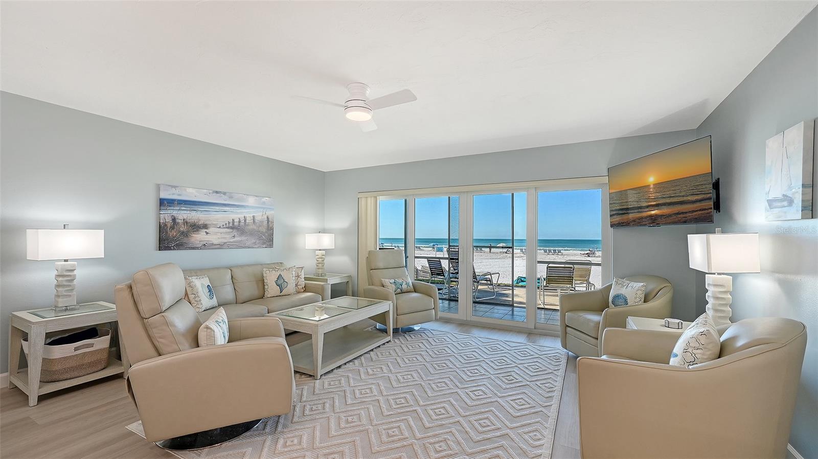 A truly exceptional and rarely available offering in Crescent Arms! This expansive 1,009 sq. ft. ground-floor residence - the largest 2-bedroom, 2-bath floor plan in the community - boasts an unrivaled direct Gulf-front location with an effortless walk-out to the iconic quartz sands of Siesta Key Beach. Completely renovated from top to bottom, this coastal masterpiece features hurricane-impact windows and sliders that frame uninterrupted beach and water vistas. An oversized screened terrace invites you to savor gentle Gulf breezes, glowing sunsets, and the soothing sound of the shoreline. All new, beautifully turnkey furnished and impeccably outfitted with linens, towels, housewares, all-new appliances - including a new HVAC system , and durable luxury vinyl flooring throughout, this residence is truly move-in and rental ready. Profitable rental income potential is enhanced by Crescent Arms' flexible rental program and the convenience of an on-site rental manager. Additional highlights include assigned covered parking and desirable community amenities such as a heated pool, beach lounge chairs, and an outdoor grilling area. Perfectly positioned just minutes from Siesta Key Village's shopping, dining, and vibrant nightlife, this pristine beachfront retreat offers the ultimate blend of luxury, convenience, and coastal living - your ideal island getaway awaits.