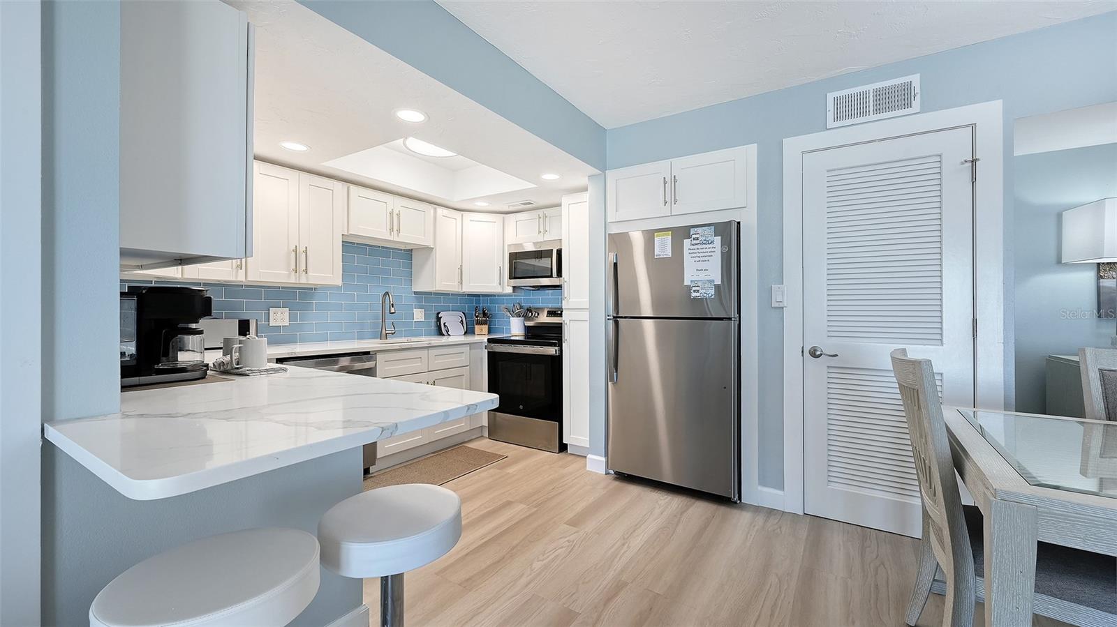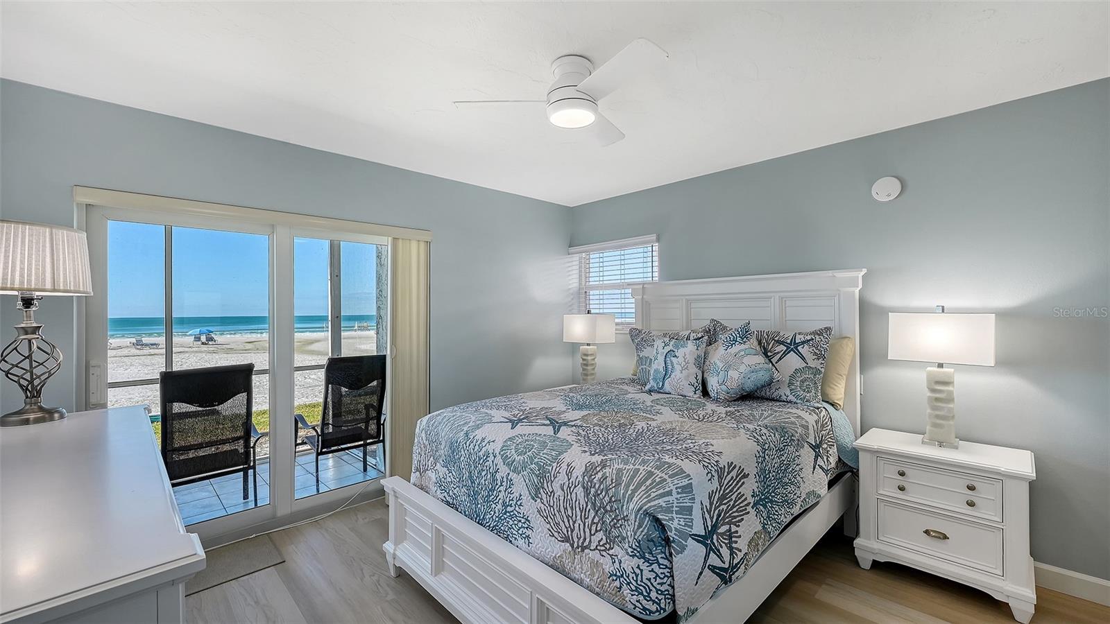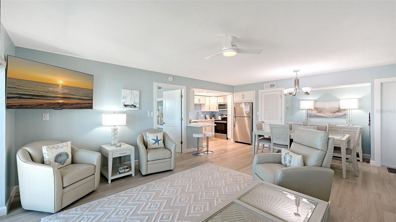 A truly exceptional and rarely available offering in Crescent Arms! This expansive 1,009 sq. ft. ground-floor residence - the largest 2-bedroom, 2-bath floor plan in the community - boasts an unrivaled direct Gulf-front location with an effortless walk-out to the iconic quartz sands of Siesta Key Beach. Completely renovated from top to bottom, this coastal masterpiece features hurricane-impact windows and sliders that frame uninterrupted beach and water vistas. An oversized screened terrace invites you to savor gentle Gulf breezes, glowing sunsets, and the soothing sound of the shoreline. All new, beautifully turnkey furnished and impeccably outfitted with linens, towels, housewares, all-new appliances - including a new HVAC system , and durable luxury vinyl flooring throughout, this residence is truly move-in and rental ready. Profitable rental income potential is enhanced by Crescent Arms' flexible rental program and the convenience of an on-site rental manager. Additional highlights include assigned covered parking and desirable community amenities such as a heated pool, beach lounge chairs, and an outdoor grilling area. Perfectly positioned just minutes from Siesta Key Village's shopping, dining, and vibrant nightlife, this pristine beachfront retreat offers the ultimate blend of luxury, convenience, and coastal living - your ideal island getaway awaits.