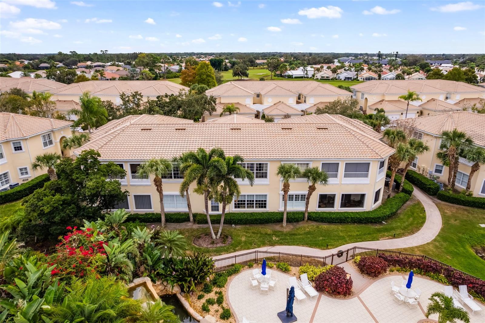 Currently the most affordable option available in the Triano community, this first-floor residence offers maintenance-free living, resort-style amenities, and an active lifestyle in one of Venice's most desirable locations. Being sold fully turnkey, the home allows you to move right in and begin enjoying the Florida lifestyle immediately. Ideally positioned to overlook the community's resort-style pool, clubhouse, and fitness center, it provides peaceful views and effortless access with no stairs to navigate.Inside, the home features a bright, open layout designed for everyday comfort, with furnishings already in place for a seamless transition. Recent updates provide added peace of mind, including an A/C system replaced in 2019, new carpet installed in 2024, and major community improvements completed in 2024 such as a new tile roof, new gutters, and fresh exterior paint. These updates make the home truly move-in ready.The living and dining areas flow naturally into the kitchen, creating an inviting space for both relaxing and entertaining. Large windows fill the home with natural light and highlight the beautifully landscaped surroundings. The primary suite offers generous space, a walk-in closet, and a private ensuite bath, while the guest bedroom is equally comfortable and well appointed. The combination of first-floor living and a turnkey offering makes this residence ideal for full-time living, seasonal use, or a lock-and-leave lifestyle.Triano is an intimate community of just 108 condominiums, known for its lush landscaping, garden walkways with waterfalls, and serene atmosphere. A brick paver pathway leads to the clubhouse and heated resort-style pool, framed by a peaceful lake and cascading waterfalls. Residents also enjoy a fully equipped fitness center and welcoming clubhouse. Adding even more value, condo fees have recently been reduced to just $575 per month, with no CDD and true maintenance-free living.The location is exceptional, with nearby access to Waterford Golf Club and Capri Isles Golf Club, Venice's beautiful beaches, shopping, dining, and the historic Island of Venice. Sarasota Memorial Hospital's Venice campus is less than two miles away, and Downtown Wellen Park--with its restaurants, events, farmers markets, and Atlanta Braves spring training stadium--is just a short drive.With its first-floor convenience, turnkey furnishings, recent updates, reduced condo fees, and unbeatable value within Triano, this home presents an outstanding opportunity. Contact us today to schedule your private showing and see this exceptional property in person.