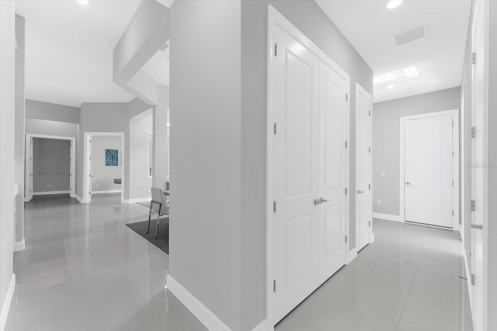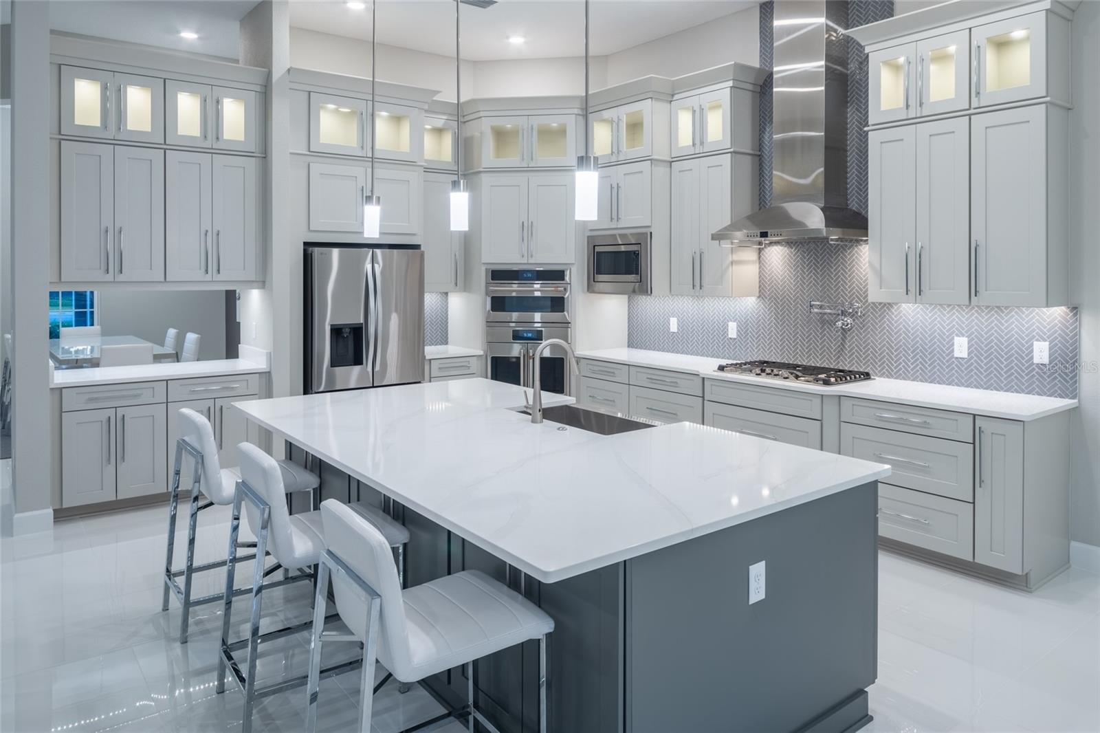 The West Indies Beacon floor plan in Cassia at Skye Ranch greets you with a bright open foyer that immediately sets the tone for this executive home. Elegant 13 foot soaring tray ceilings carry through the main living areas and create a feeling of space, sophistication, and natural light. The formal dining room sits just off the entry and flows naturally into the gathering room, where a custom designer feature wall with an electric fireplace adds a calming focal point. Large pocket sliding glass doors frame views of the expansive covered lanai and the private nature preserve beyond, offering access to over twenty five miles of walking trails and creating a setting that feels quiet, serene, and beautifully connected to nature. The kitchen is a true showpiece with Harbor solid wood cabinetry, soft-close doors, stacked glass cabinets above with gentle accent lighting, and a large Boulder toned quartz island that brings the entire space together. Under cabinet lighting, a Cafe gas appliance package, monogram vent hood, an over-range fill faucet, and thoughtful layout create a chef level workspace that is both inviting and functional. An illuminated custom built-in cabinet with a wide pass-through sits between the dining room and kitchen and adds both beauty and convenience to the flow of the home. The breakfast nook enjoys serene backyard views, and the elegant porcelain flooring enhances the clean modern style of the home. Just off the kitchen and laundry area, a thoughtfully designed built-in drop zone features upper cabinetry and bench seating creating an ideal everyday landing space for organization and ease. Eight foot solid core doors elevate every room. The primary suite is tucked away for comfort and privacy. Pocket doors lead to two walk-in closets, and the spa inspired bath features double sinks, a frameless glass shower, and a handheld shower on a slide bar. Each guest bedroom includes its own private en suite, and a separate half bath is ideal for visitors. The study sits at the front of the home behind refined 12 panel glass French doors and offers a quiet retreat with natural light throughout the day. Outdoor living shines with a large covered extended lanai that is professionally prepared for a future outdoor kitchen. The home is also designed with utilities in place for a future pool and spa. Additional upgrades include core filled block insulation, tankless hot water heater, seamless gutters along the rear and side of the home, and an extended paver driveway, an insulated three car garage with keyless entry pad, attic stairs, and a side entry door. Living in Skye Ranch offers a true sense of community with The Hub featuring a resort style pool, junior Olympic lap pool, splash pad, fitness center, movement studio, indoor and outdoor courts, playgrounds, open fields, and miles of nature trails that wind through preserved Florida landscape. The neighborhood also includes a brand new elementary school, Turner Park, and wide walkable streets. Cassia provides easy access to I 75 and is positioned just minutes from the dining, shopping, and cultural experiences of Sarasota. Residents also enjoy a direct connection to Siesta Key making this location ideal for anyone who wants both everyday convenience and the best of coastal living. The setting and natural light blend elegance, exceptional upgrades, and a peaceful preserve setting in one of Sarasota's most desirable communities. Walk to the New Skye Ranch elementary school!
