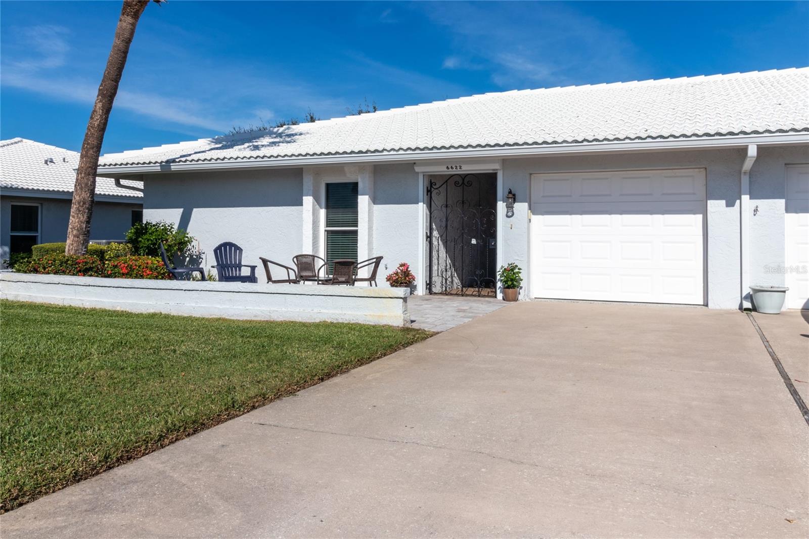This charming 2-bedroom, 2-bathroom TURNKEY furnished condo welcomes small dogs in its section and features an eat-in kitchen, dining room, living room, and a spacious Florida room with two sleeper sofas to sleep 6 comfortably. Extremely clean and well cared for, shows pride of ownership. Recent upgrades include new hurricane impact windows, a garage door, hurricane gate, a 2019 AC unit, and a new roof. The lanai boasts motorized shades, while the property is equipped with whole-house gutters and a large front paver patio. The garage floor has a sleek marelite finish, adding to the appeal. Residents can enjoy a heated pool and a vibrant community with activities like shuffleboard, Mah-jongg, and Thursday happy hour. Priced to sell, this condo is just 10 minutes from the beautiful beaches of Anna Maria Island and is being sold as-is with the right to inspect.