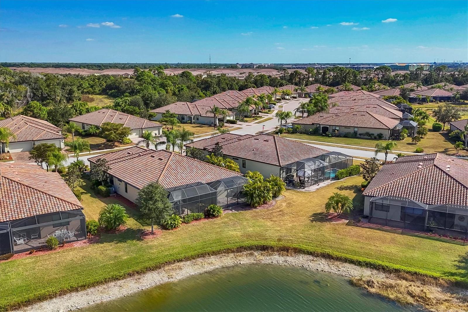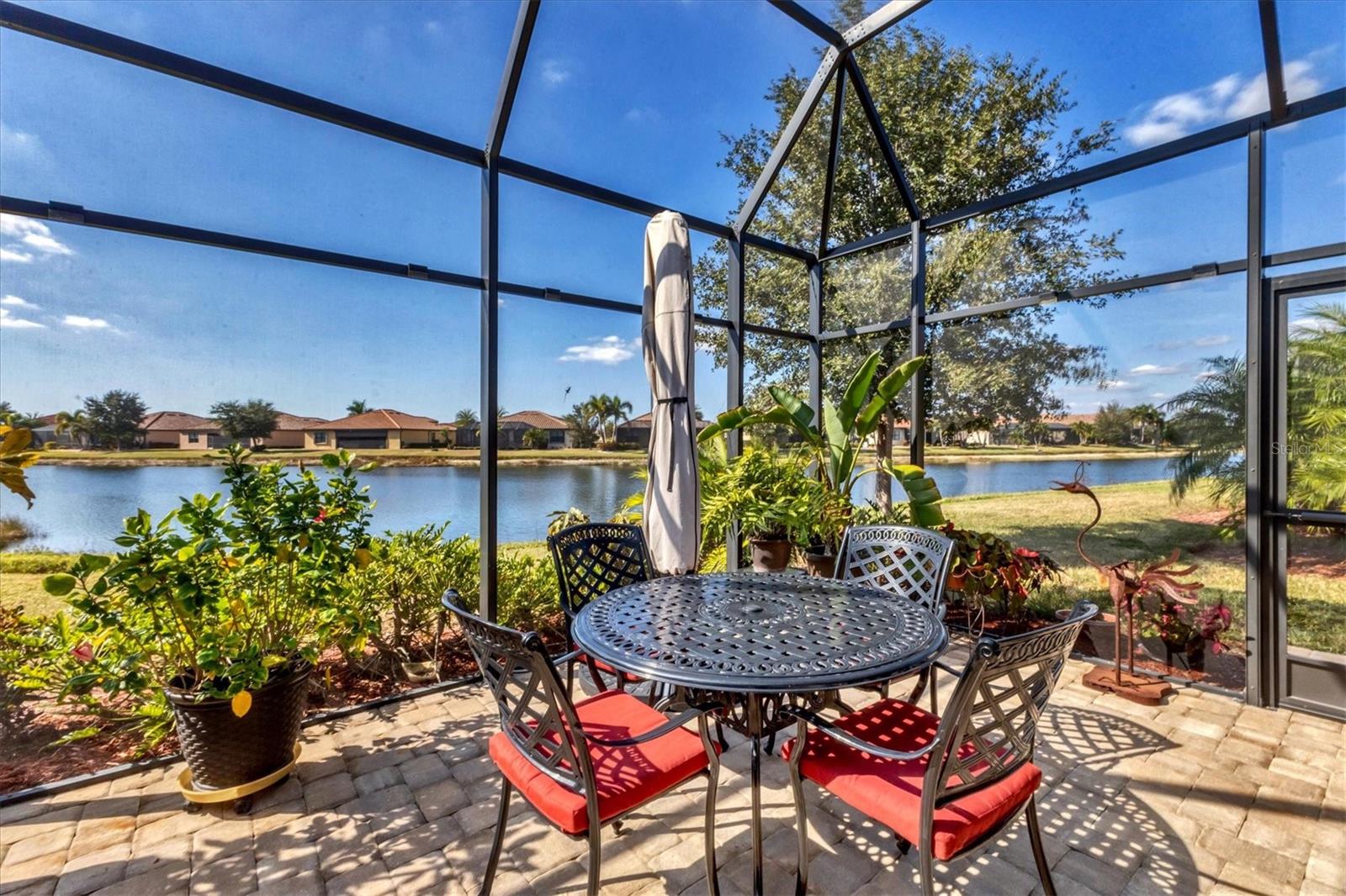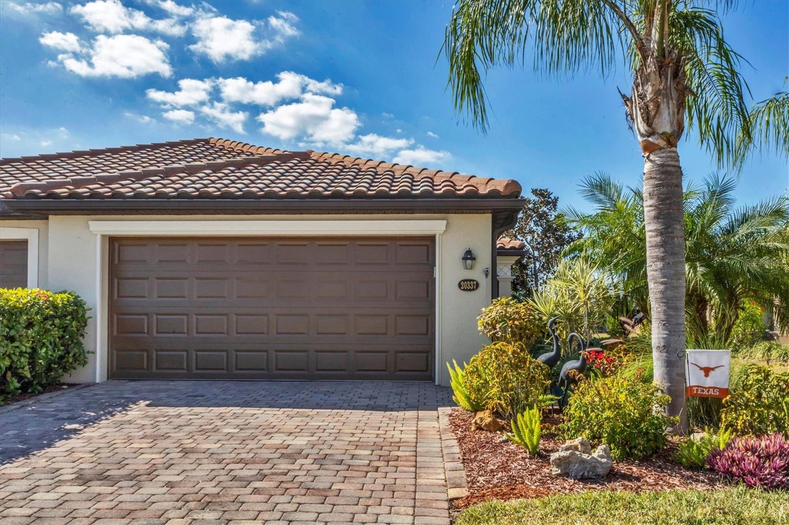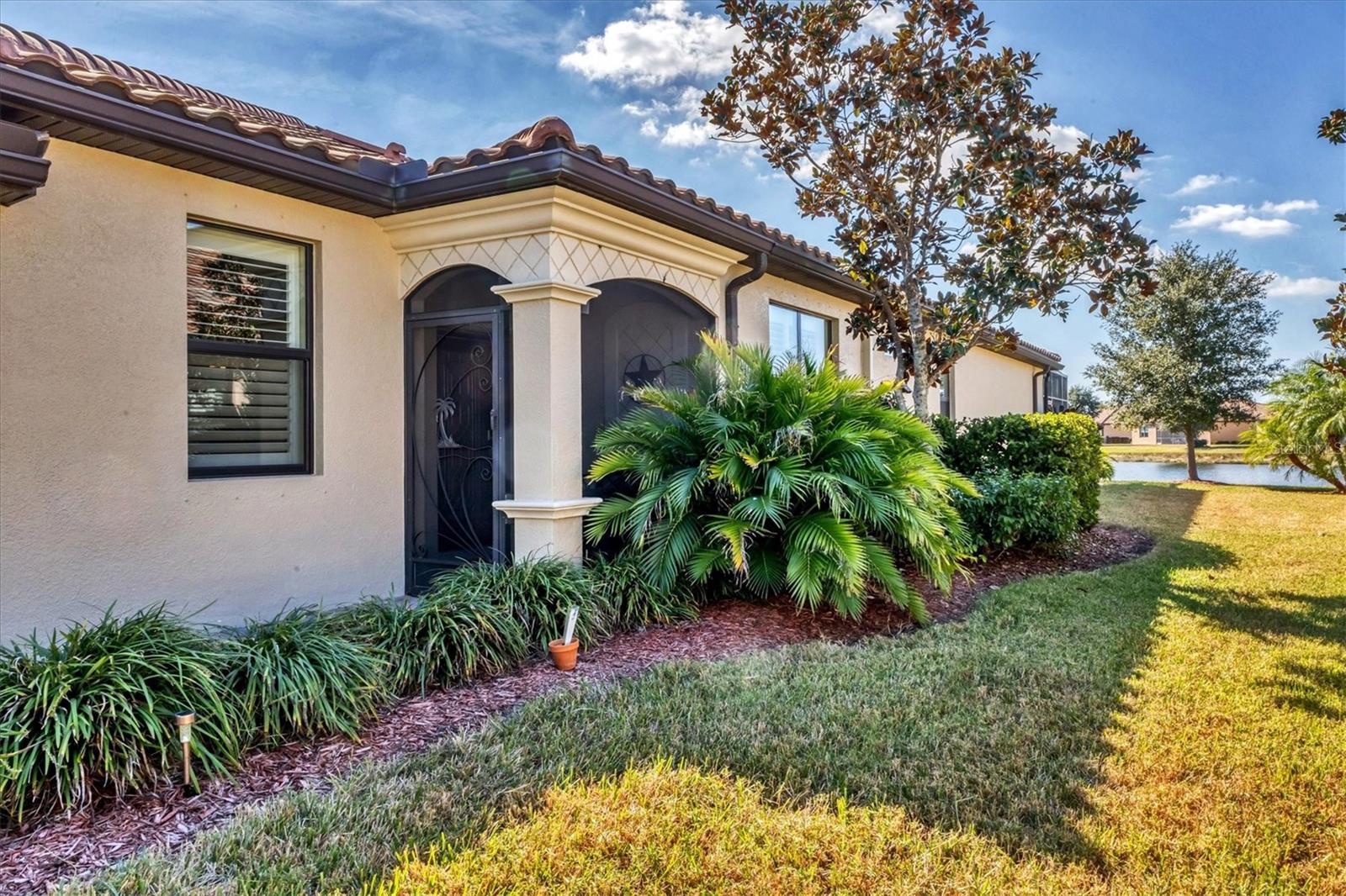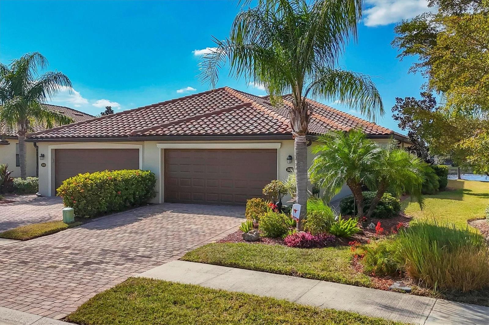 BEAUTIFULLY FINISHED VILLA with GORGEOUS WATER VIEWS and RESORT STYLE LIVING IN GRAN PARADISO! You will love the OPEN CONCEPT GREAT ROOM DESIGN incorporating dining area and sliders to your expansive outdoor living space overlooking sparkling water views, great for entertaining or simply relaxing. Enjoy spectacular sunsets and panoramic water views from your oversize screened paver lanai with privacy screen and motorized storm screen! Stunning island style finishes include Brazilian Chestnut Kiowa wood and stylish diagonal tile flooring, 9' ceilings, crown molding, granite countertops, plantation shutters, upgraded lights and fans and comfort height Toto toilets. Kitchen features wood cabinets with crown molding, granite counters, breakfast bar for casual dining, under cabinet lighting, and fingerprint resistant stainless steel appliances include French Door refrigerator, dishwasher, smooth top 5 burner range with convection oven and air fryer. Imagine waking up to serene water views from the owner's suite with French doors, dual built-in closets, dual bowl vanity, separate soaking tub and tiled shower. The study with French doors provides versatile space to suit your needs. Desirable split bedroom and bath design features 2nd bedroom with built-in closet, hall bath and linen closet, ideal for family or guests. Convenient interior laundry room includes cabinets above Whirlpool front load washer and dryer on pedestal bases. Gorgeous landscaping, screened front entrance, tile roof, paver driveway and walkway, newer hot water heater, whole house gutters, storm shutters and Kevlar storm screen on lanai complete this wonderful home. Private and gated with maintenance free landscaping, you'll have abundant time for activities at the resident Clubhouse with Resort Style Pool and Spa, State of the Art Fitness Center, tennis and pickleball courts and a variety of clubs and classes where you can socialize, unwind or get fit! Premiere location in Wellen Park you are minutes to vibrant shopping and dining, events, recreational pursuits, Atlanta Braves spring training at Cooltoday Park and our gorgeous Gulf Coast Beaches!