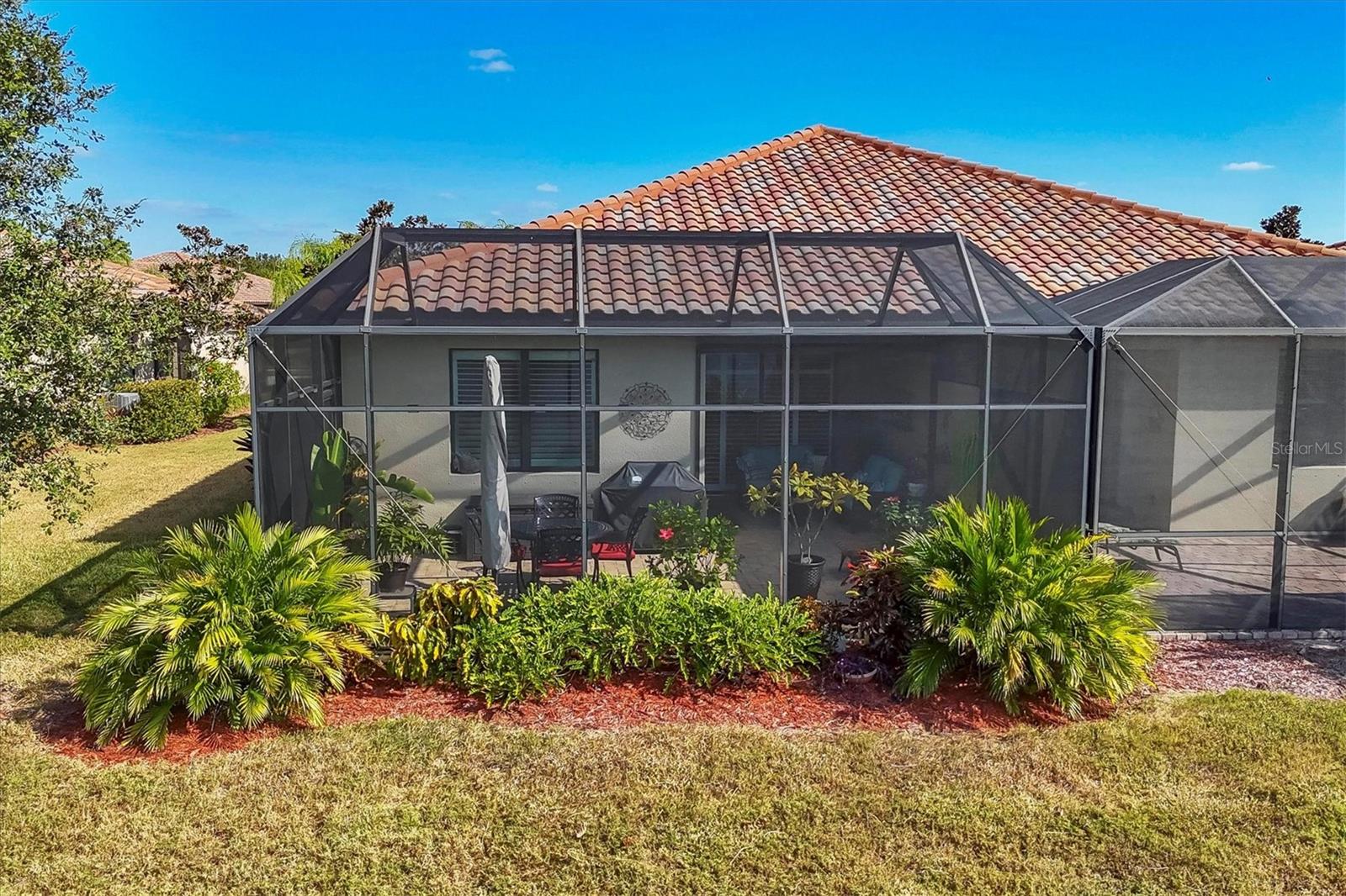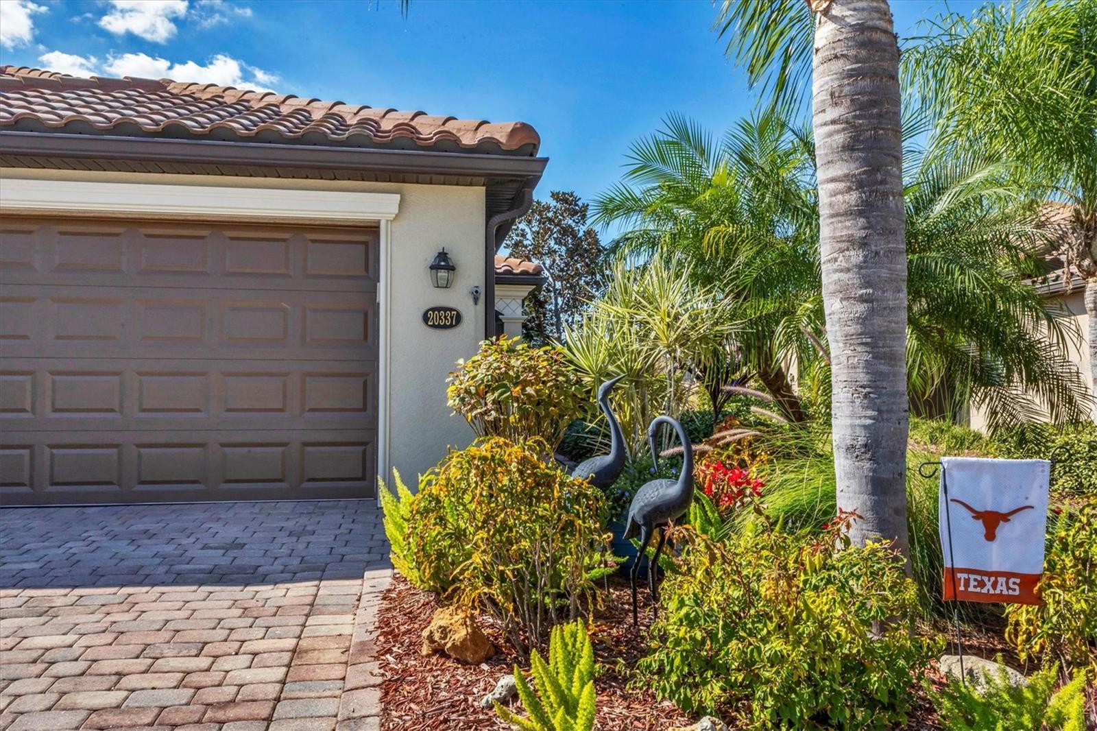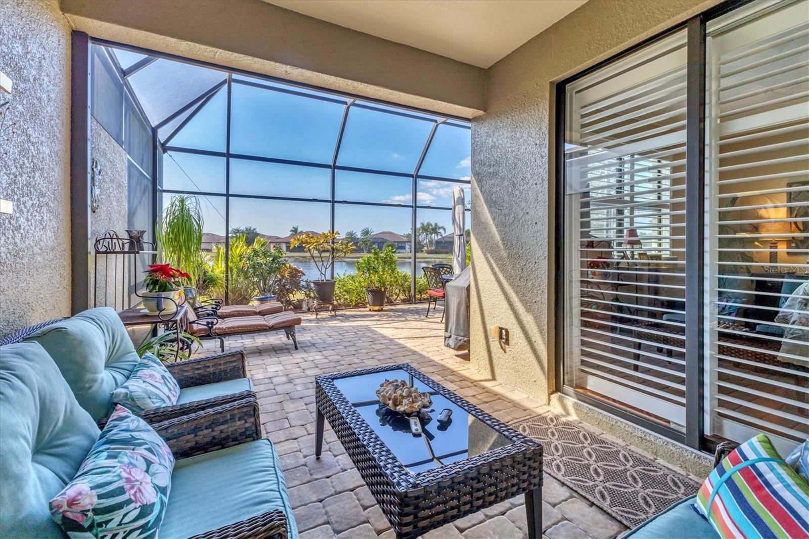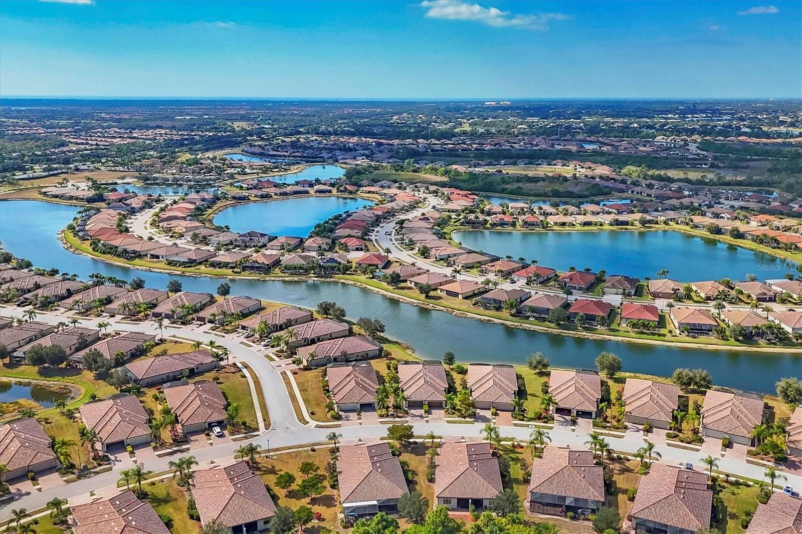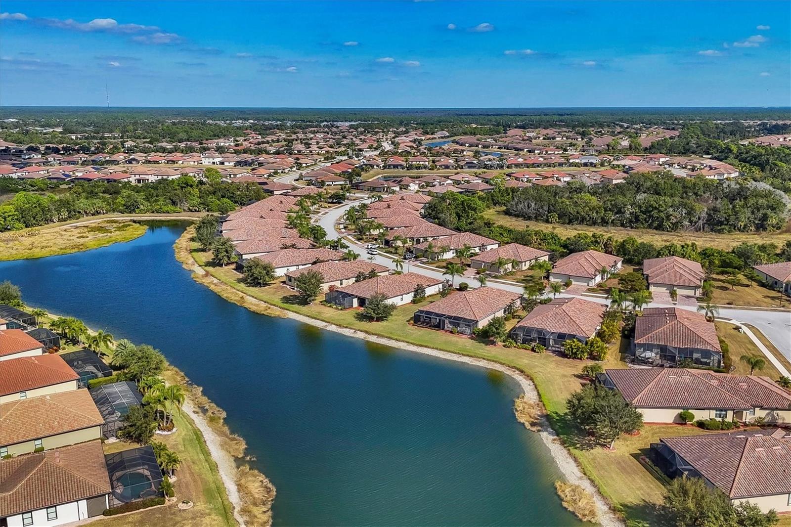 BEAUTIFULLY FINISHED VILLA with GORGEOUS WATER VIEWS and RESORT STYLE LIVING IN GRAN PARADISO! You will love the OPEN CONCEPT GREAT ROOM DESIGN incorporating dining area and sliders to your expansive outdoor living space overlooking sparkling water views, great for entertaining or simply relaxing. Enjoy spectacular sunsets and panoramic water views from your oversize screened paver lanai with privacy screen and motorized storm screen! Stunning island style finishes include Brazilian Chestnut Kiowa wood and stylish diagonal tile flooring, 9' ceilings, crown molding, granite countertops, plantation shutters, upgraded lights and fans and comfort height Toto toilets. Kitchen features wood cabinets with crown molding, granite counters, breakfast bar for casual dining, under cabinet lighting, and fingerprint resistant stainless steel appliances include French Door refrigerator, dishwasher, smooth top 5 burner range with convection oven and air fryer. Imagine waking up to serene water views from the owner's suite with French doors, dual built-in closets, dual bowl vanity, separate soaking tub and tiled shower. The study with French doors provides versatile space to suit your needs. Desirable split bedroom and bath design features 2nd bedroom with built-in closet, hall bath and linen closet, ideal for family or guests. Convenient interior laundry room includes cabinets above Whirlpool front load washer and dryer on pedestal bases. Gorgeous landscaping, screened front entrance, tile roof, paver driveway and walkway, newer hot water heater, whole house gutters, storm shutters and Kevlar storm screen on lanai complete this wonderful home. Private and gated with maintenance free landscaping, you'll have abundant time for activities at the resident Clubhouse with Resort Style Pool and Spa, State of the Art Fitness Center, tennis and pickleball courts and a variety of clubs and classes where you can socialize, unwind or get fit! Premiere location in Wellen Park you are minutes to vibrant shopping and dining, events, recreational pursuits, Atlanta Braves spring training at Cooltoday Park and our gorgeous Gulf Coast Beaches!