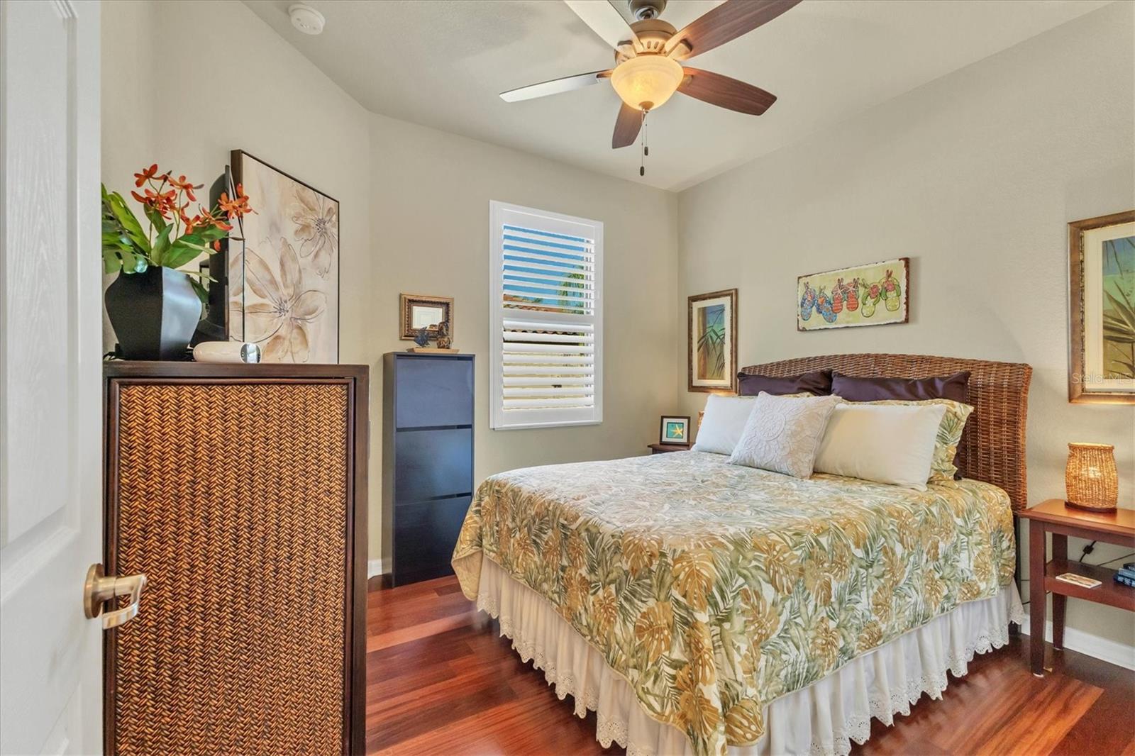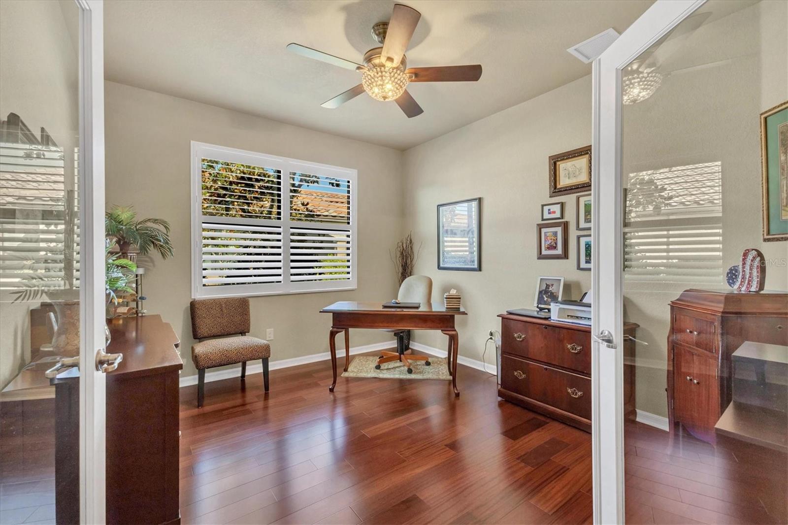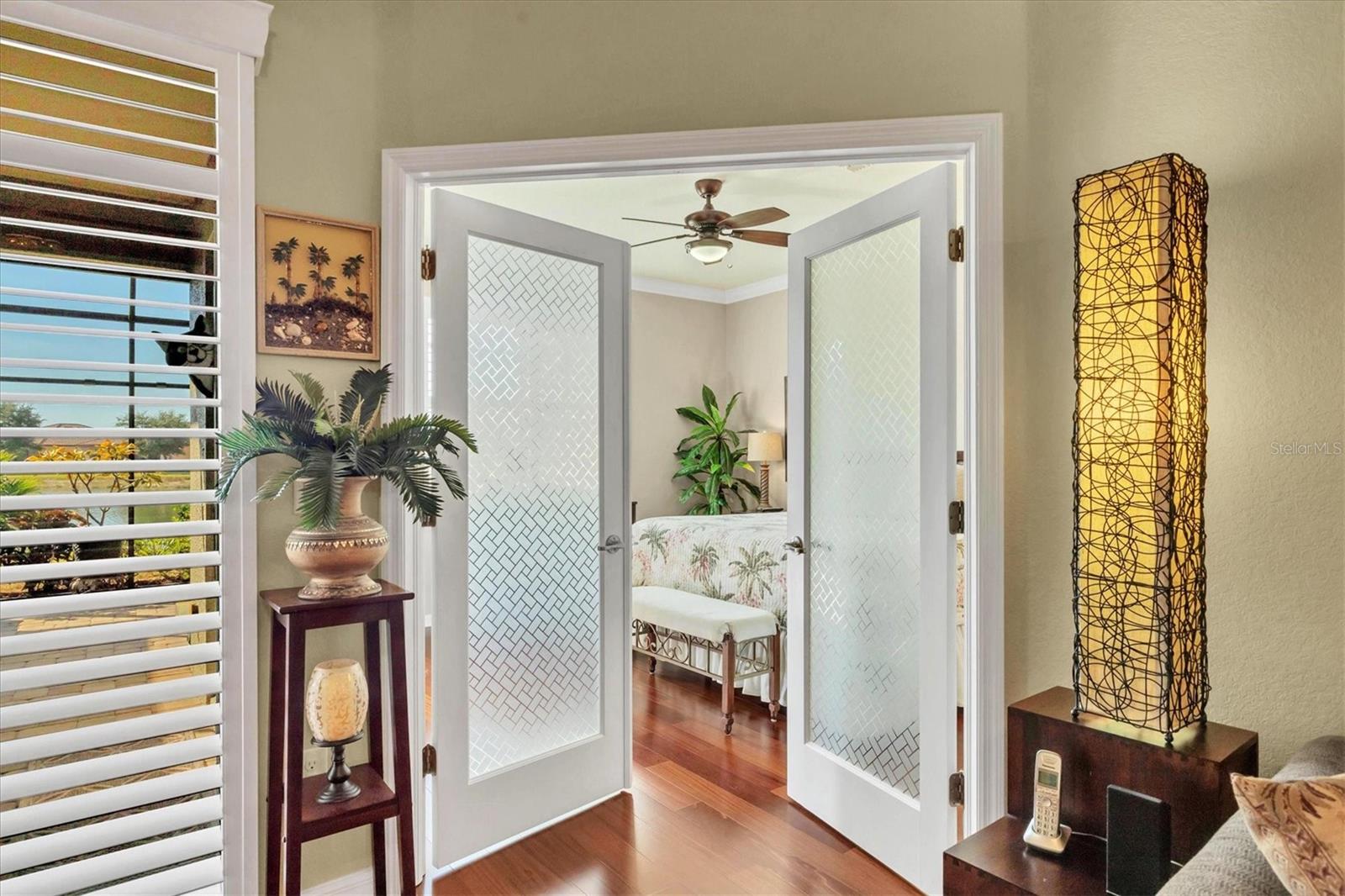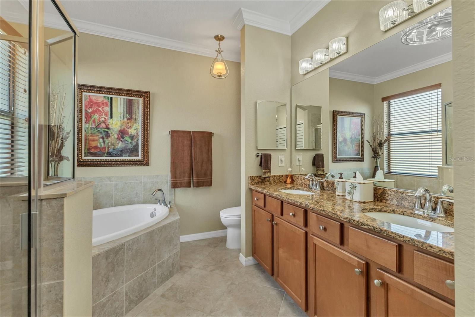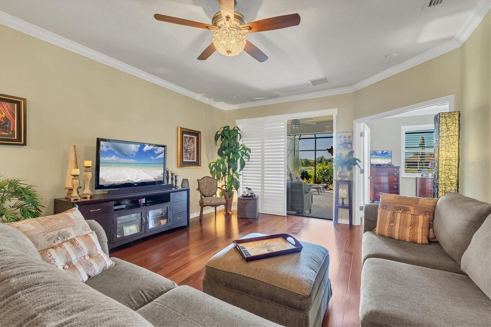 BEAUTIFULLY FINISHED VILLA with GORGEOUS WATER VIEWS and RESORT STYLE LIVING IN GRAN PARADISO! You will love the OPEN CONCEPT GREAT ROOM DESIGN incorporating dining area and sliders to your expansive outdoor living space overlooking sparkling water views, great for entertaining or simply relaxing. Enjoy spectacular sunsets and panoramic water views from your oversize screened paver lanai with privacy screen and motorized storm screen! Stunning island style finishes include Brazilian Chestnut Kiowa wood and stylish diagonal tile flooring, 9' ceilings, crown molding, granite countertops, plantation shutters, upgraded lights and fans and comfort height Toto toilets. Kitchen features wood cabinets with crown molding, granite counters, breakfast bar for casual dining, under cabinet lighting, and fingerprint resistant stainless steel appliances include French Door refrigerator, dishwasher, smooth top 5 burner range with convection oven and air fryer. Imagine waking up to serene water views from the owner's suite with French doors, dual built-in closets, dual bowl vanity, separate soaking tub and tiled shower. The study with French doors provides versatile space to suit your needs. Desirable split bedroom and bath design features 2nd bedroom with built-in closet, hall bath and linen closet, ideal for family or guests. Convenient interior laundry room includes cabinets above Whirlpool front load washer and dryer on pedestal bases. Gorgeous landscaping, screened front entrance, tile roof, paver driveway and walkway, newer hot water heater, whole house gutters, storm shutters and Kevlar storm screen on lanai complete this wonderful home. Private and gated with maintenance free landscaping, you'll have abundant time for activities at the resident Clubhouse with Resort Style Pool and Spa, State of the Art Fitness Center, tennis and pickleball courts and a variety of clubs and classes where you can socialize, unwind or get fit! Premiere location in Wellen Park you are minutes to vibrant shopping and dining, events, recreational pursuits, Atlanta Braves spring training at Cooltoday Park and our gorgeous Gulf Coast Beaches!