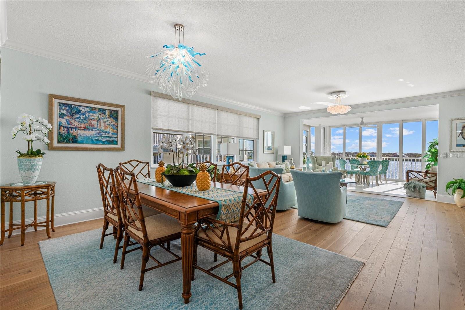 Stunning 3-bedroom, 3-bath residence on the 4th floor of Dolphin Bay, offering spectacular wide-water views of the Intracoastal. This end-unit condo lives like a single-family home with its open, spacious layout, light and bright floor plan, and beautifully curated coastal design--a true retreat that blends comfort, style, and everyday livability. The heart of the home is the impressive gourmet chef's kitchen, featuring Thermador and Sub-Zero appliances, a wine fridge, expansive center island, abundant storage, and a spacious breakfast nook. Wide plank wood floors flow through the main living areas, kitchen, and all bedrooms, while the sunroom/Florida room showcases large-format tile and floor-to-ceiling windows and doors that flood the space with natural light. As an end unit, the living room features oversized windows, enhancing the airy, coastal feel, and a beautiful electric fireplace that creates a cozy focal point. Each of the three bedrooms offer the privacy and convenience of an en-suite bathroom. The beautiful primary suite boasts expansive Intracoastal views, a large walk-in closet, and a spa-inspired bath with split vanities, dual sinks, an oversized walk-in glass shower, and a private water closet. Additional features include hurricane-rated impact windows and sliders throughout, a spacious front patio, and a private one-car garage under the building. Dolphin Bay amenities elevate the lifestyle with premium Har-Tru clay tennis courts, fitness center, charming clubhouse, pool, spa, and a day dock for boating, fishing, and kayak access-- all within an intimate, pet-friendly community of only 50 units. Enjoy effortless trolley access to Siesta Key Beach and the Village, where boutique shopping, vibrant dining, and local entertainment are readily available. An elevated waterfront retreat where every day begins and ends with views, sunlight, and the easy rhythm of coastal living. This unit can be sold with Hyatt Club ownership, which provides private beach access and private parking at Siesta Key Beach Residences.