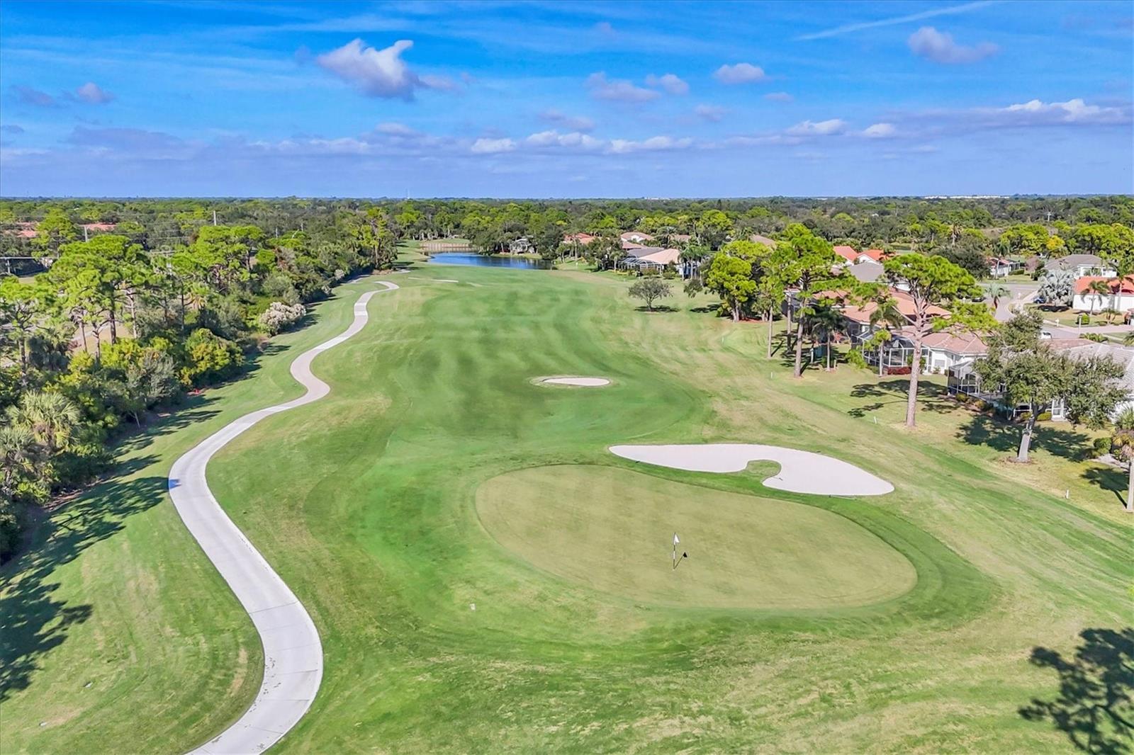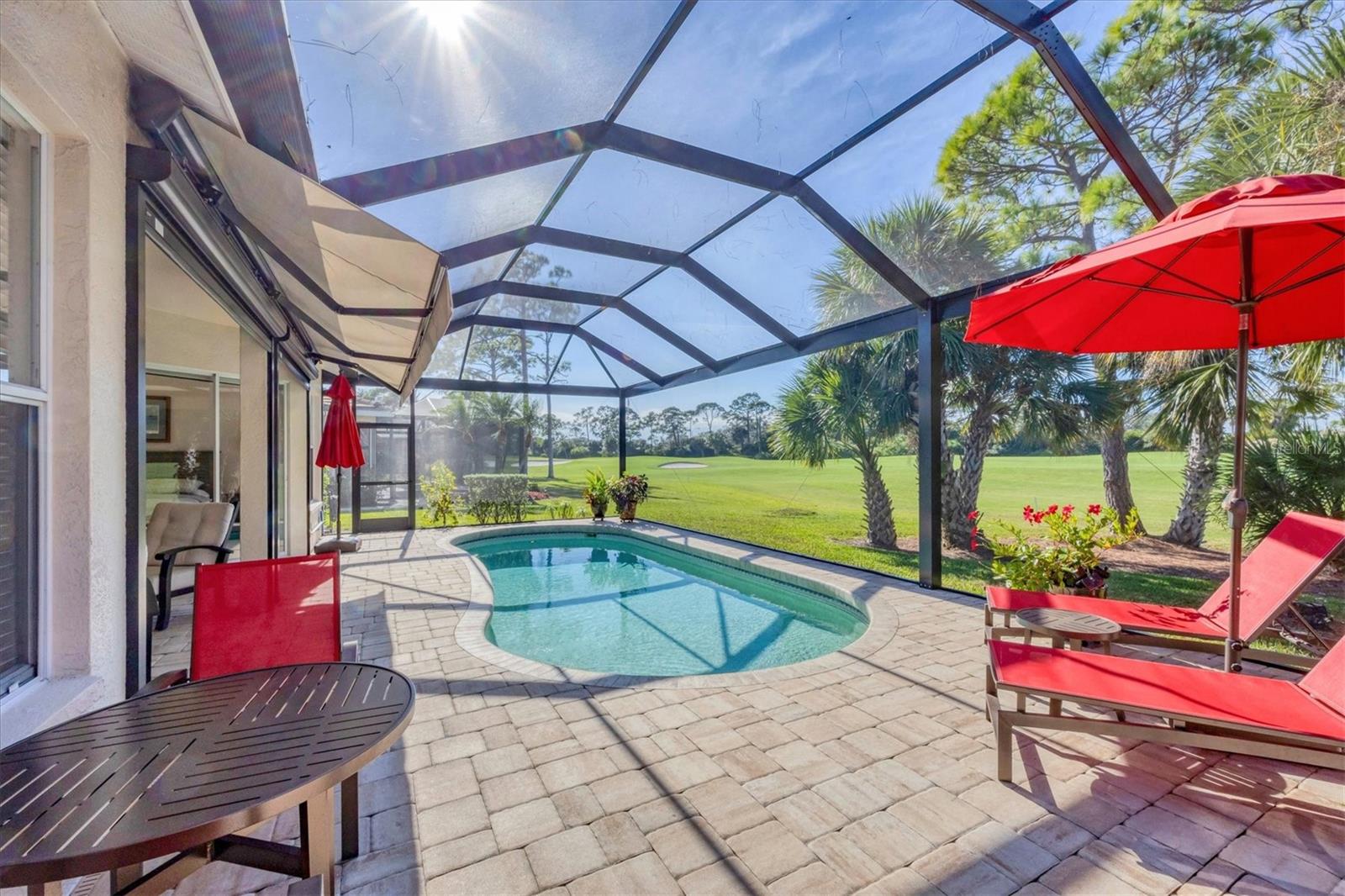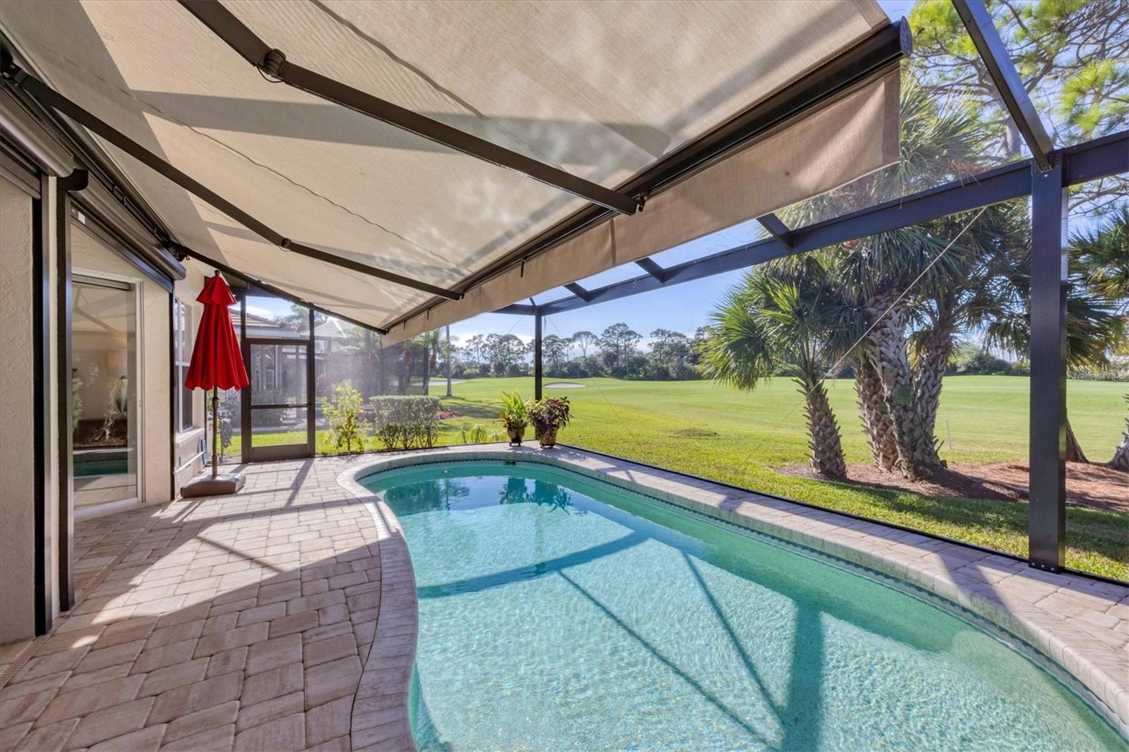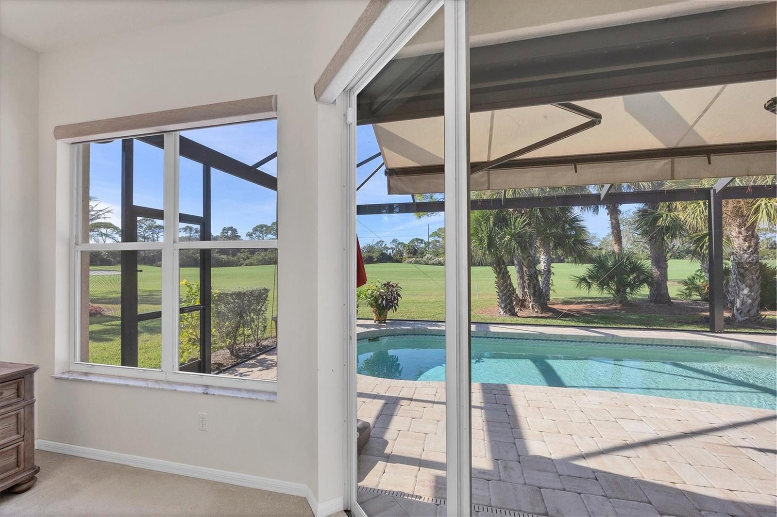 IMPRESSIVE 3 bedroom, 2 bath, with DEN and heated saltwater POOL home in sought after Stoneybrook Golf and Country Club! This one has it all.. nestled on the 12th hole with expansive views and updates galore! This is a true open floor plan with kitchen inclusive to the wide open living space adorned with crown molding, an extended eat on bar, granite counters, new soft close cabinetry, closet pantry with pull out shelves, a dinette with large windows, formal dining space and multiple glass sliding doors out to lanai/pool area. Loads of natural light! The premier outside entertaining area has been extended with NEW pavers and storm rated panoramic screens and lanai cage, as well as an electric awning to add shade.. your prime view is jaw dropping of the pristine greens and sunset views! Primary suite enjoys updated ensuite bath with spa like soaking tub, granite counters with dual sinks, and tiled walk-in shower.. 2nd full bath has been updated with a raised stone vanity and tiled shower.. A desirable den has double french doors for privacy and a murphy bed for more guests. Laundry room has an added utility sink, an additional pantry with pull out shelves and lots of cabinet space. 2 car garage has an updated epoxy floor and plenty of room for 2 cars and all your golf and beach gear! Driveway and entryway have been professionally landscaped and are pavered as well. More updates include recessed lighting, new remote controlled fans, new blinds/shades, electric hurricane screen, AC 2021, water heater 2024, garage door 2020, pool pump 2025, well pump for irrigation 2025, TILE ROOF 2022!Stoneybrook is a gated and well established club in Palmer Ranch and boasts top amenities that include a new 18 hole golf course redesigned by Kipp Schultes and is said to be one of the best on the West Coast! Lighted Har-Tru tennis/pickleball courts, pro-shop, well-equipped fitness center, bocce court, putting greens, driving range, fitness studio, sharing library, additional heated pool/spa, full service restaurant/bar, meeting rooms, catering facility, outdoor dining patio, walking/biking trails, fishing, planned activities like yoga, mahjong, line dancing, and so much more! Stoneybrook Golf and Country Club is a prime location close to the Legacy Trail, shopping, Costco, restaurants and all Sarasota and Venice has to offer! WELCOME HOME to RESORT-STYLE LIVING at its BEST!