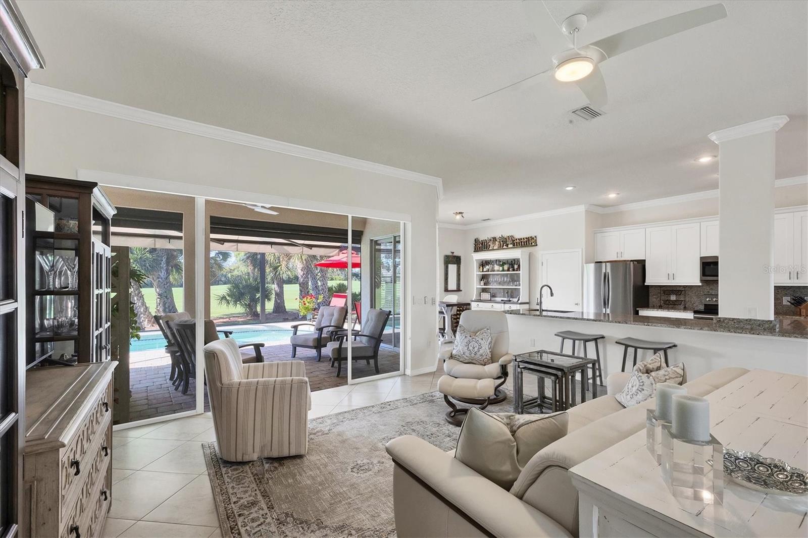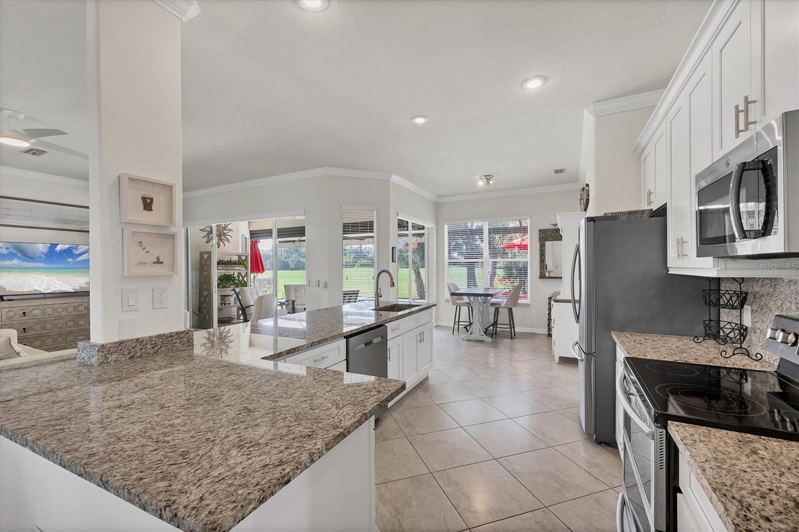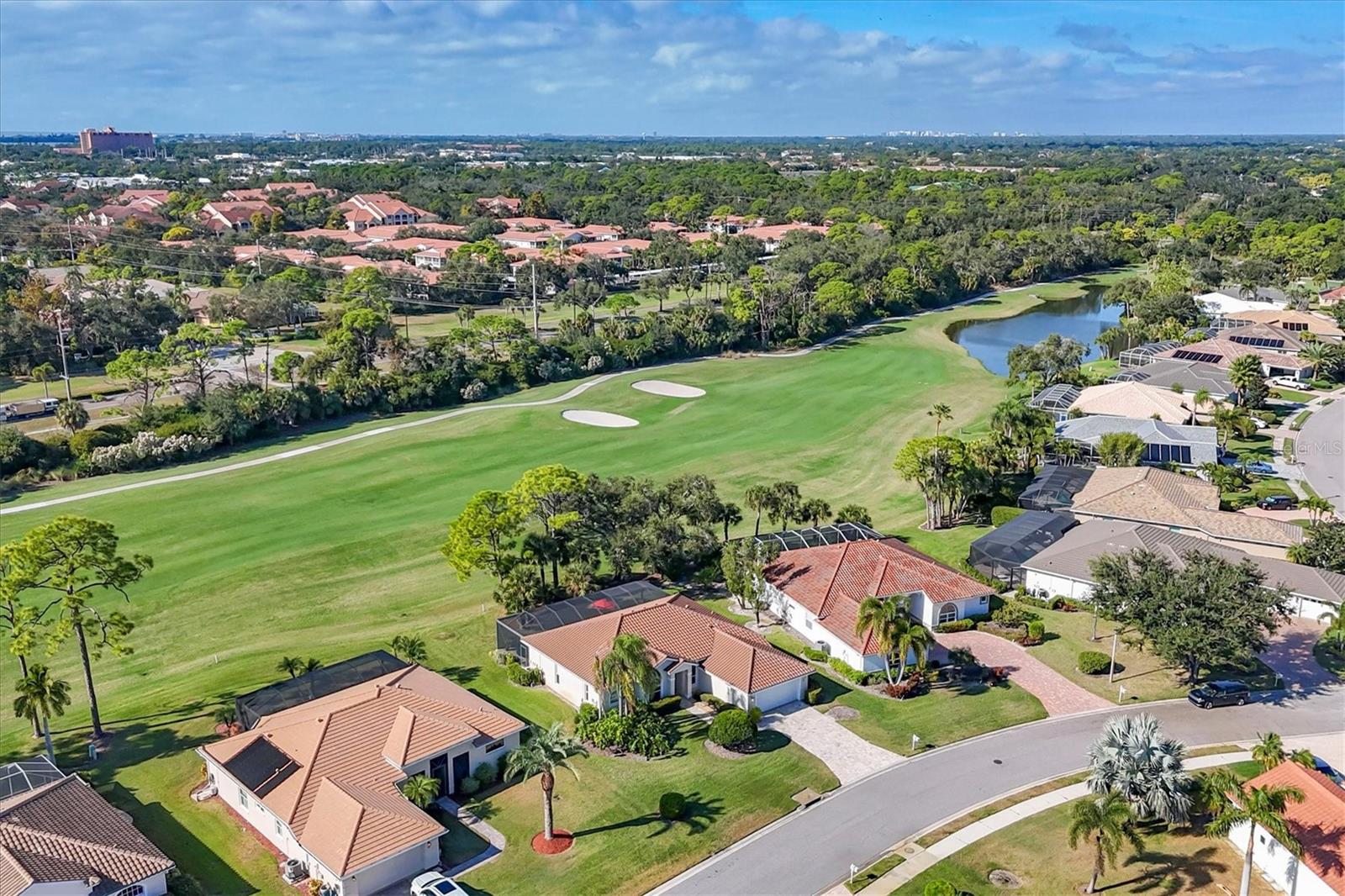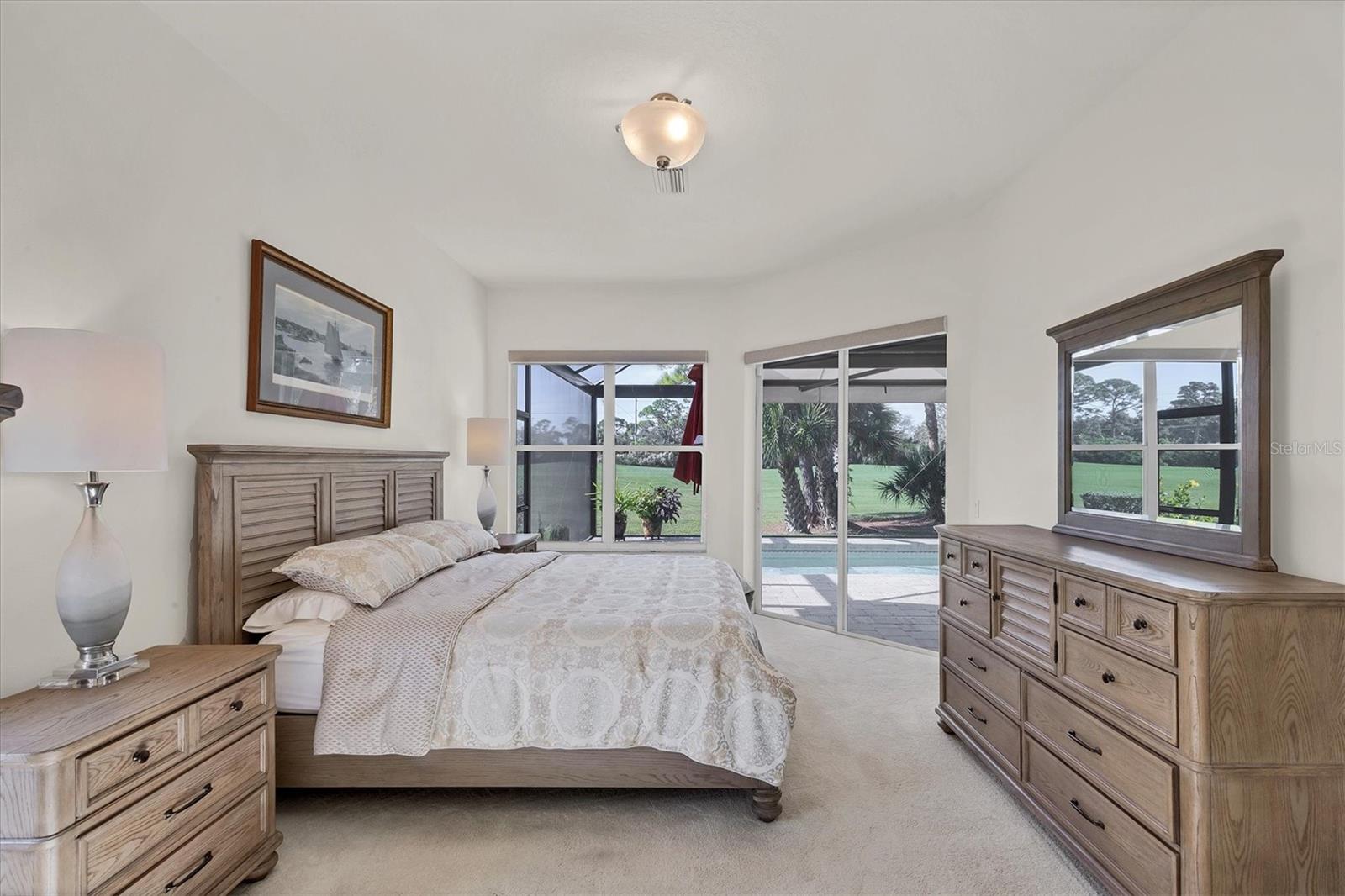 IMPRESSIVE 3 bedroom, 2 bath, with DEN and heated saltwater POOL home in sought after Stoneybrook Golf and Country Club! This one has it all.. nestled on the 12th hole with expansive views and updates galore! This is a true open floor plan with kitchen inclusive to the wide open living space adorned with crown molding, an extended eat on bar, granite counters, new soft close cabinetry, closet pantry with pull out shelves, a dinette with large windows, formal dining space and multiple glass sliding doors out to lanai/pool area. Loads of natural light! The premier outside entertaining area has been extended with NEW pavers and storm rated panoramic screens and lanai cage, as well as an electric awning to add shade.. your prime view is jaw dropping of the pristine greens and sunset views! Primary suite enjoys updated ensuite bath with spa like soaking tub, granite counters with dual sinks, and tiled walk-in shower.. 2nd full bath has been updated with a raised stone vanity and tiled shower.. A desirable den has double french doors for privacy and a murphy bed for more guests. Laundry room has an added utility sink, an additional pantry with pull out shelves and lots of cabinet space. 2 car garage has an updated epoxy floor and plenty of room for 2 cars and all your golf and beach gear! Driveway and entryway have been professionally landscaped and are pavered as well. More updates include recessed lighting, new remote controlled fans, new blinds/shades, electric hurricane screen, AC 2021, water heater 2024, garage door 2020, pool pump 2025, well pump for irrigation 2025, TILE ROOF 2022!Stoneybrook is a gated and well established club in Palmer Ranch and boasts top amenities that include a new 18 hole golf course redesigned by Kipp Schultes and is said to be one of the best on the West Coast! Lighted Har-Tru tennis/pickleball courts, pro-shop, well-equipped fitness center, bocce court, putting greens, driving range, fitness studio, sharing library, additional heated pool/spa, full service restaurant/bar, meeting rooms, catering facility, outdoor dining patio, walking/biking trails, fishing, planned activities like yoga, mahjong, line dancing, and so much more! Stoneybrook Golf and Country Club is a prime location close to the Legacy Trail, shopping, Costco, restaurants and all Sarasota and Venice has to offer! WELCOME HOME to RESORT-STYLE LIVING at its BEST!